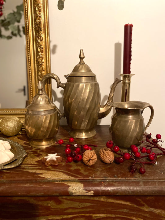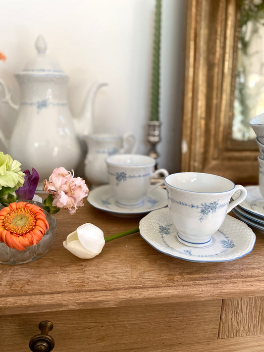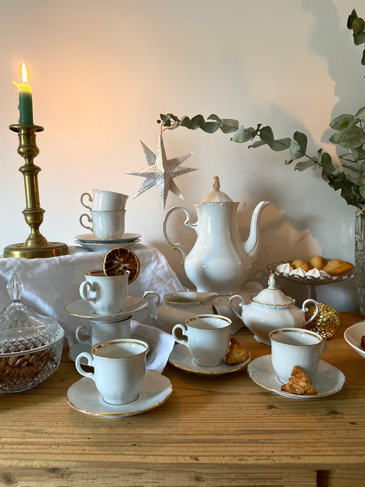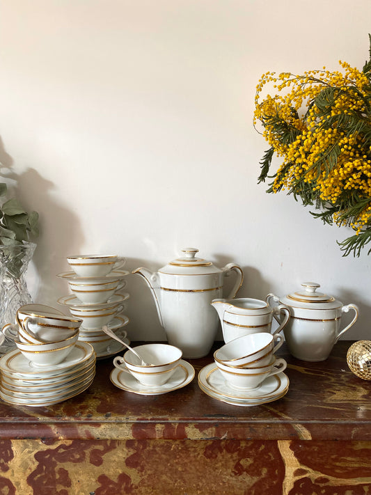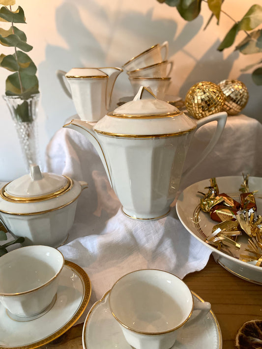 Service à café et thé en porcelaine ancienne blanche à pan et liseré doré