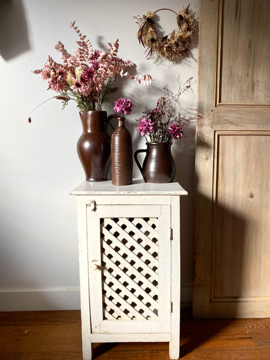 Confiturier à croisillons en bois ancien patiné blanc