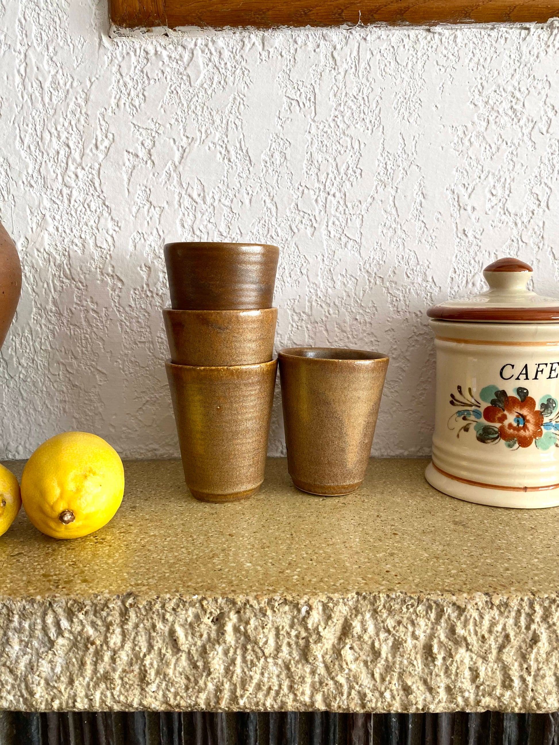 Adorable ensemble de 4 verres en grès anciens que j'adore détourner en tasse à café.