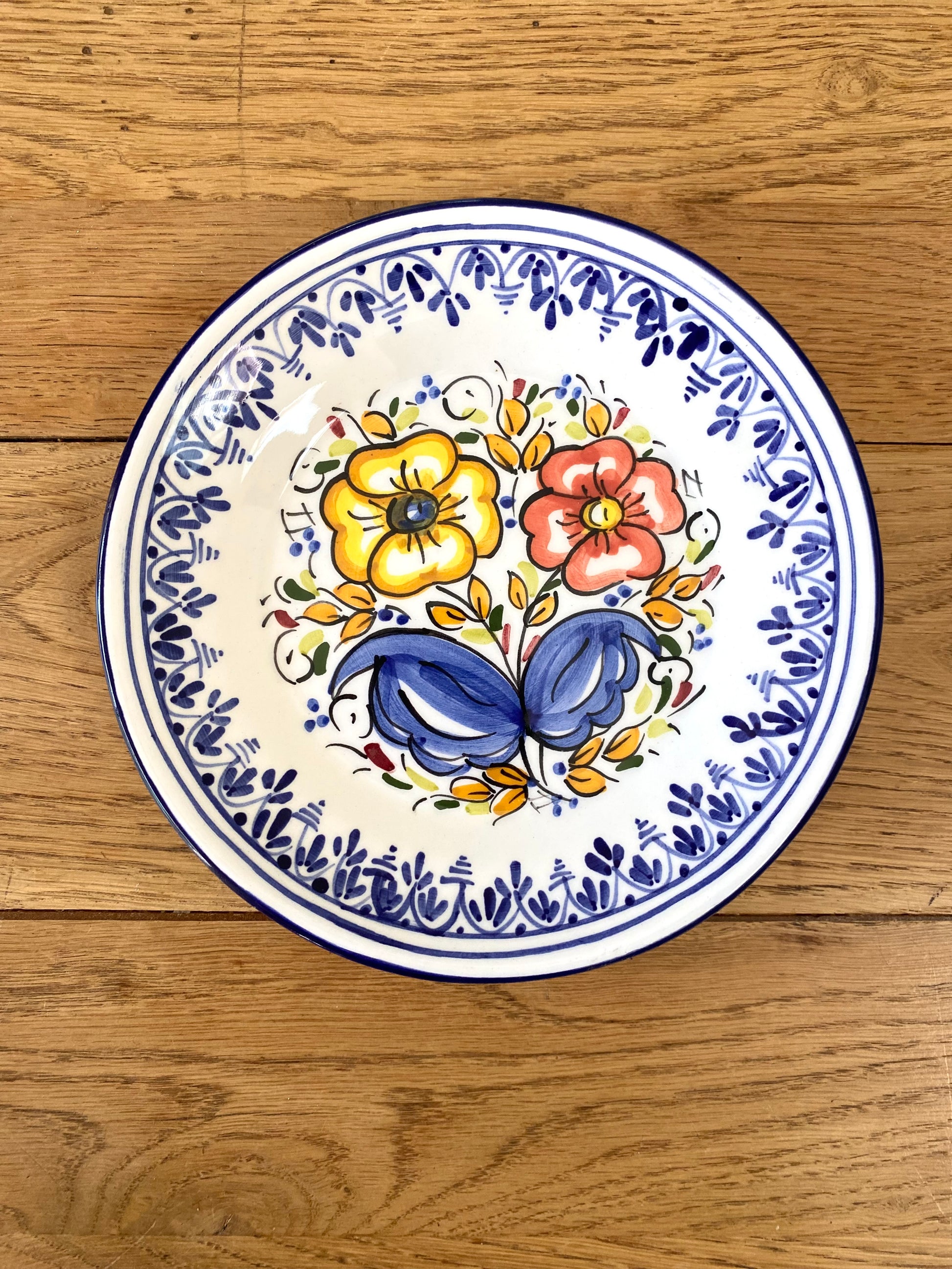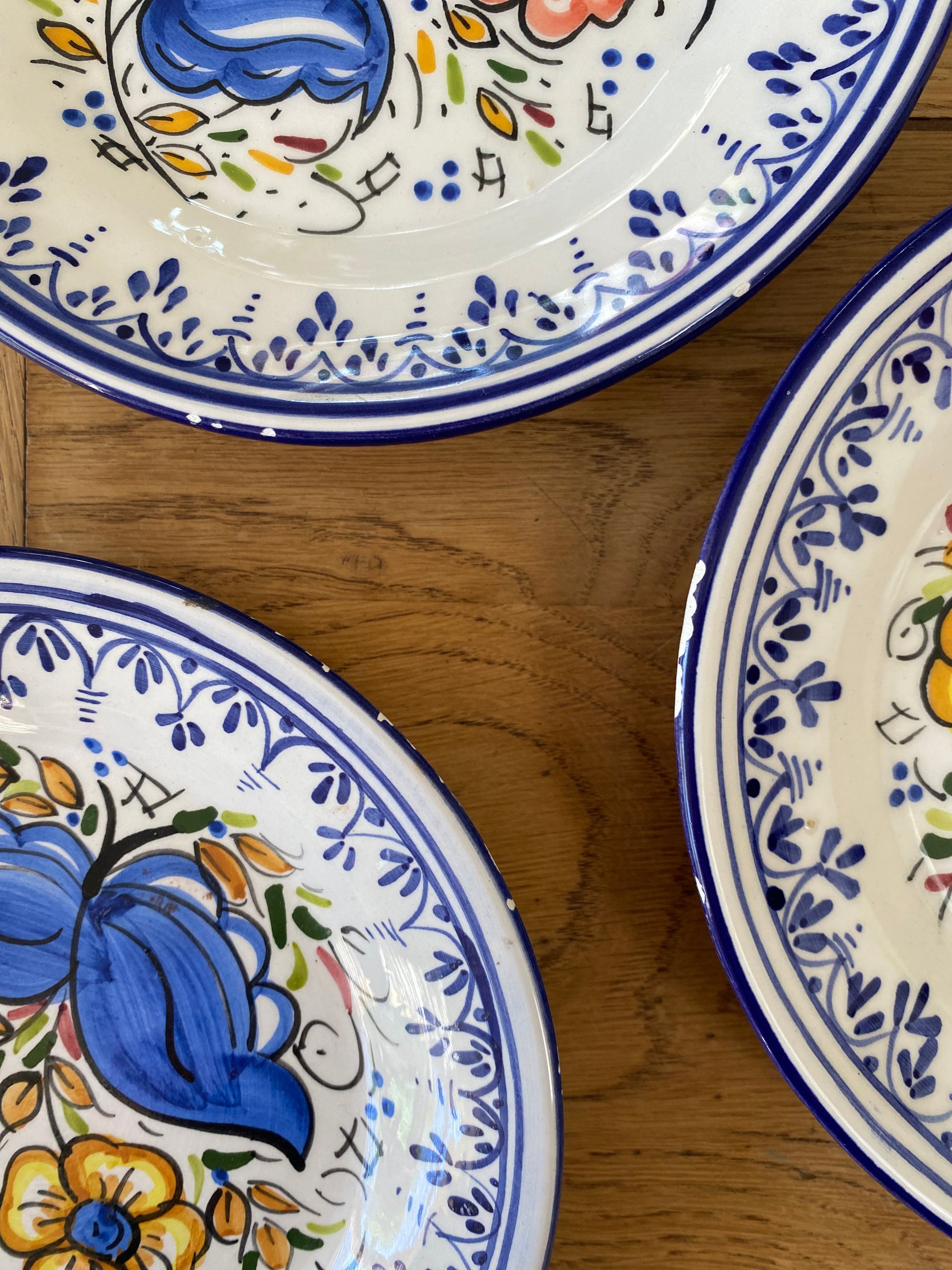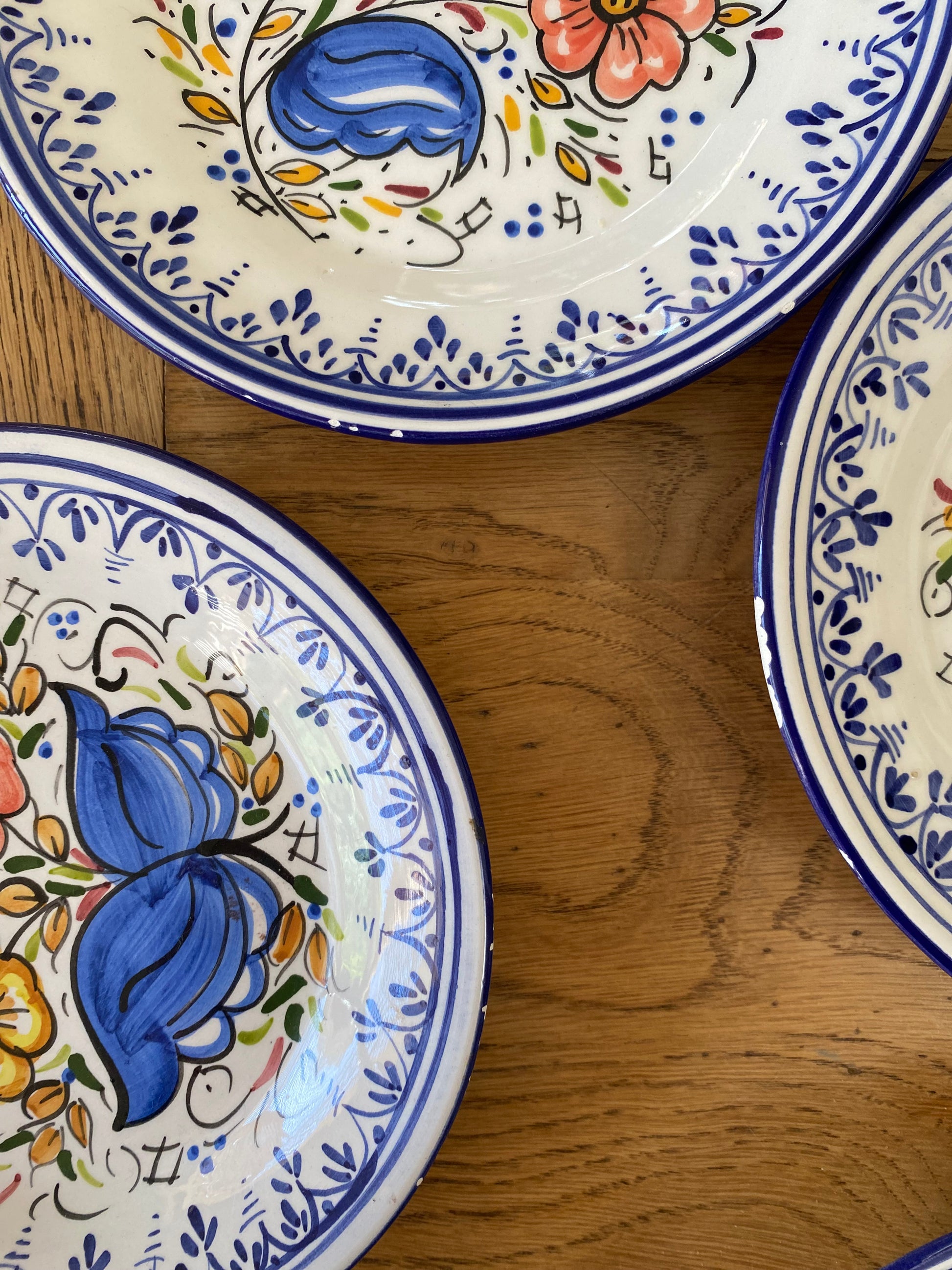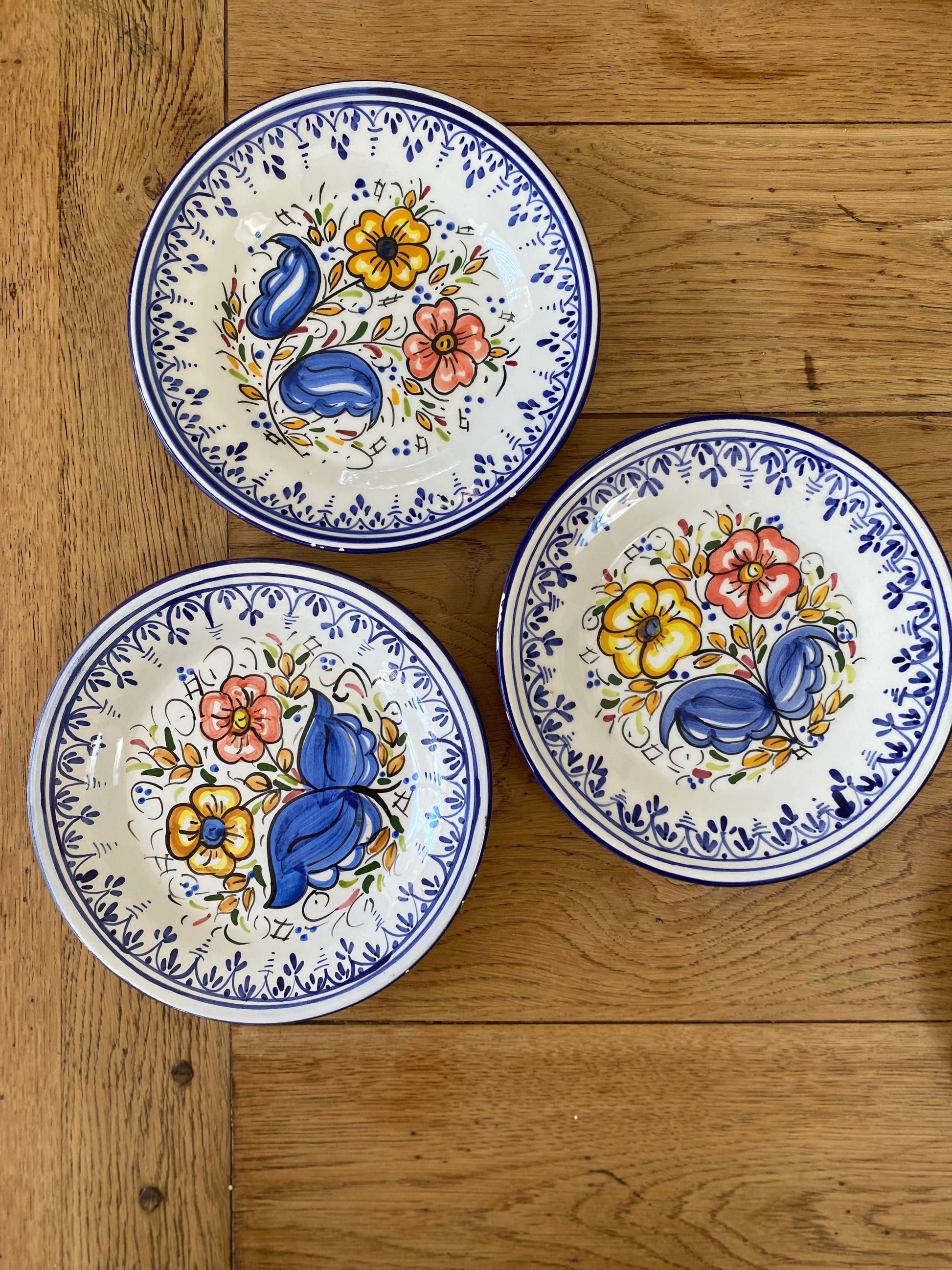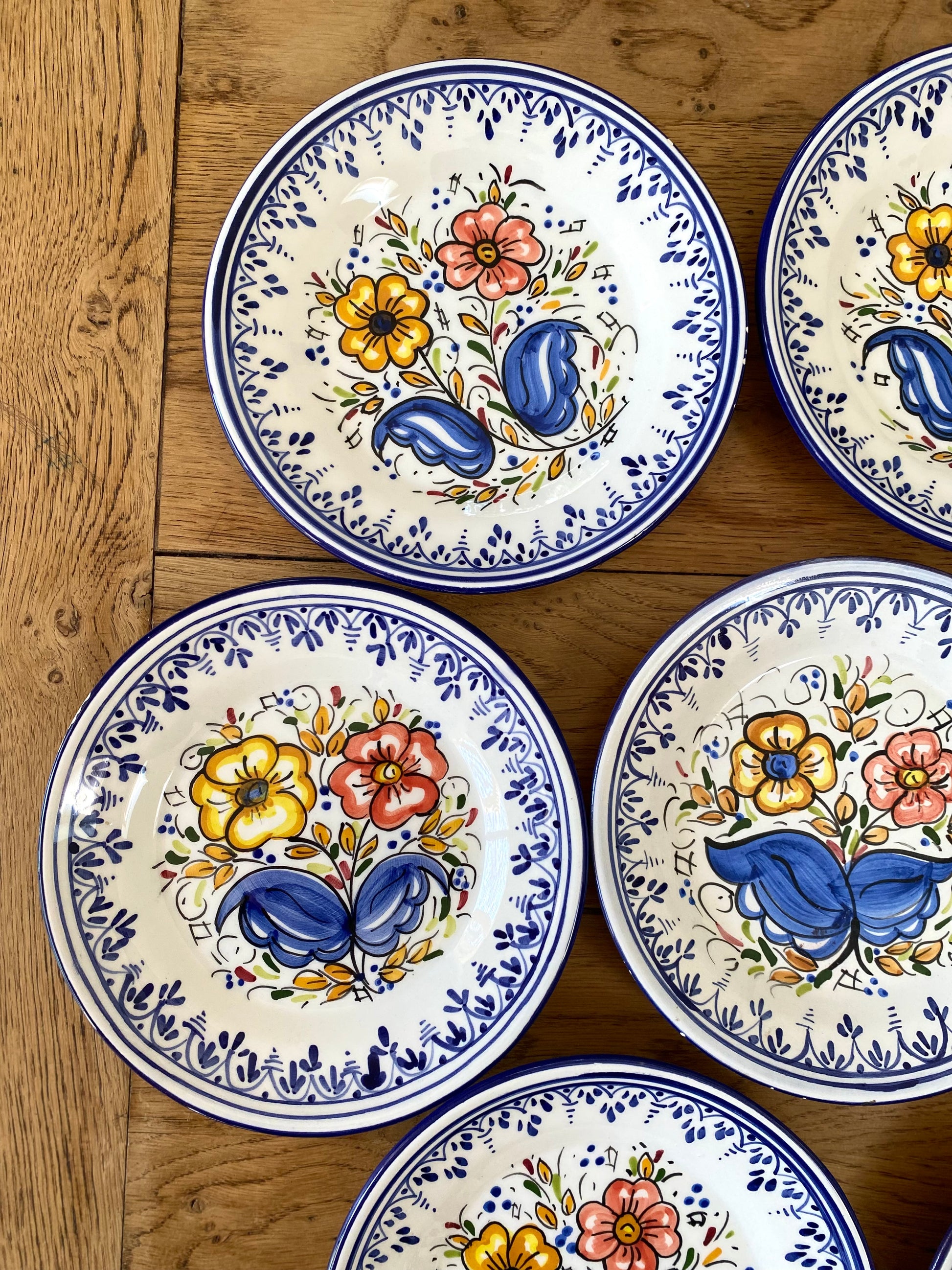 7 jolies assiettes à dessert en faïence ancienne, 3 d’entres elles présentent de légers manques au niveau des contours ( cf 3 dernières photos )