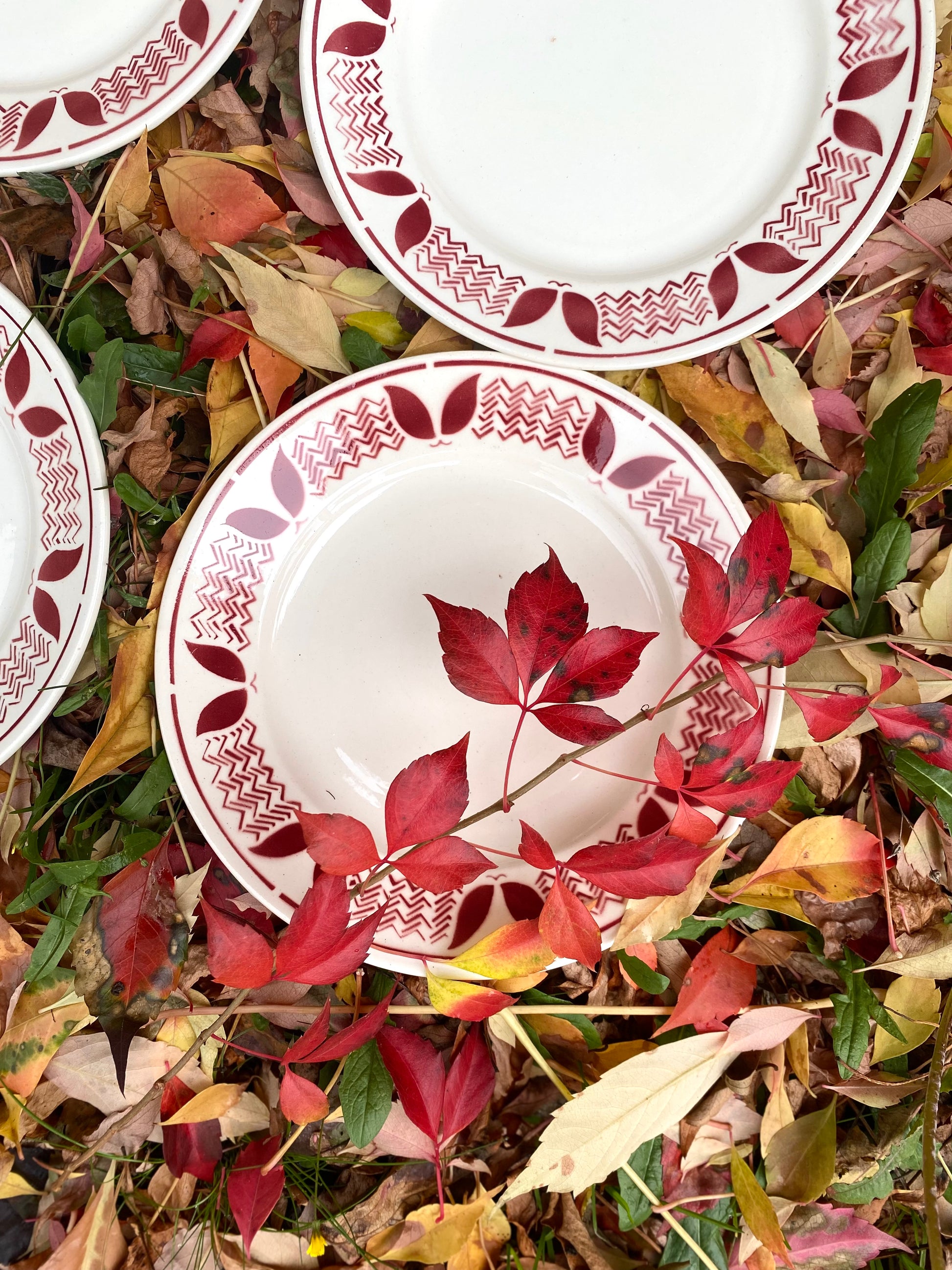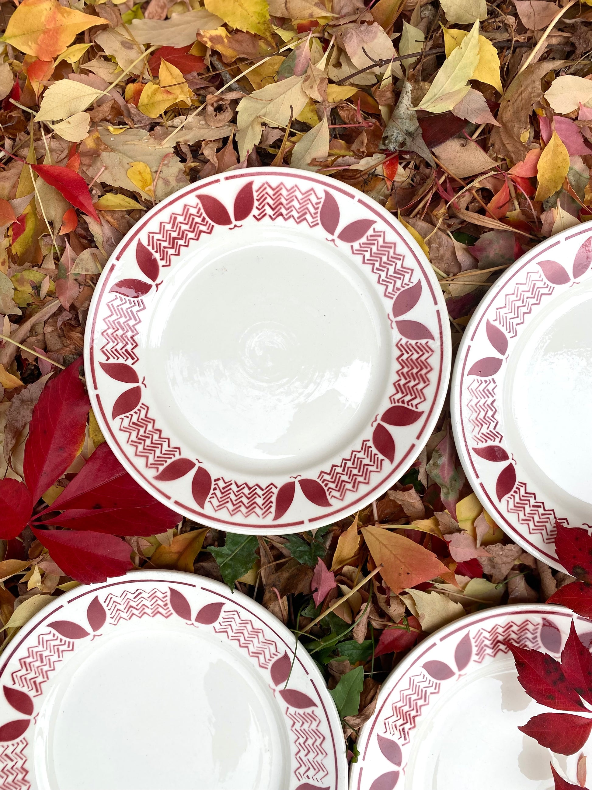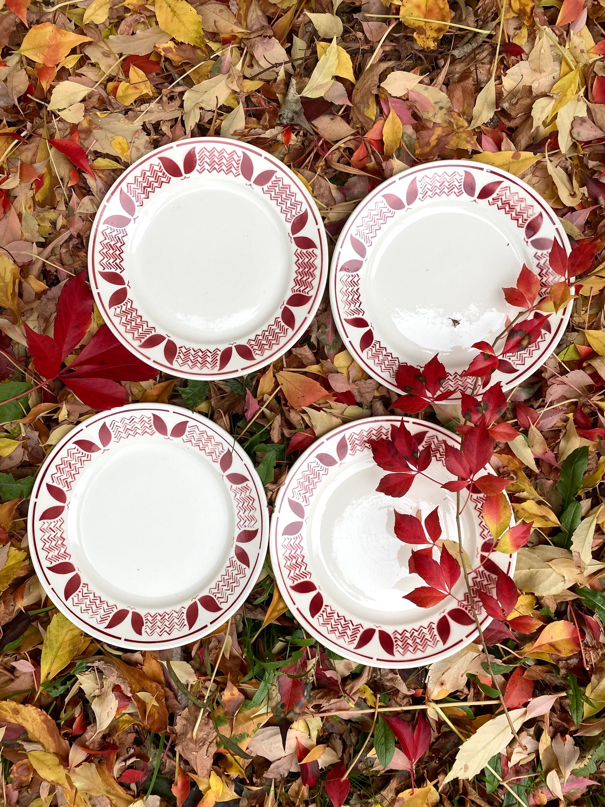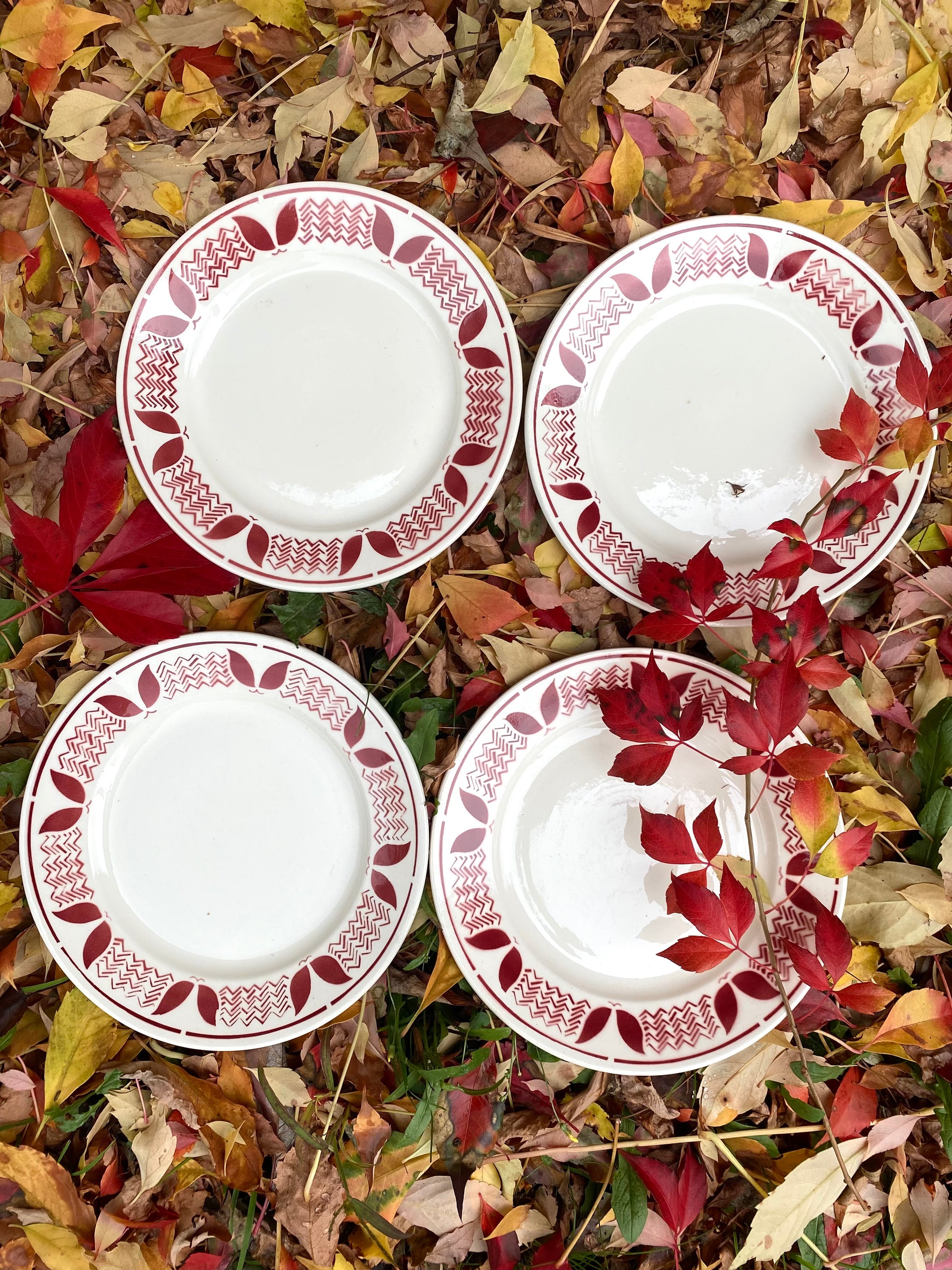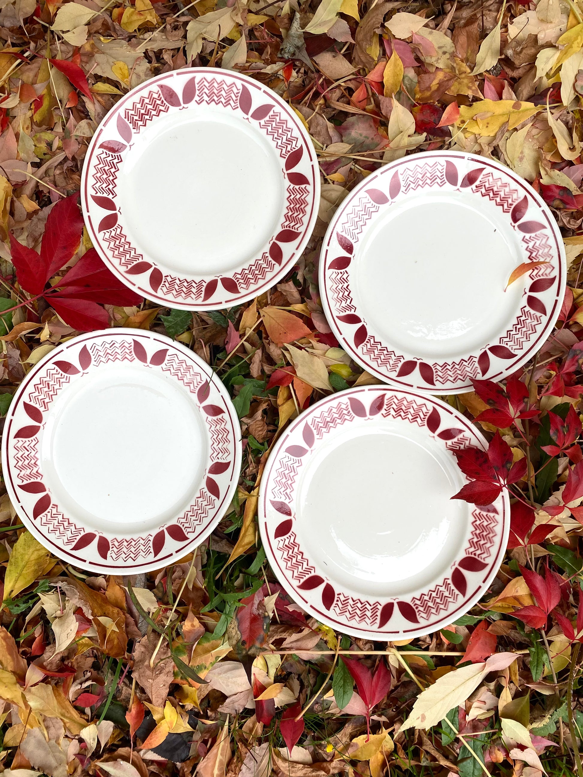 Ravissant ensemble de 4 assiettes à dessert en faïence ancienne bordeaux