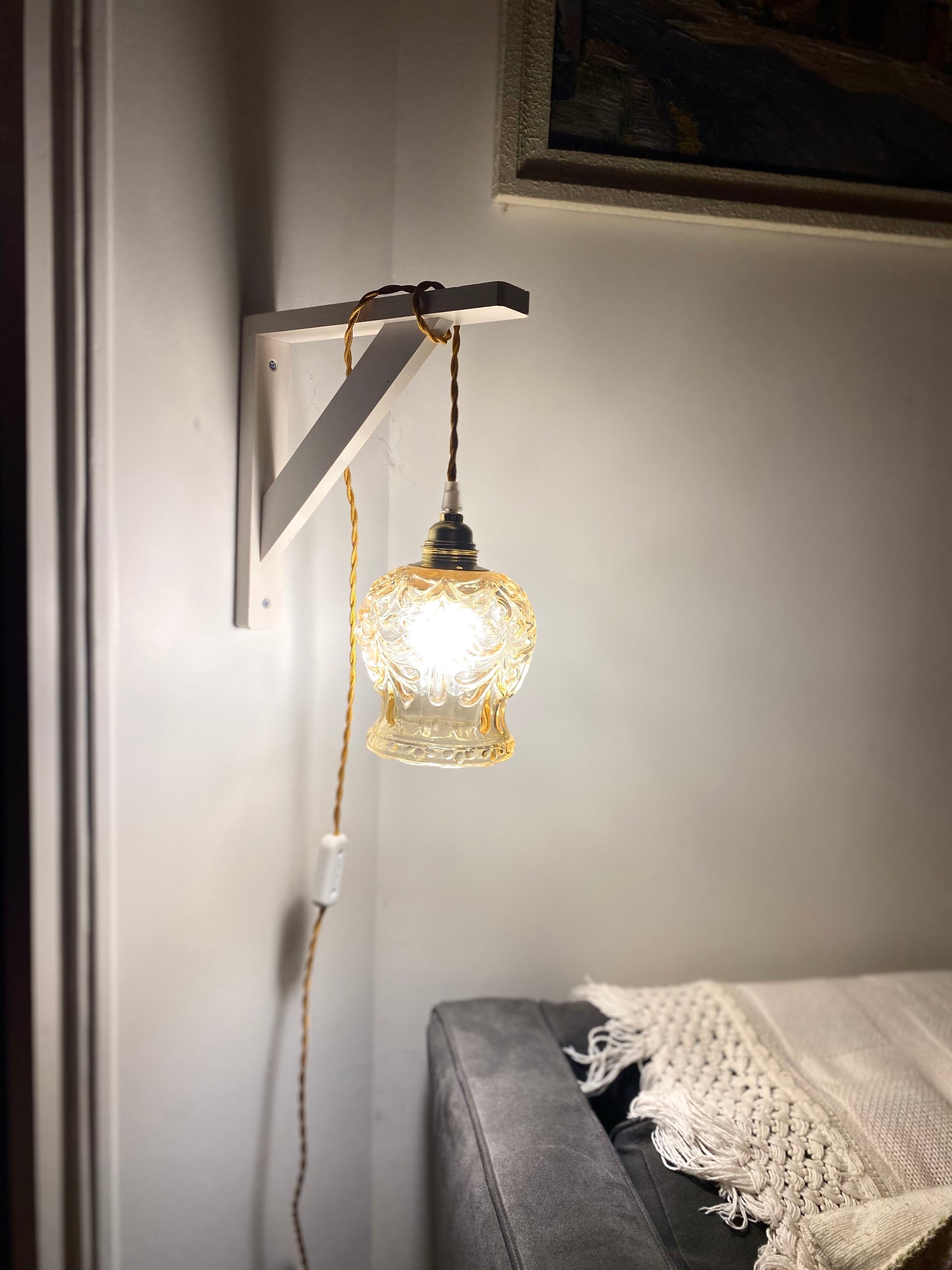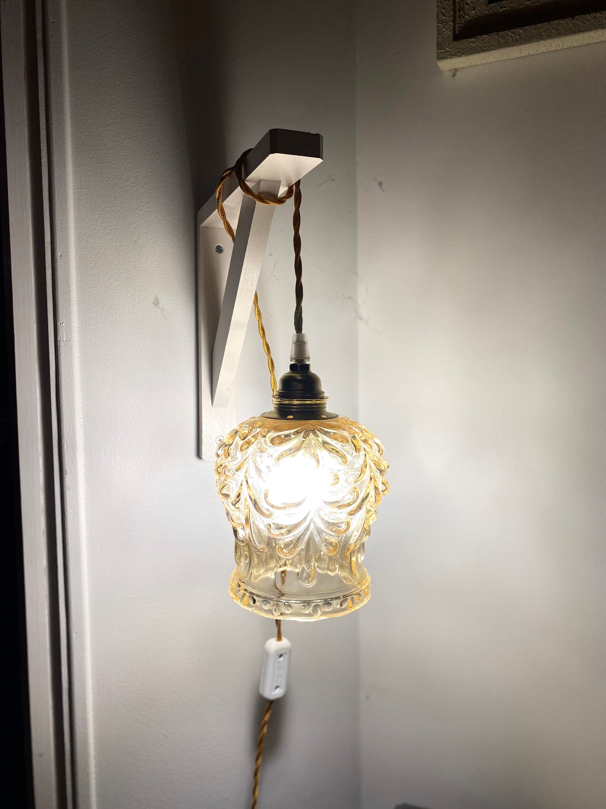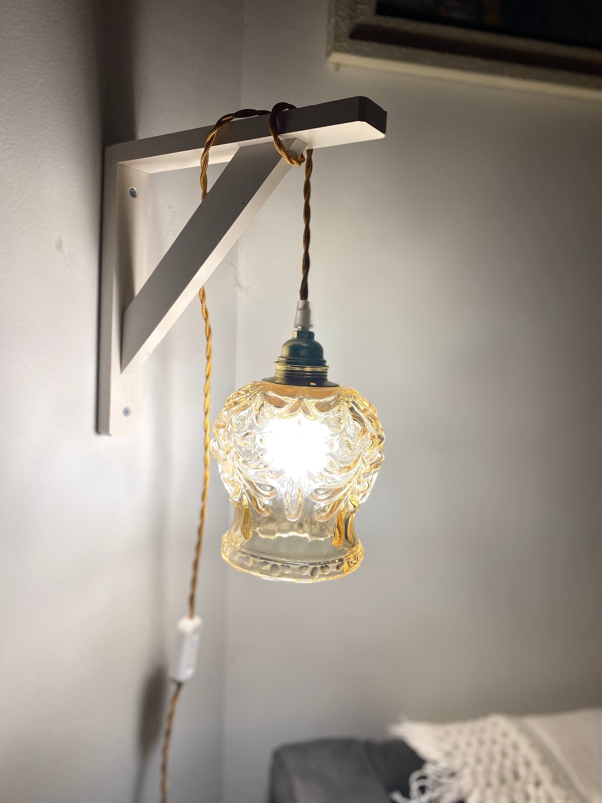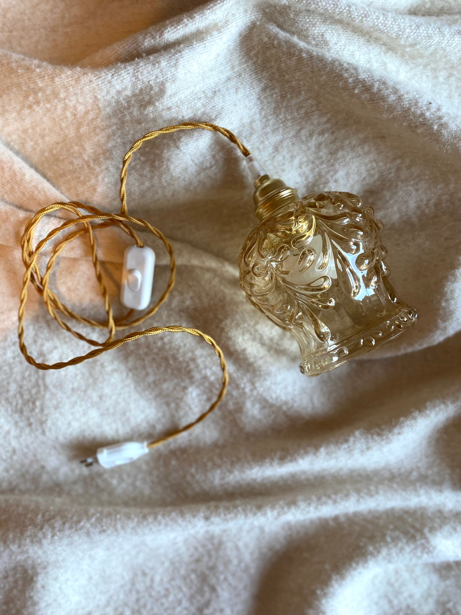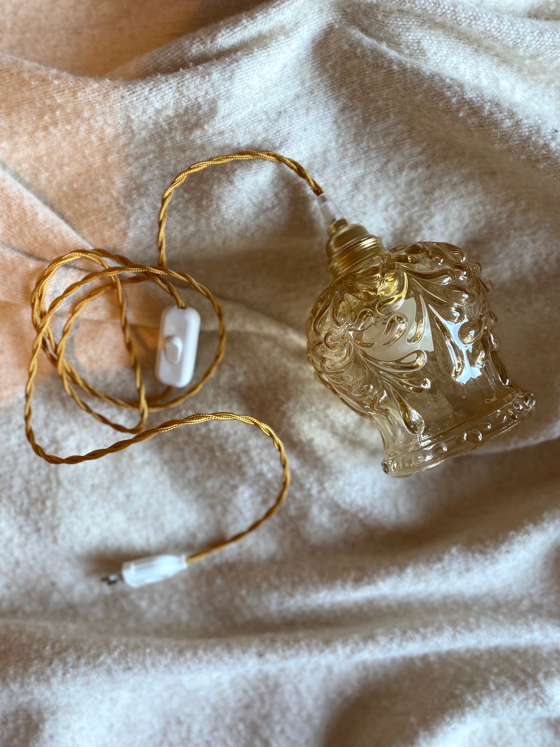 Baladeuse globe en verre bullé irisé et cordon torsadé couleur moutarde au ravissant style Art Déco.