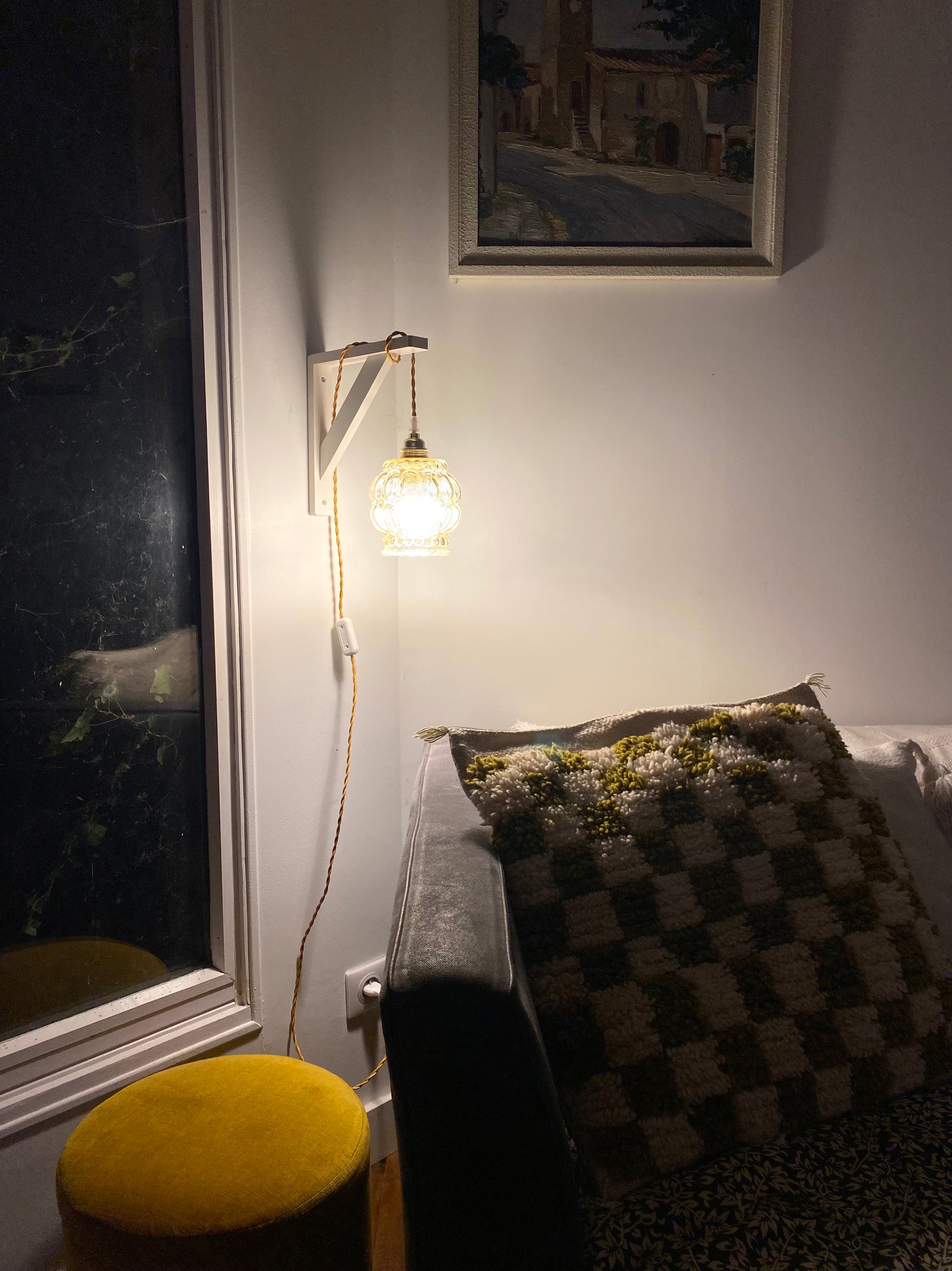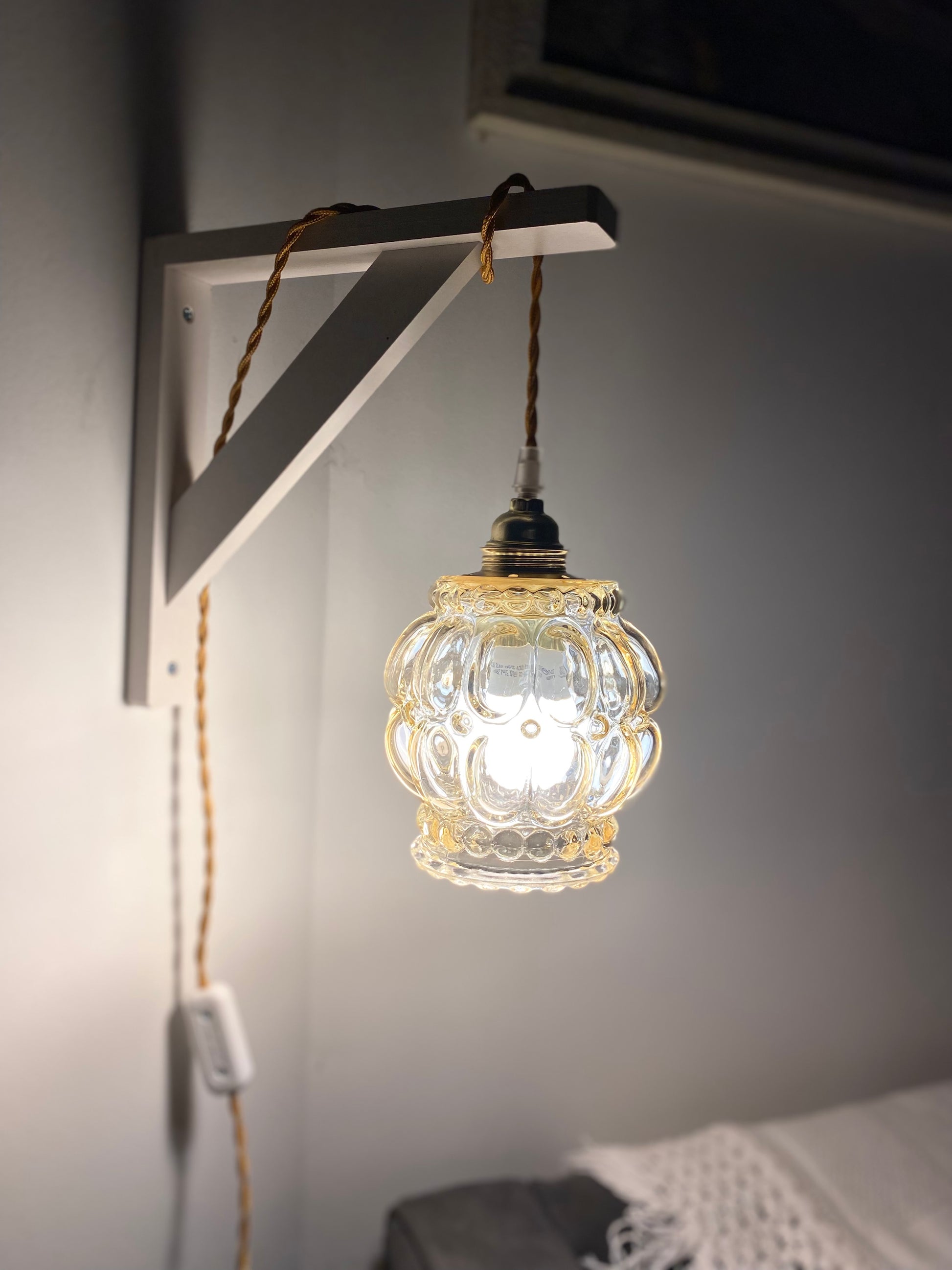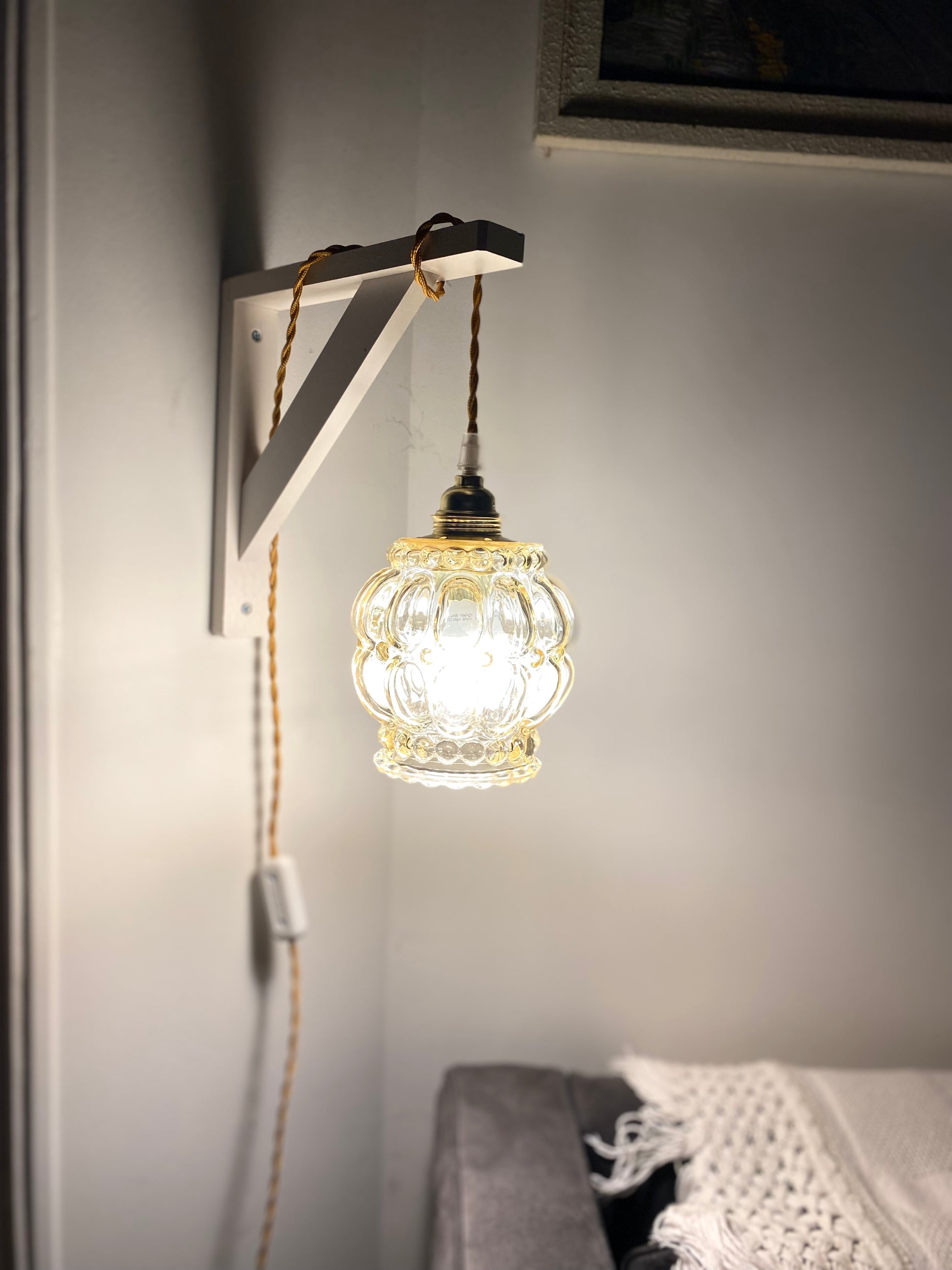 Baladeuse globe en verre bullé irisé et cordon torsadé couleur moutarde au ravissant style Art Déco.