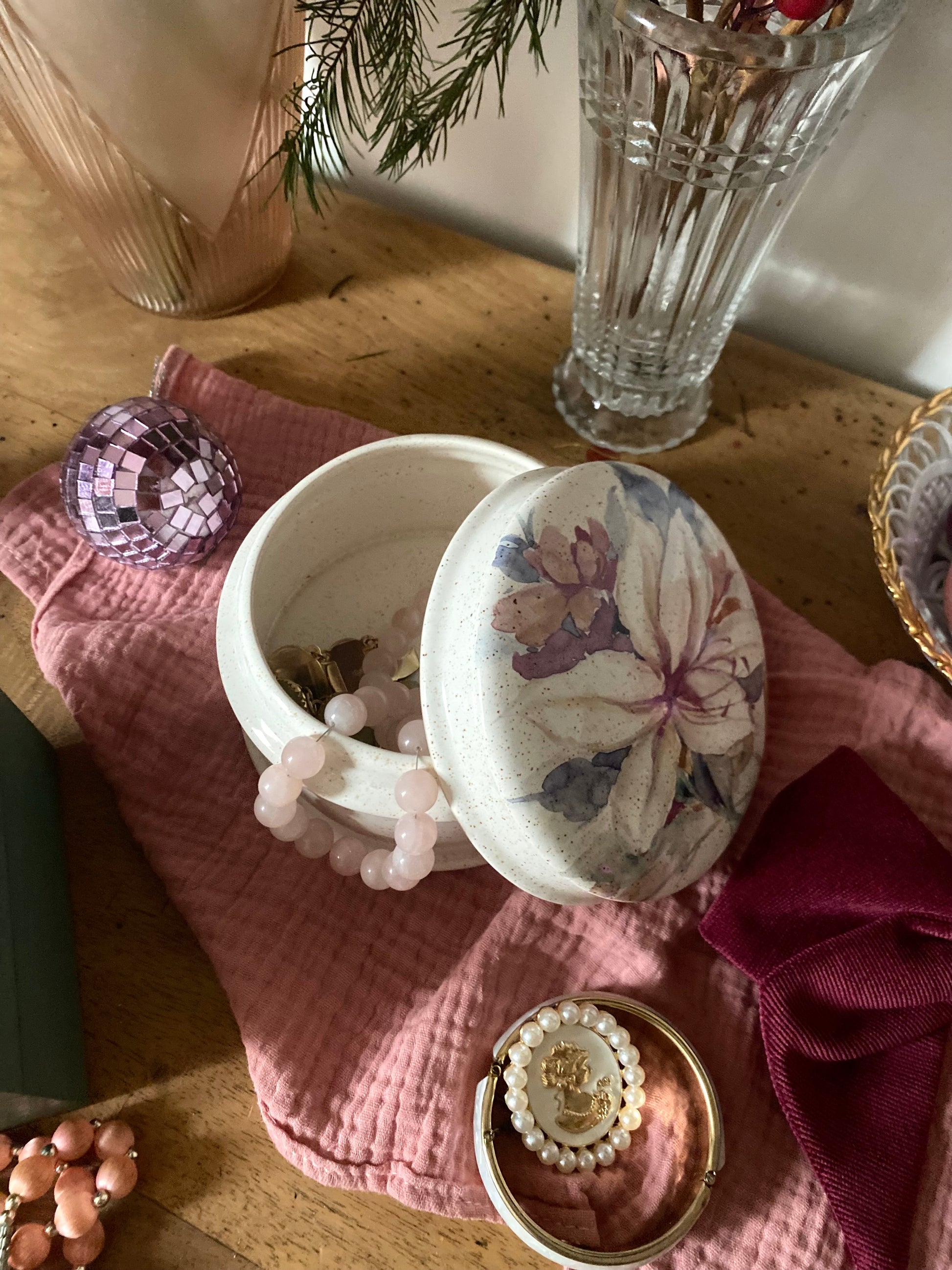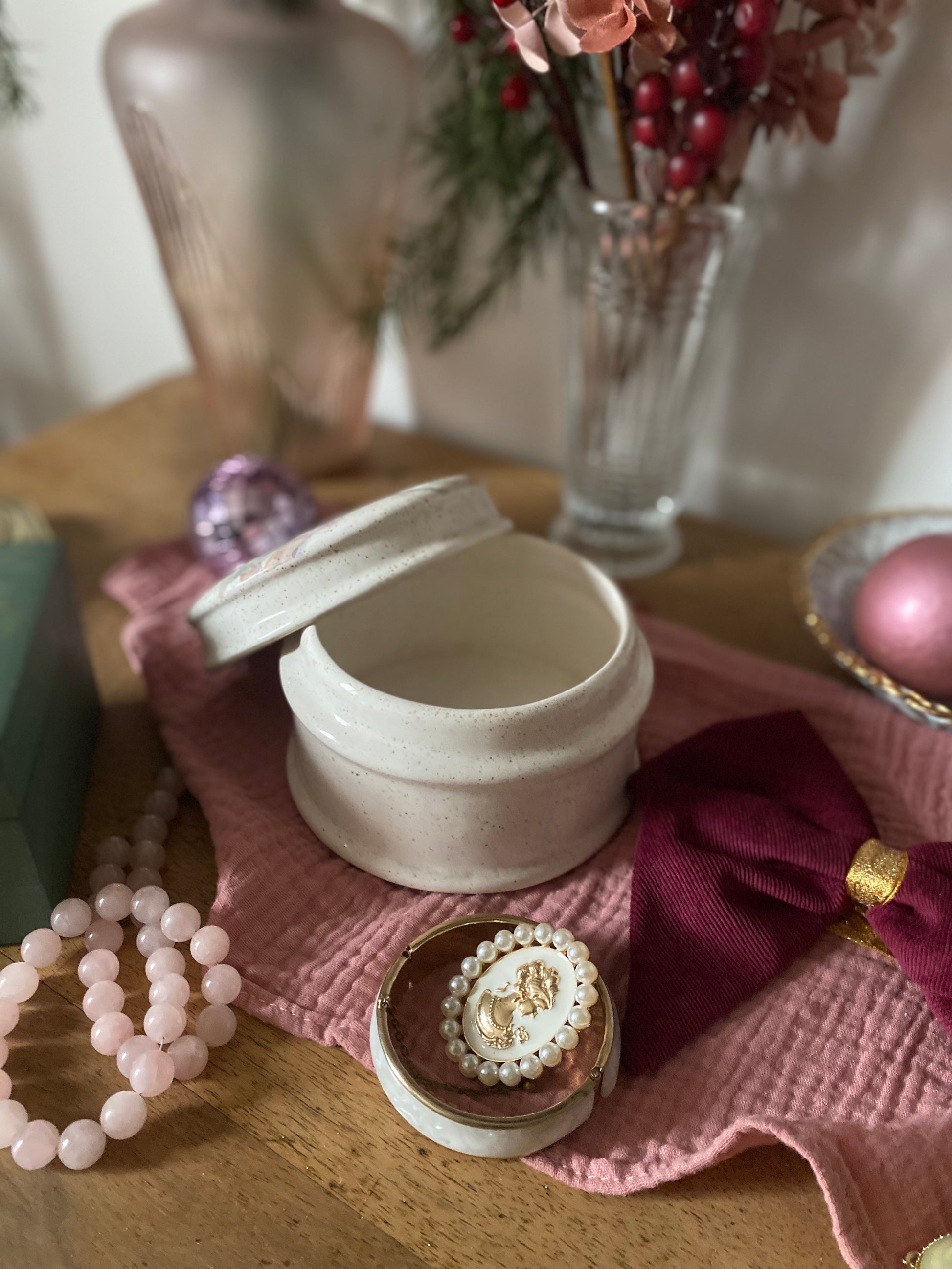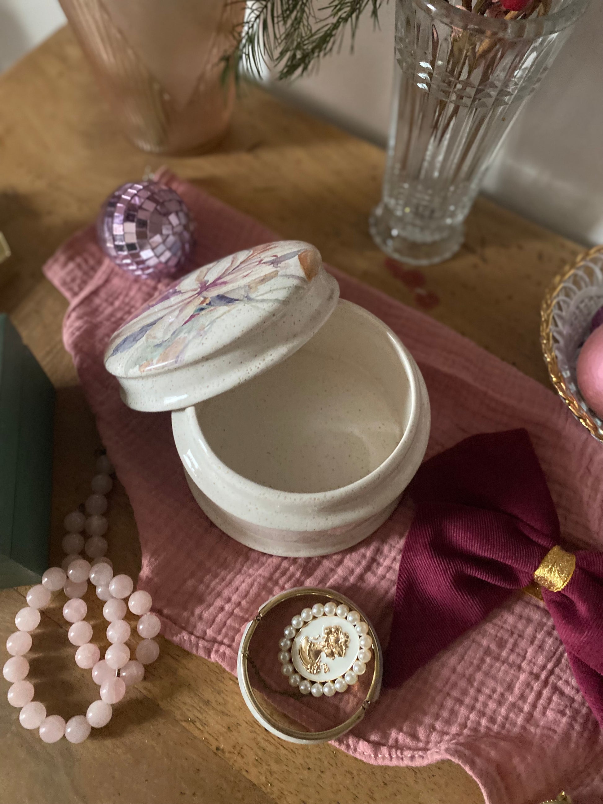 Cette boîte à bijoux provient des Faïences de Roanne, et plus précisément de l'atelier de la famille Coomans et à été fabriquée dans les années 1960.