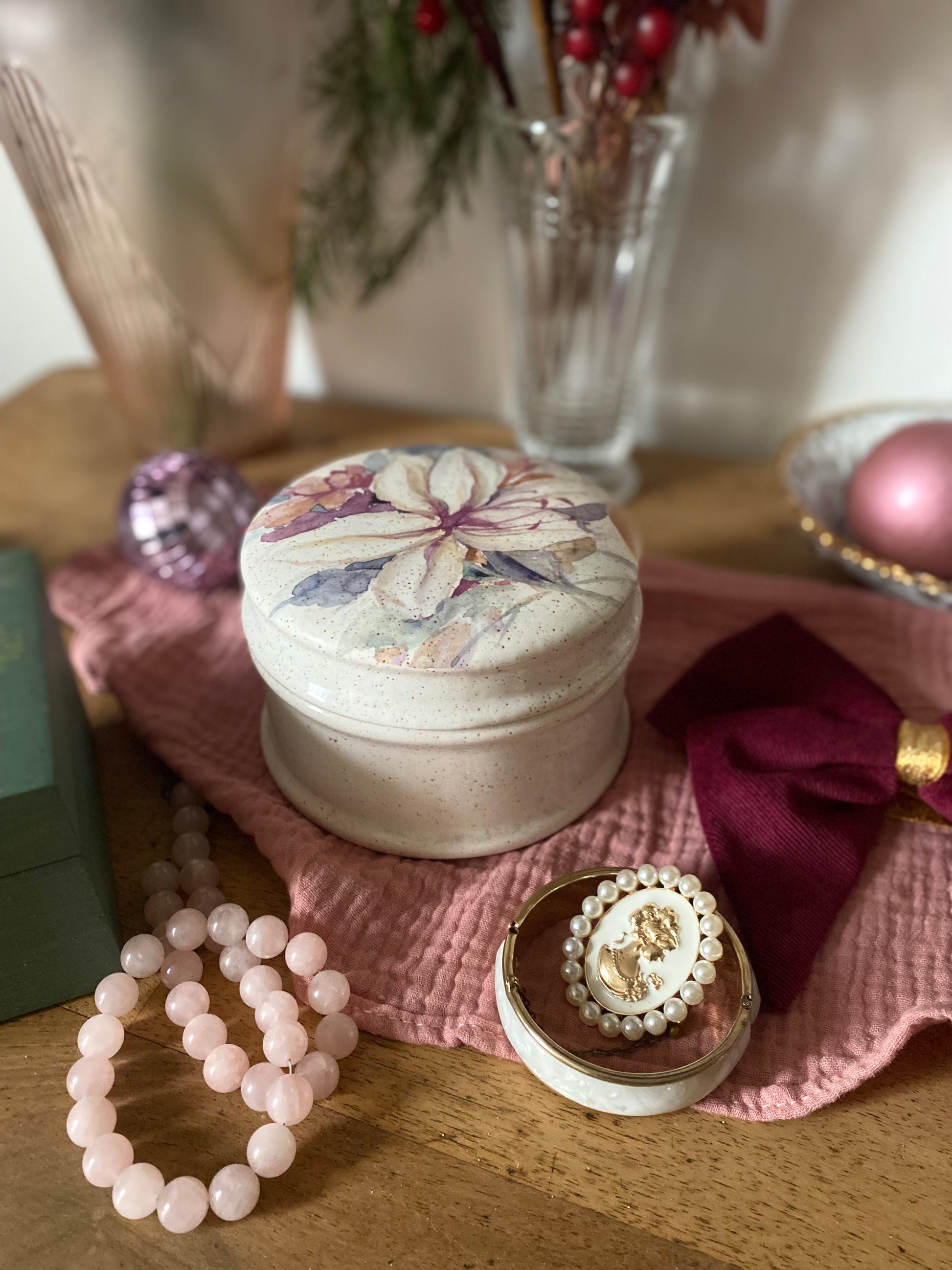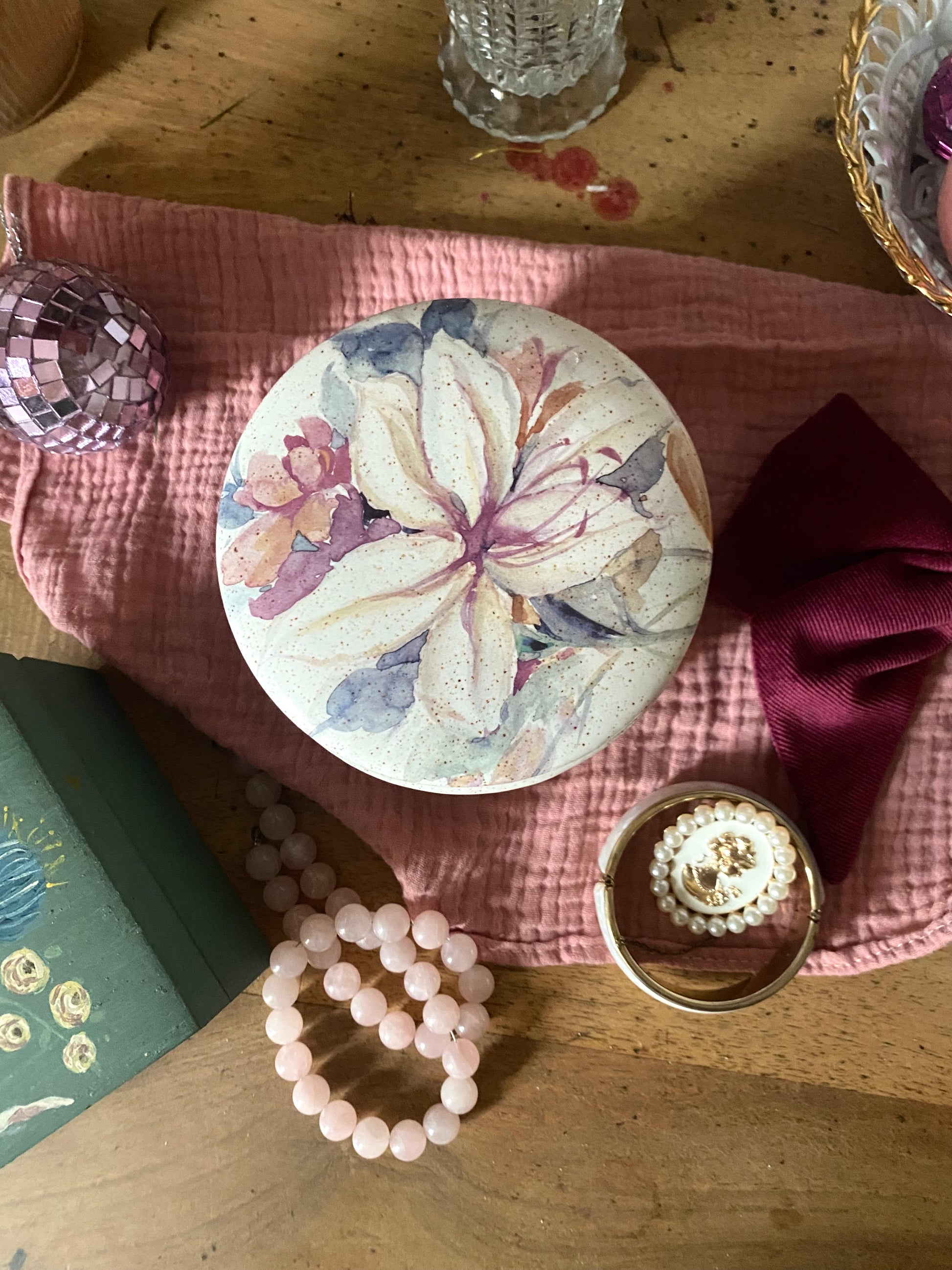 La boîte possède une forme circulaire classique avec une base légèrement évasée et un couvercle assorti.