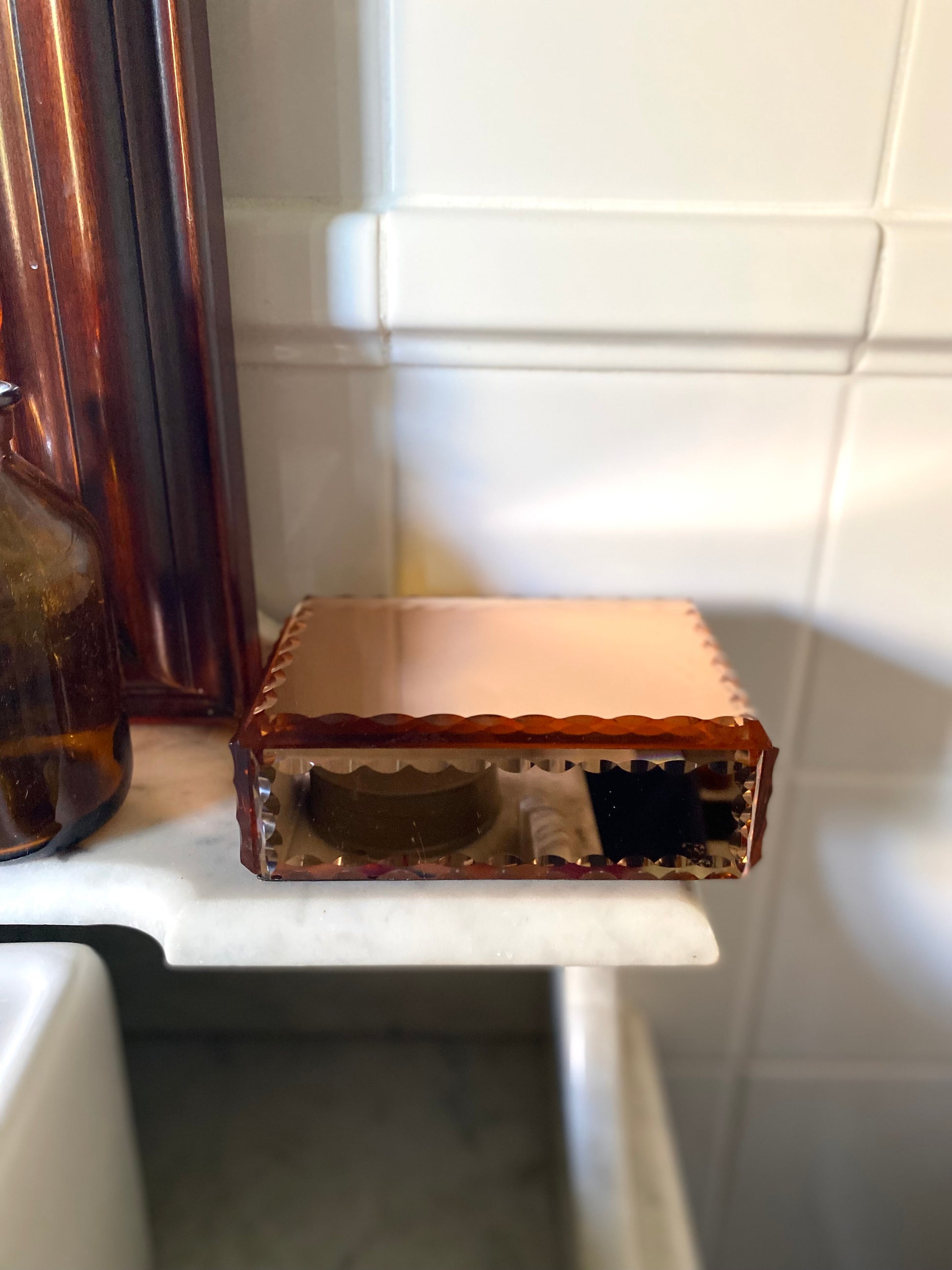 Les miroirs sont assemblés avec précision, donnant à l'objet un aspect luxueux et architectural.