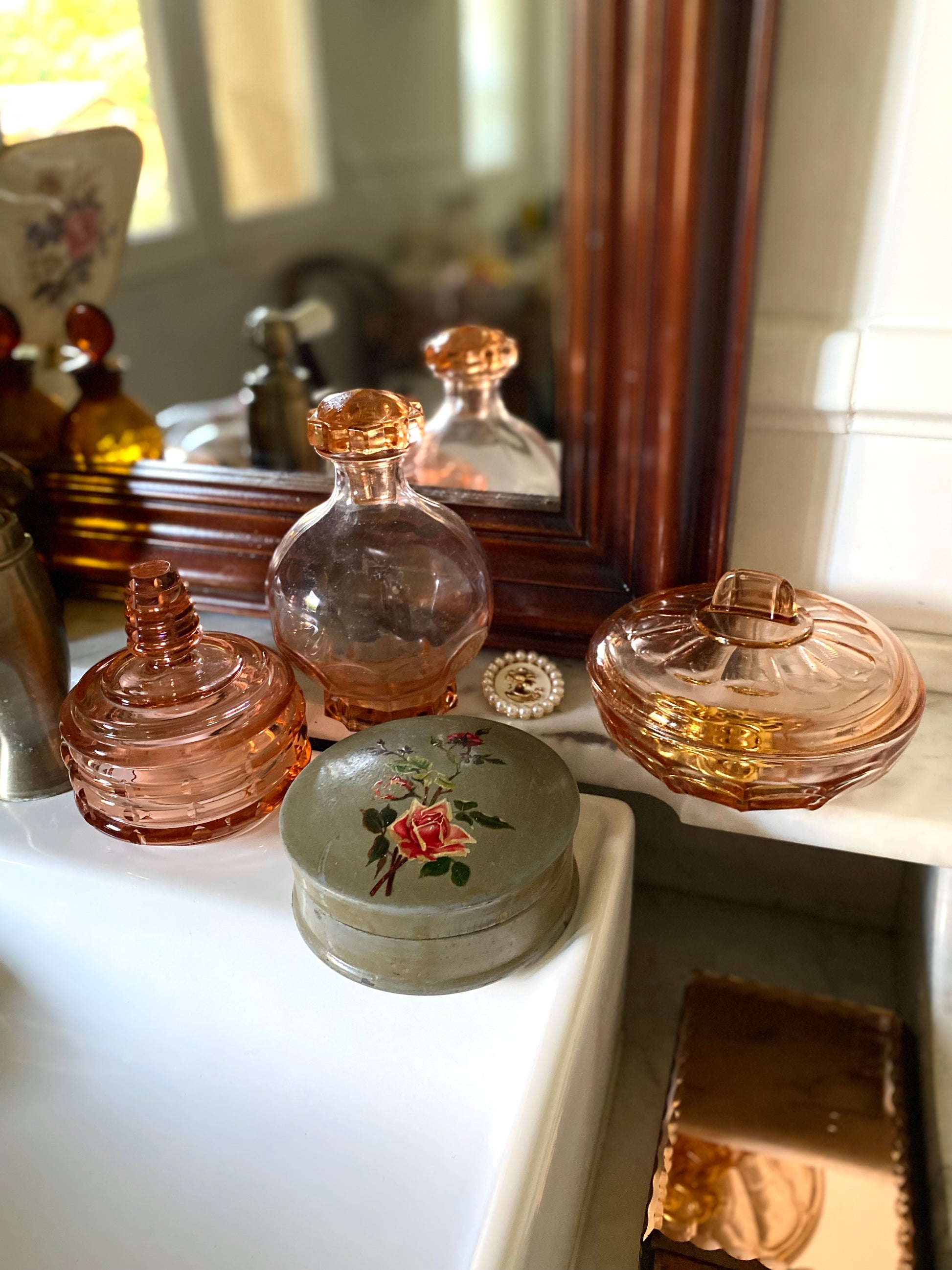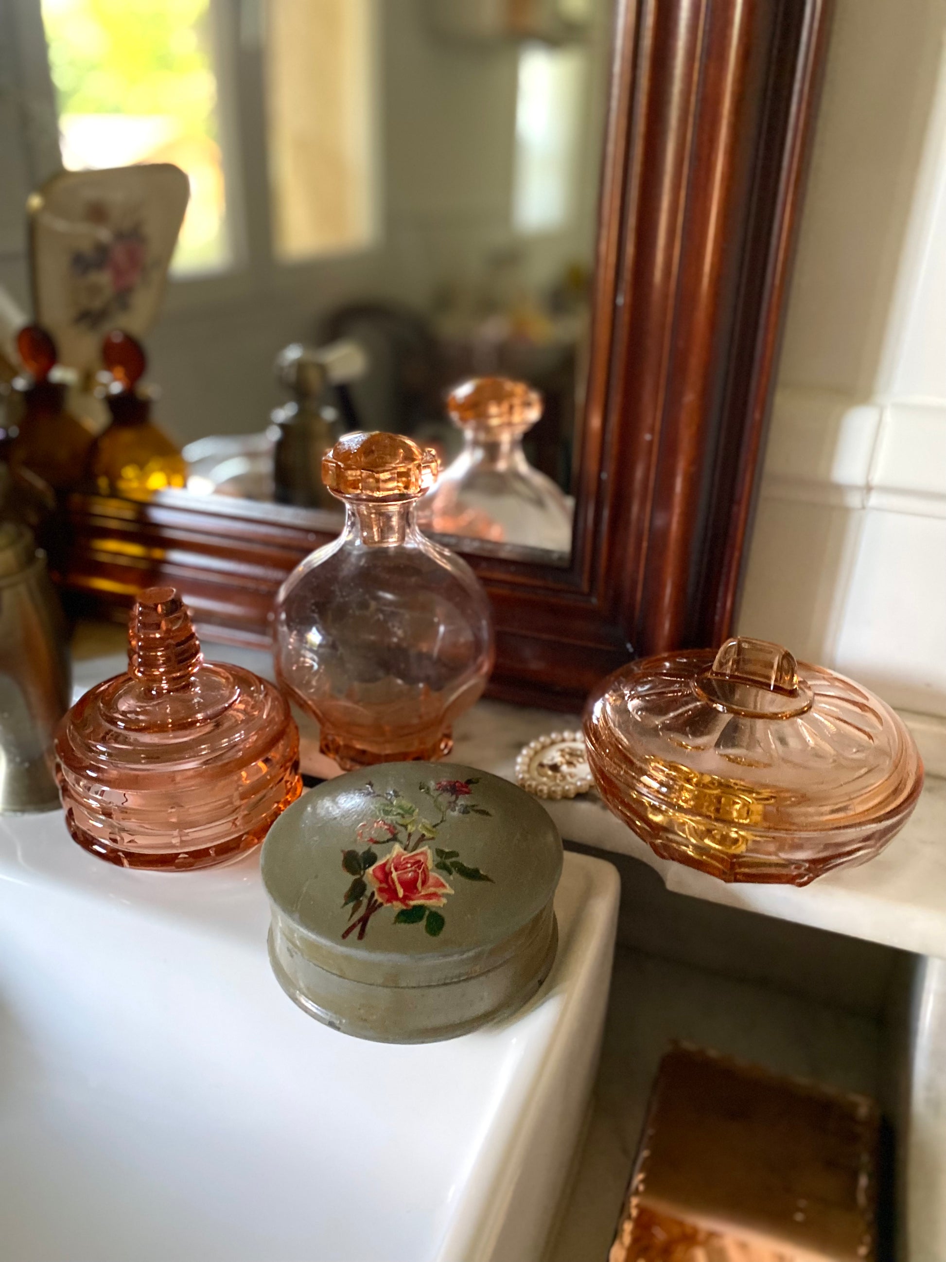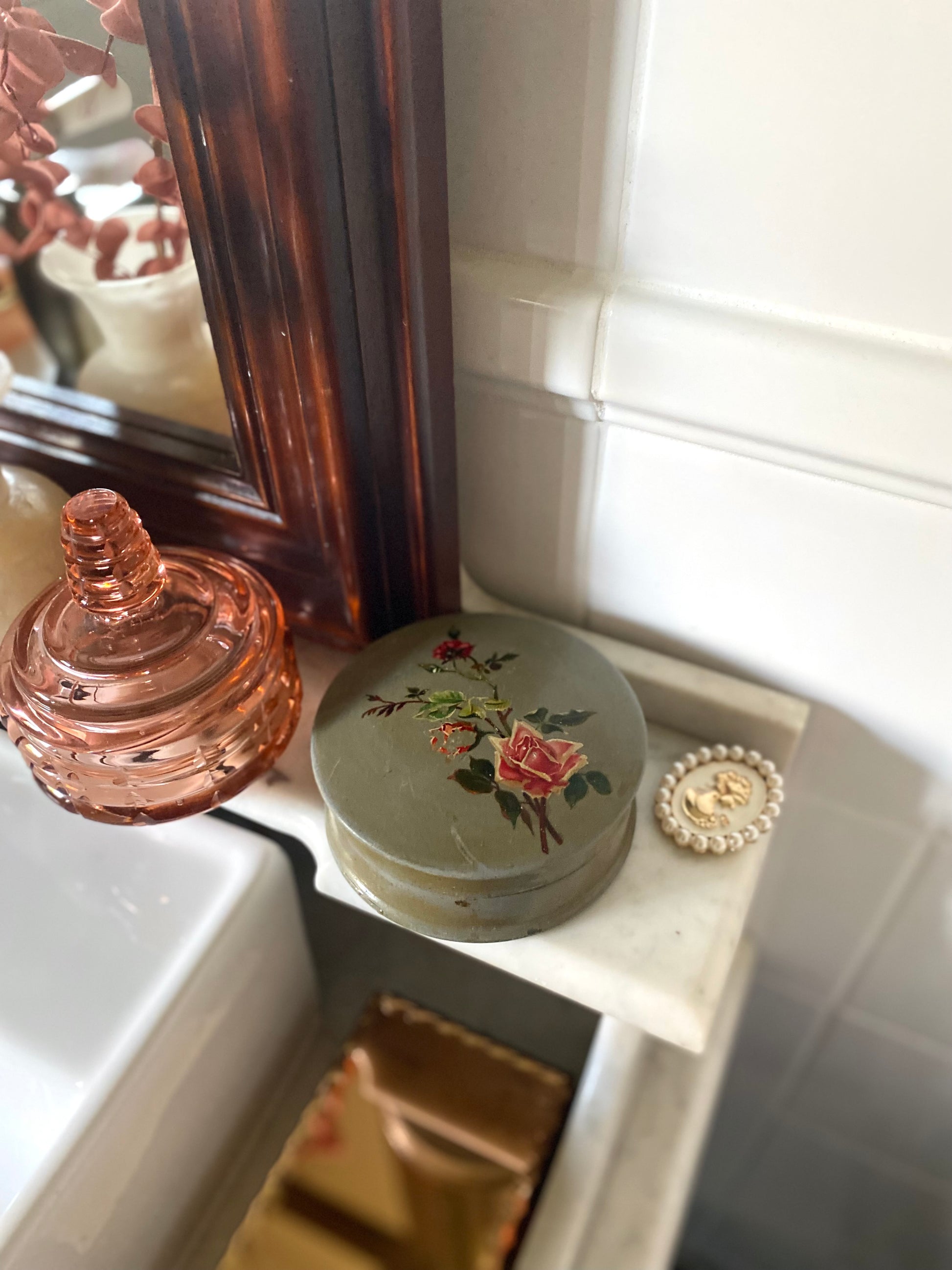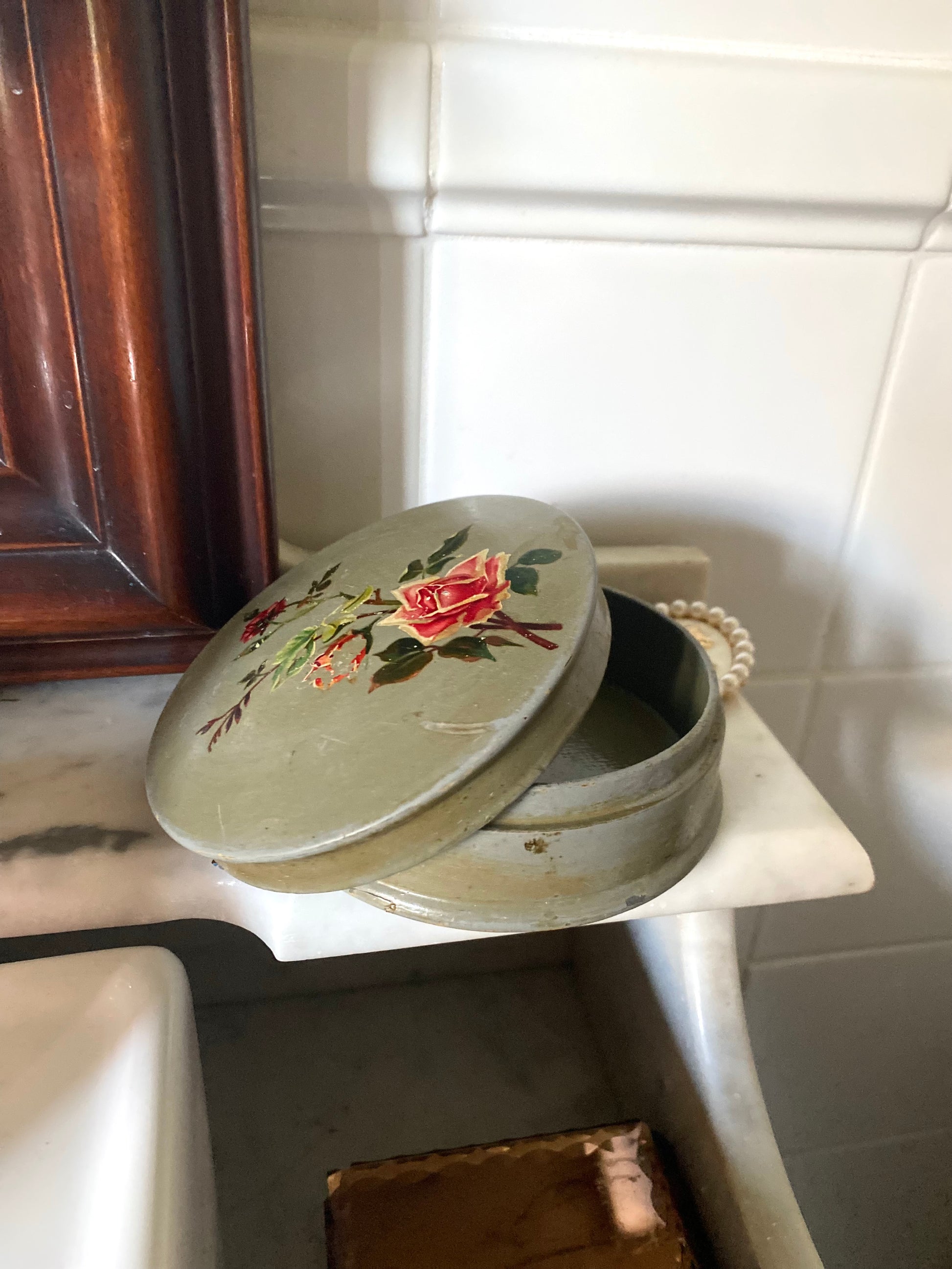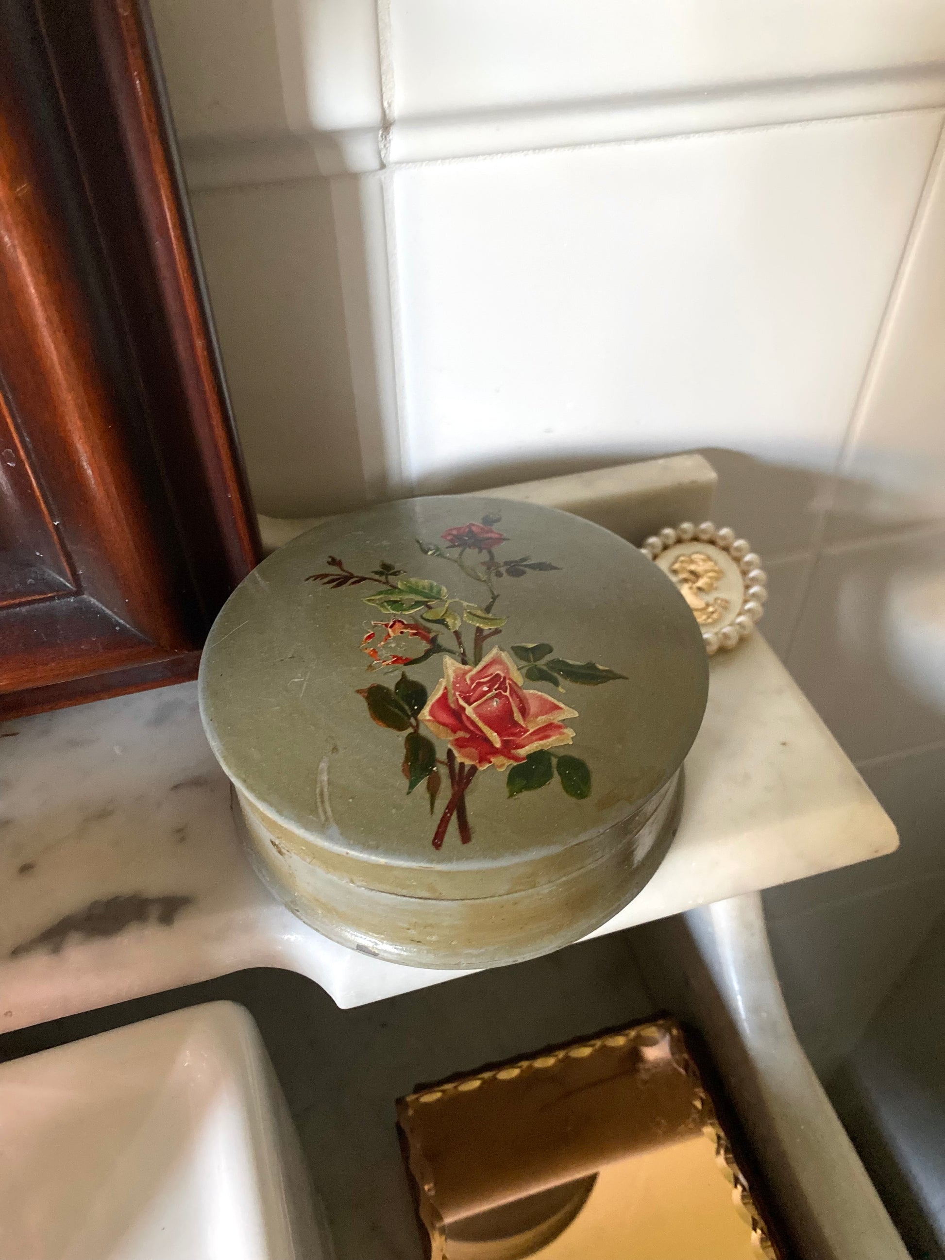 Ravissante boîte à poudre Art Déco des années 1930 en papier mâché laqué d’un joli vert gris patiné et décoré de roses qui rappellent le style des chromos du début du XXe siècle