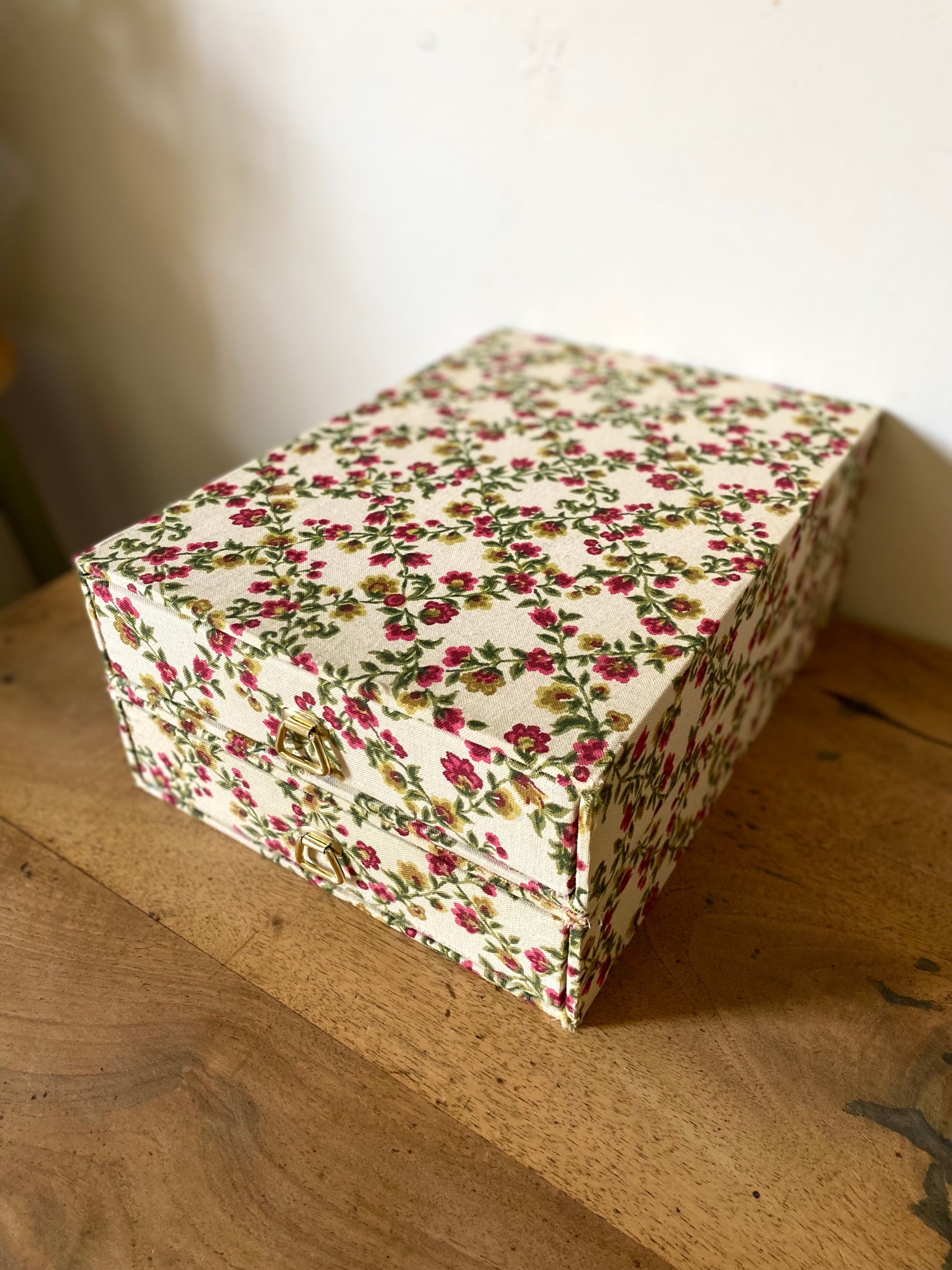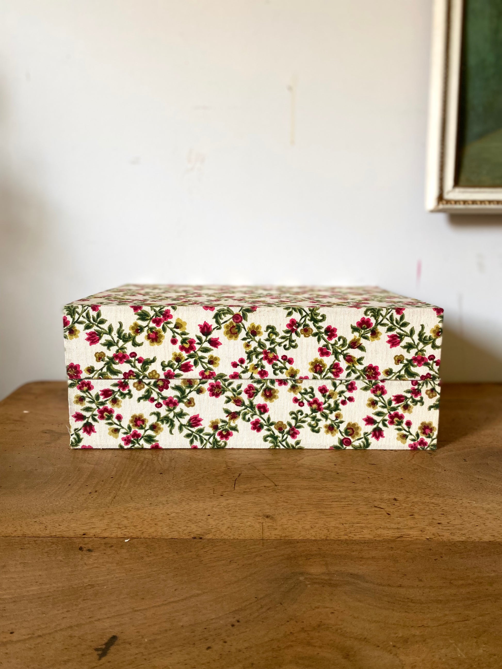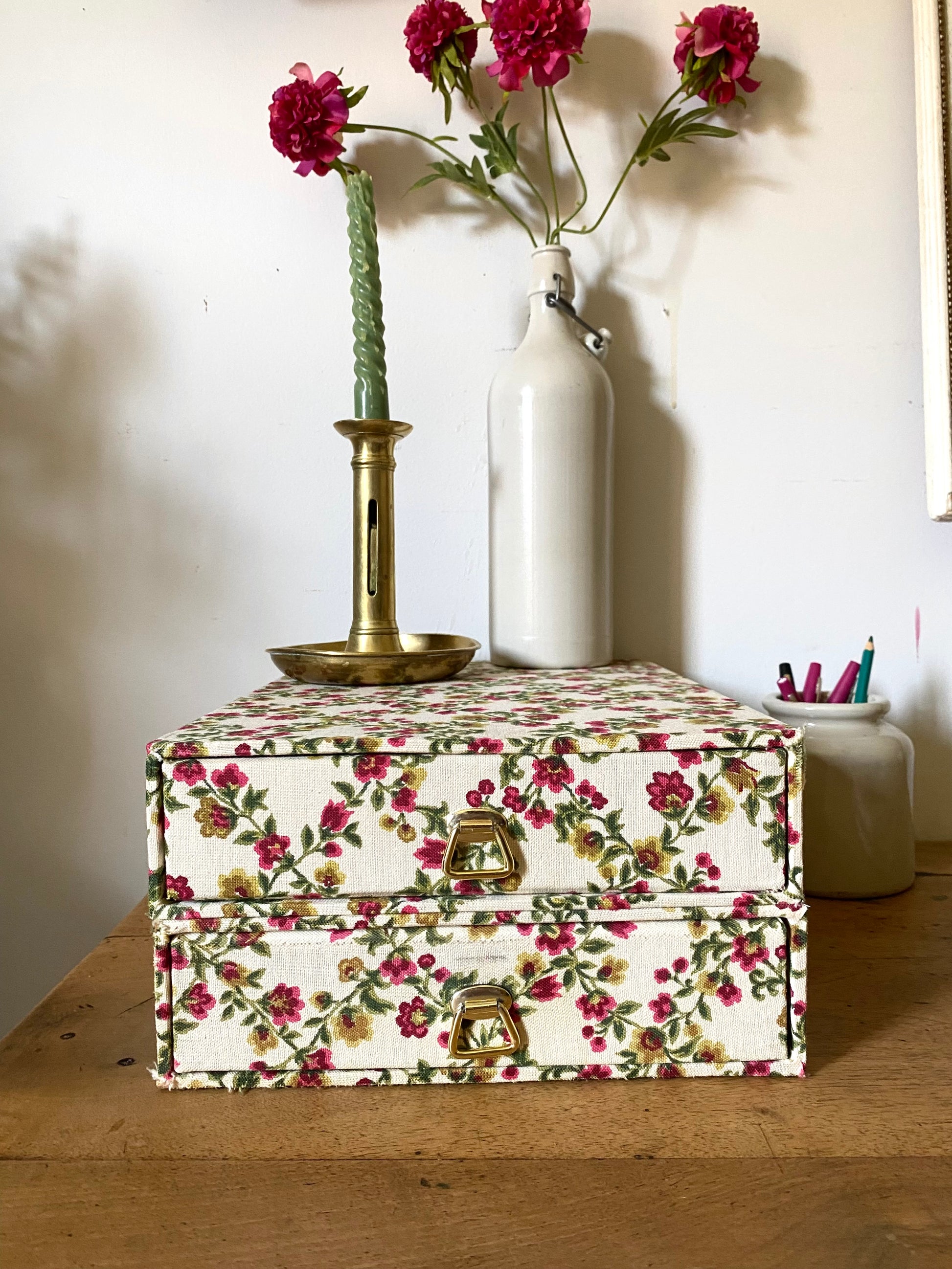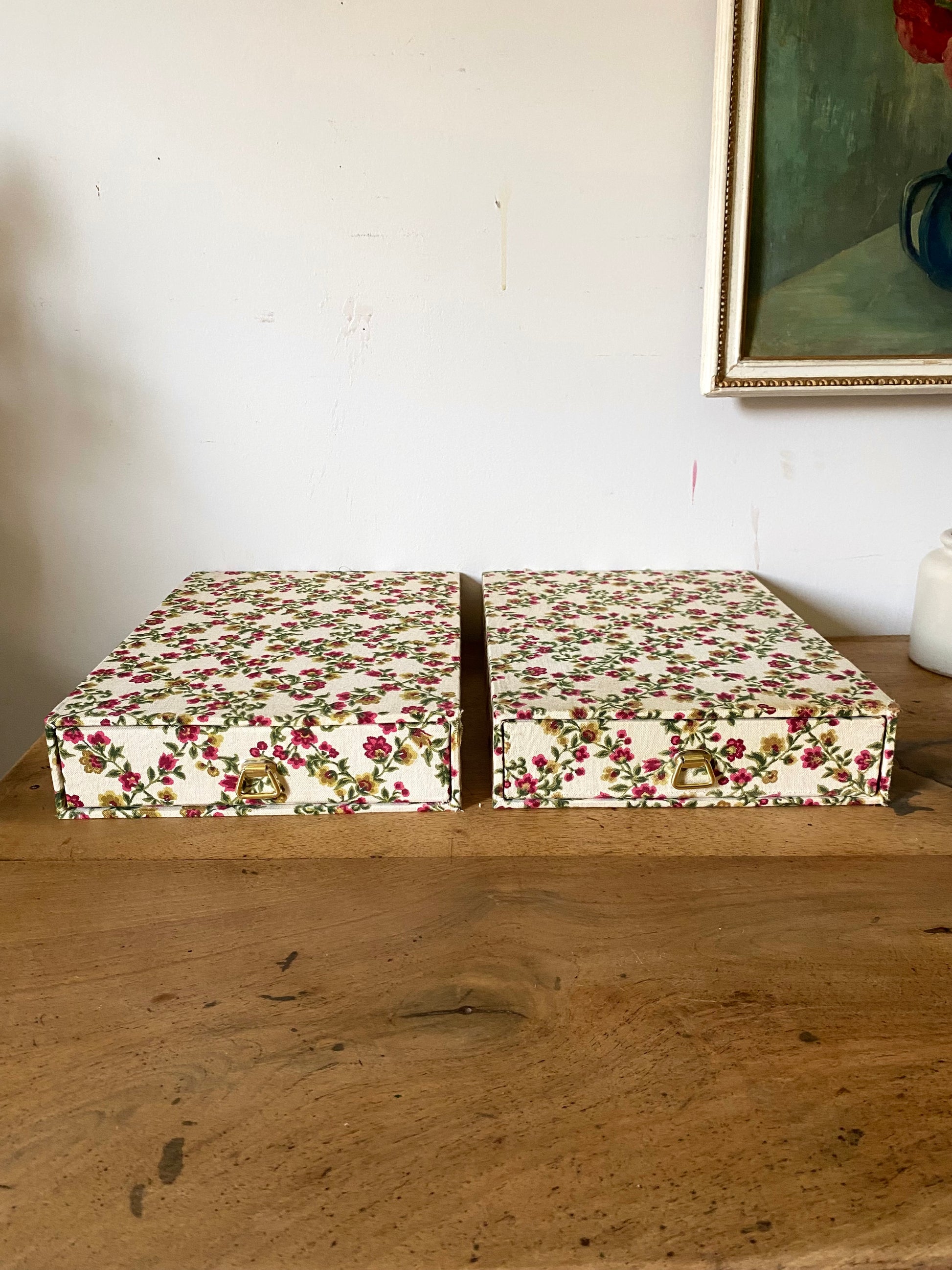 Ravissant duo de boîte de rangement en cartons recouvertes d’un très joli tissus ancien.