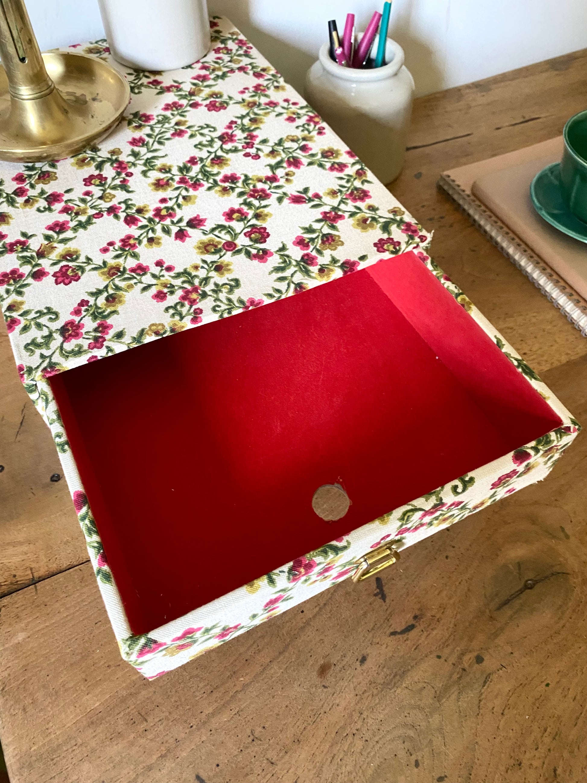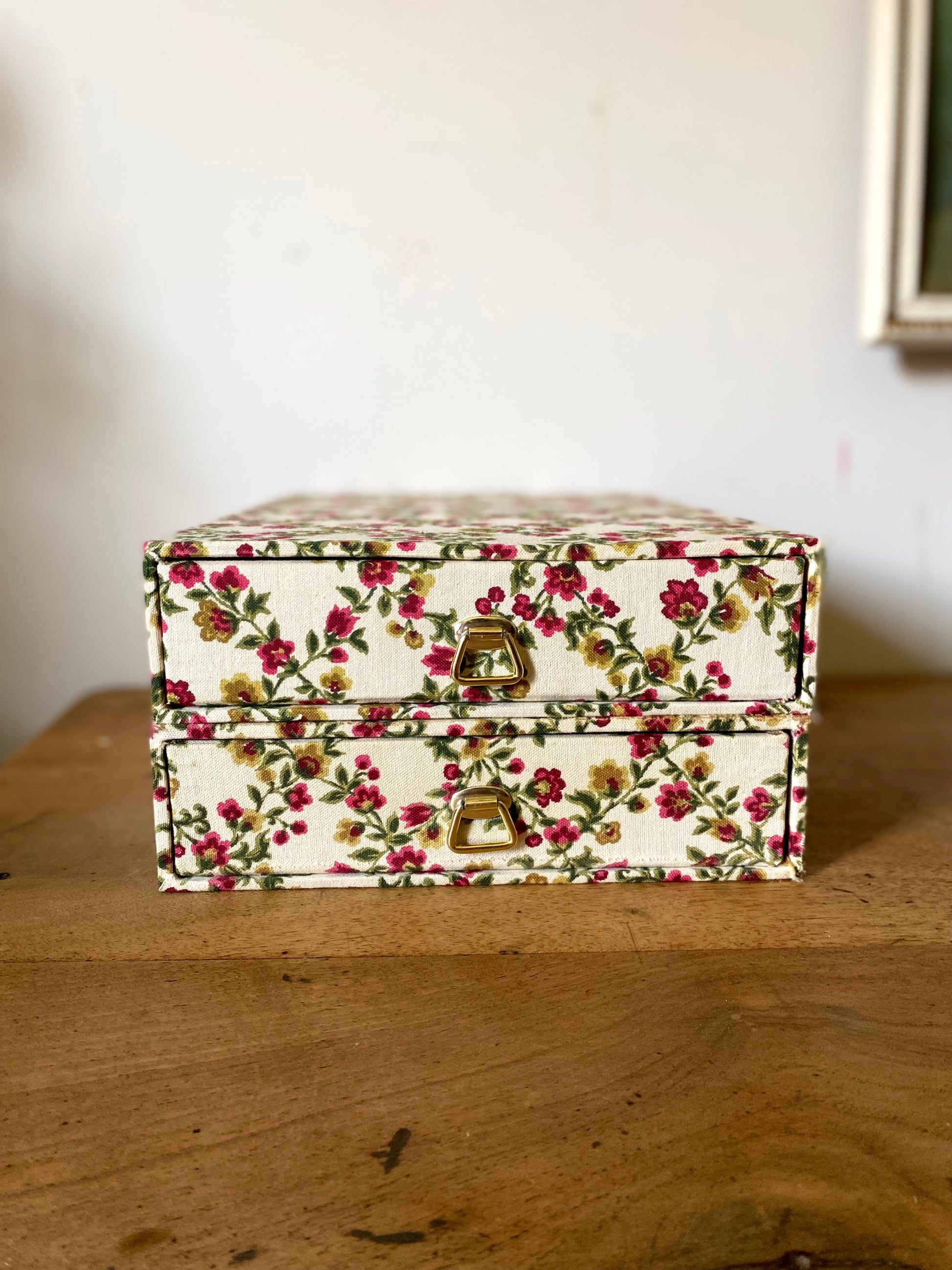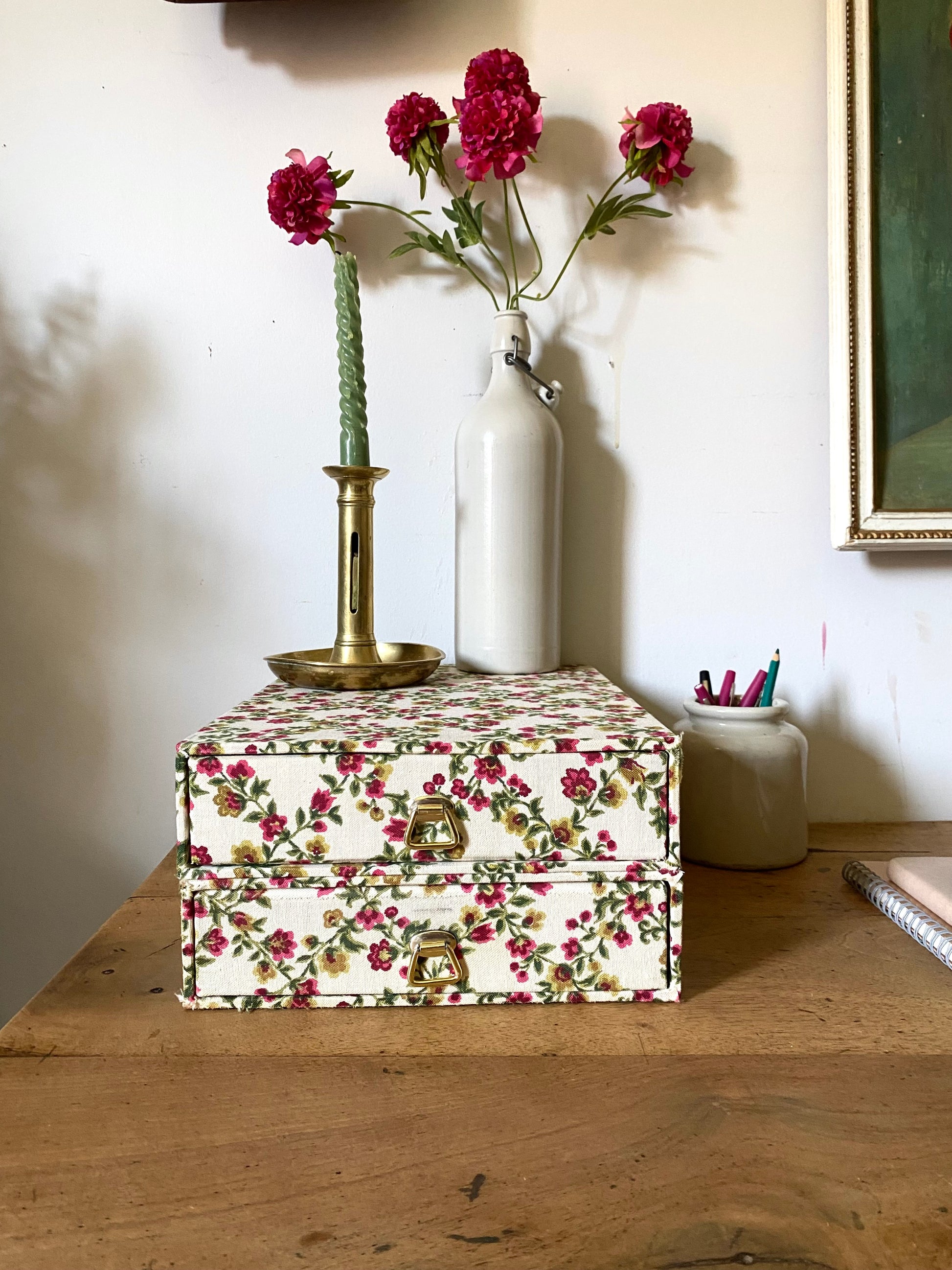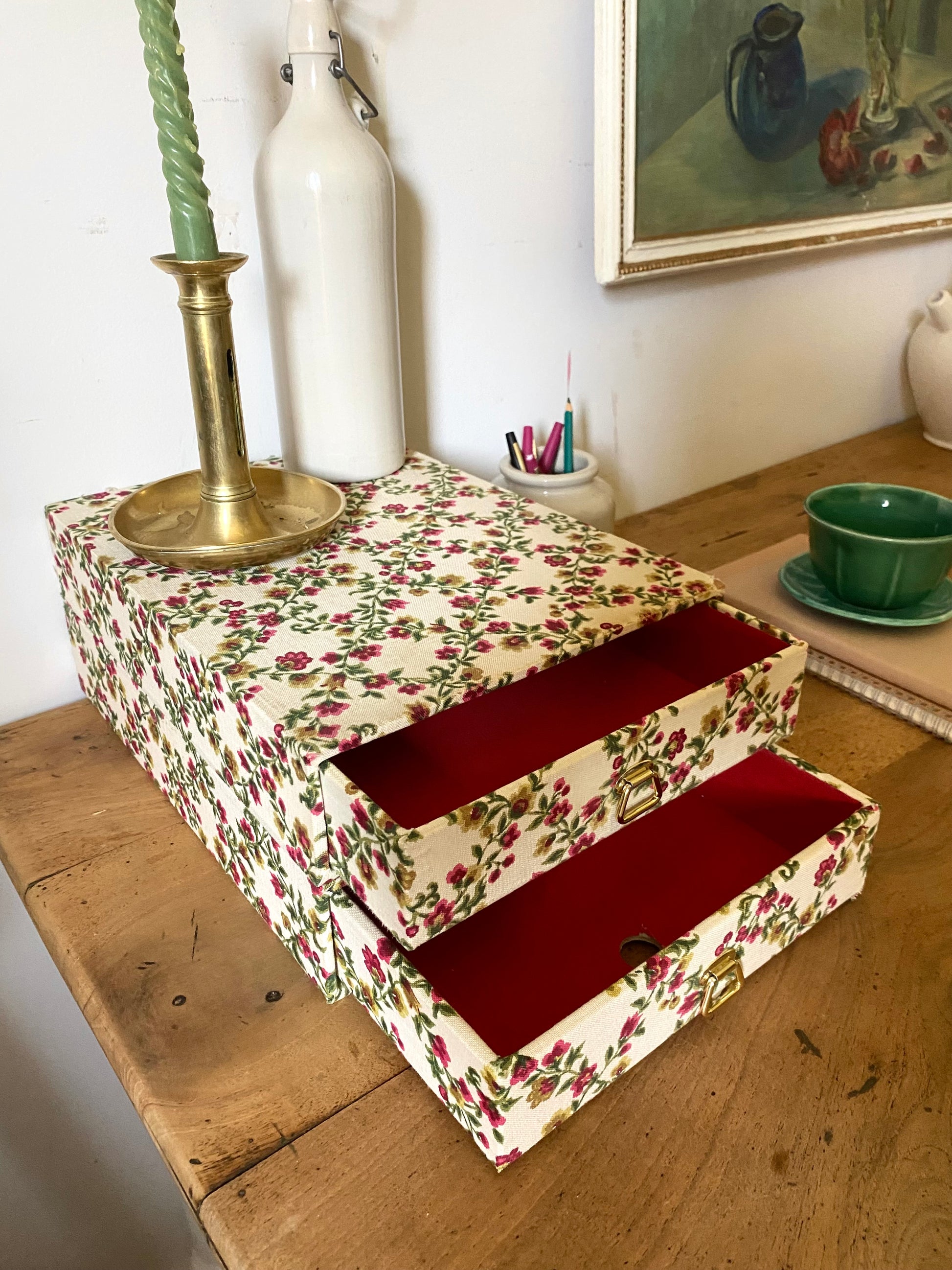 Ravissant duo de boîte de rangement en cartons recouvertes d’un très joli tissus ancien.