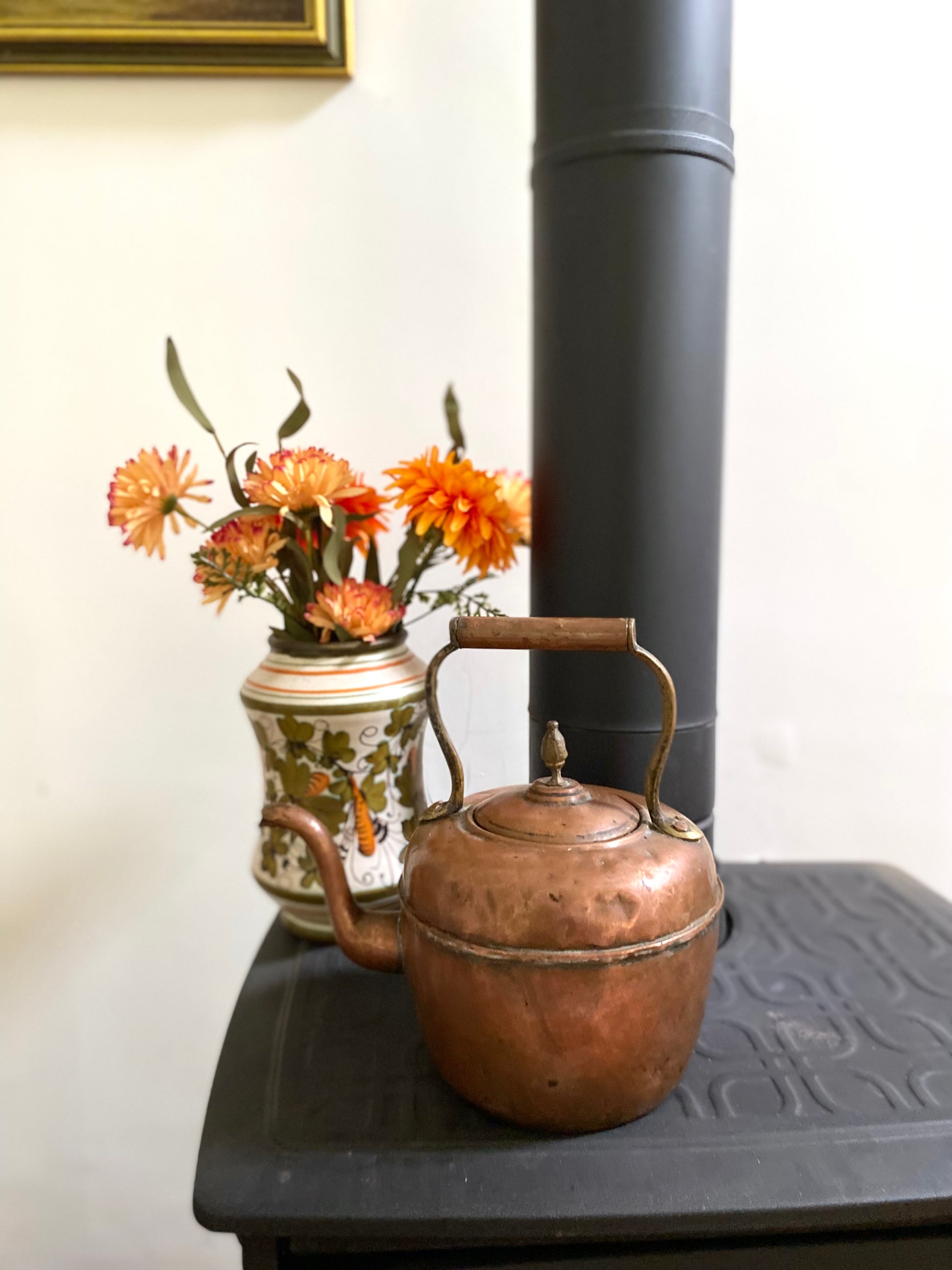La forme est bombée et arrondie, typique des bouilloires et théières utilisées traditionnellement, notamment sur des sources de chaleur comme des poêles à bois ou des réchauds.