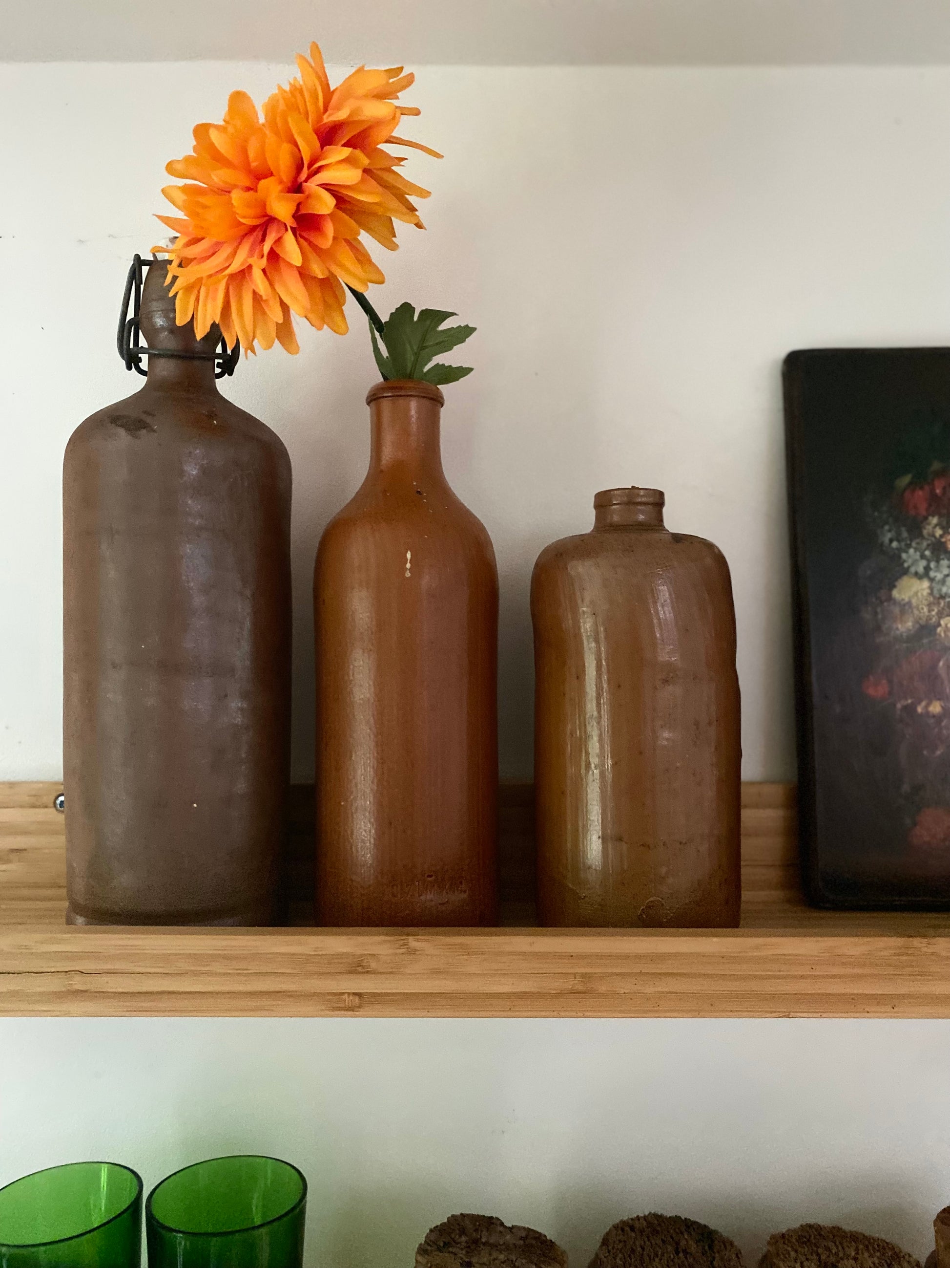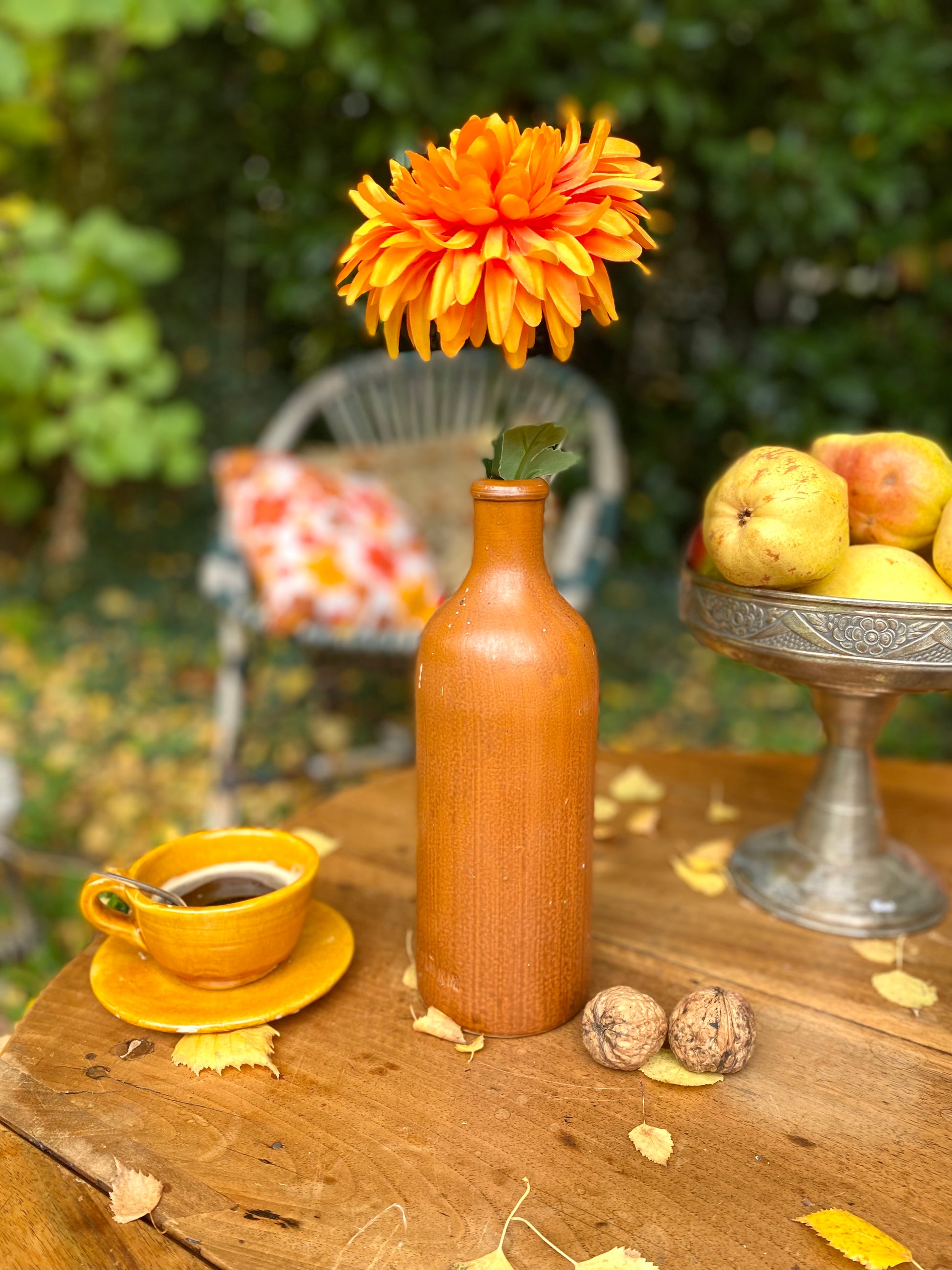 Adorable Bouteille en grès ancien d’une très jolie teinte caramel à détourner en vase