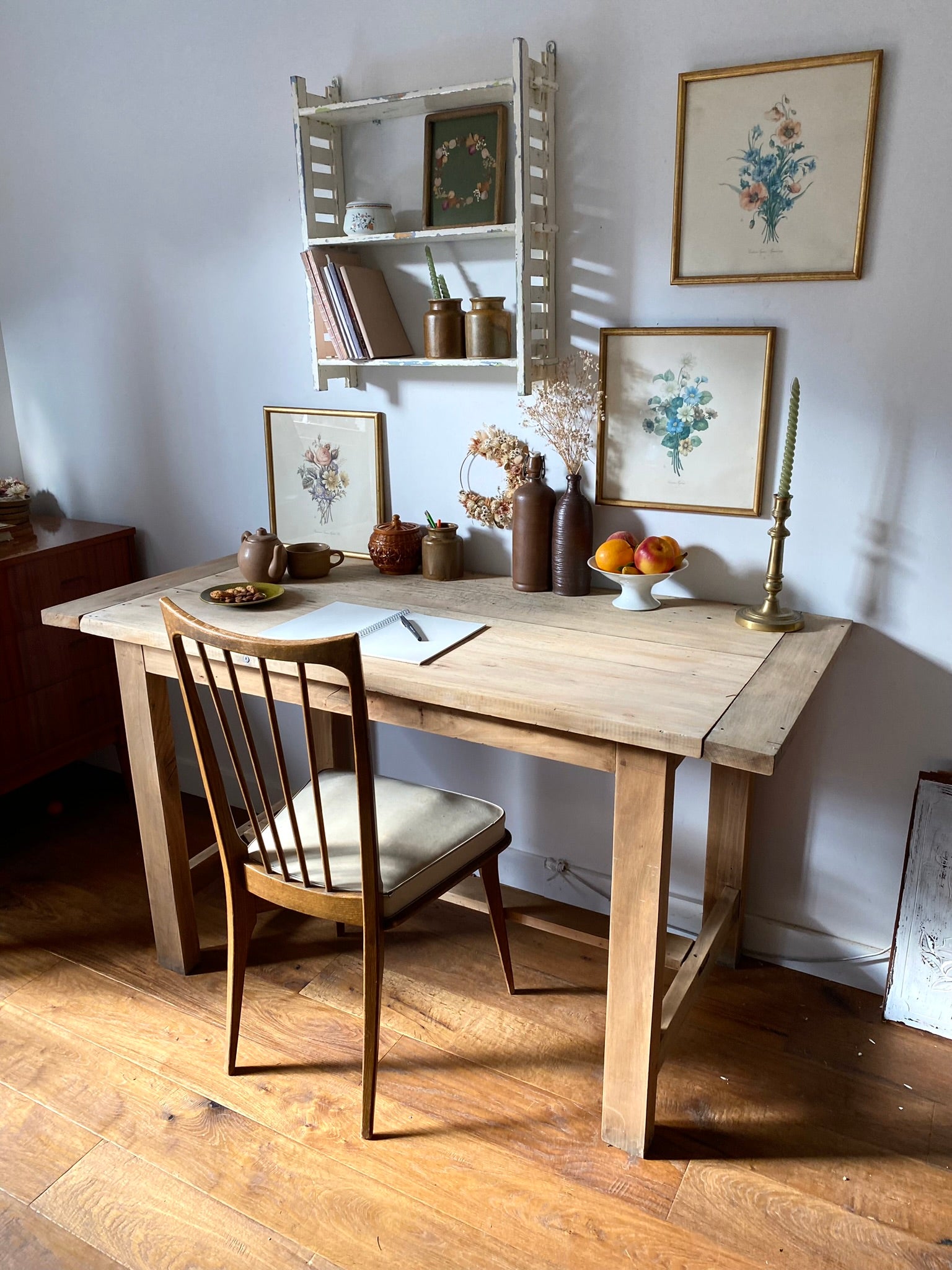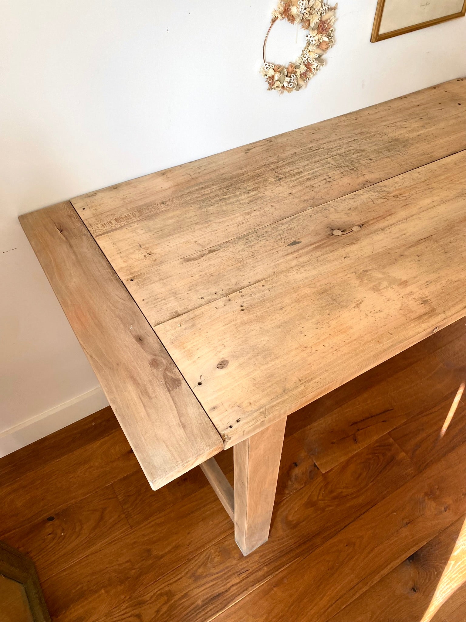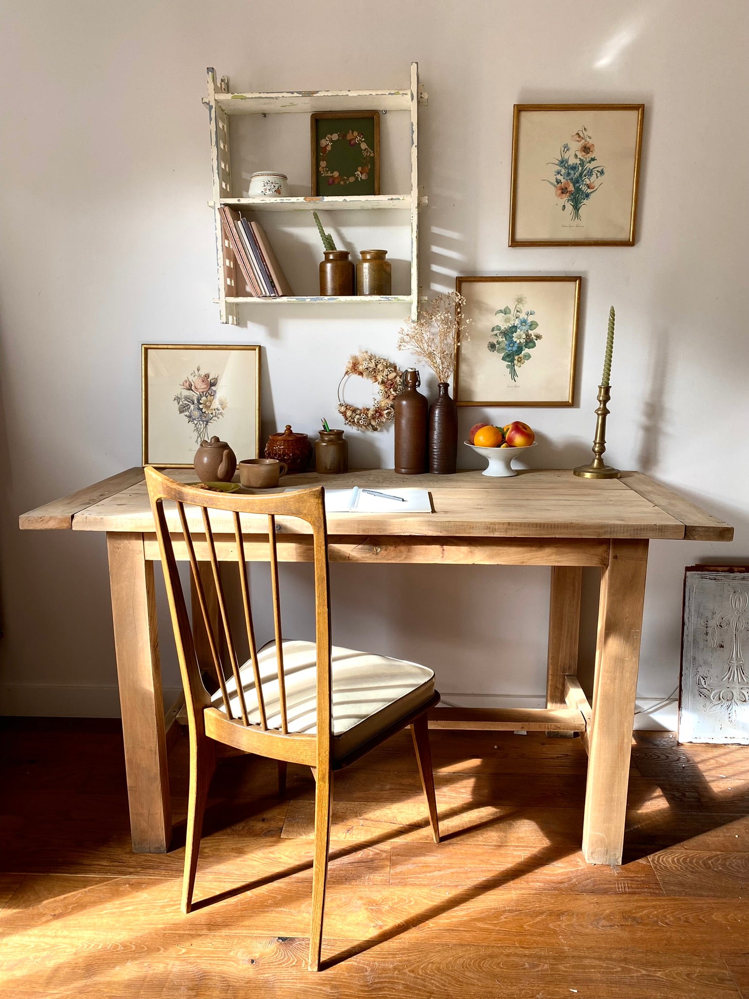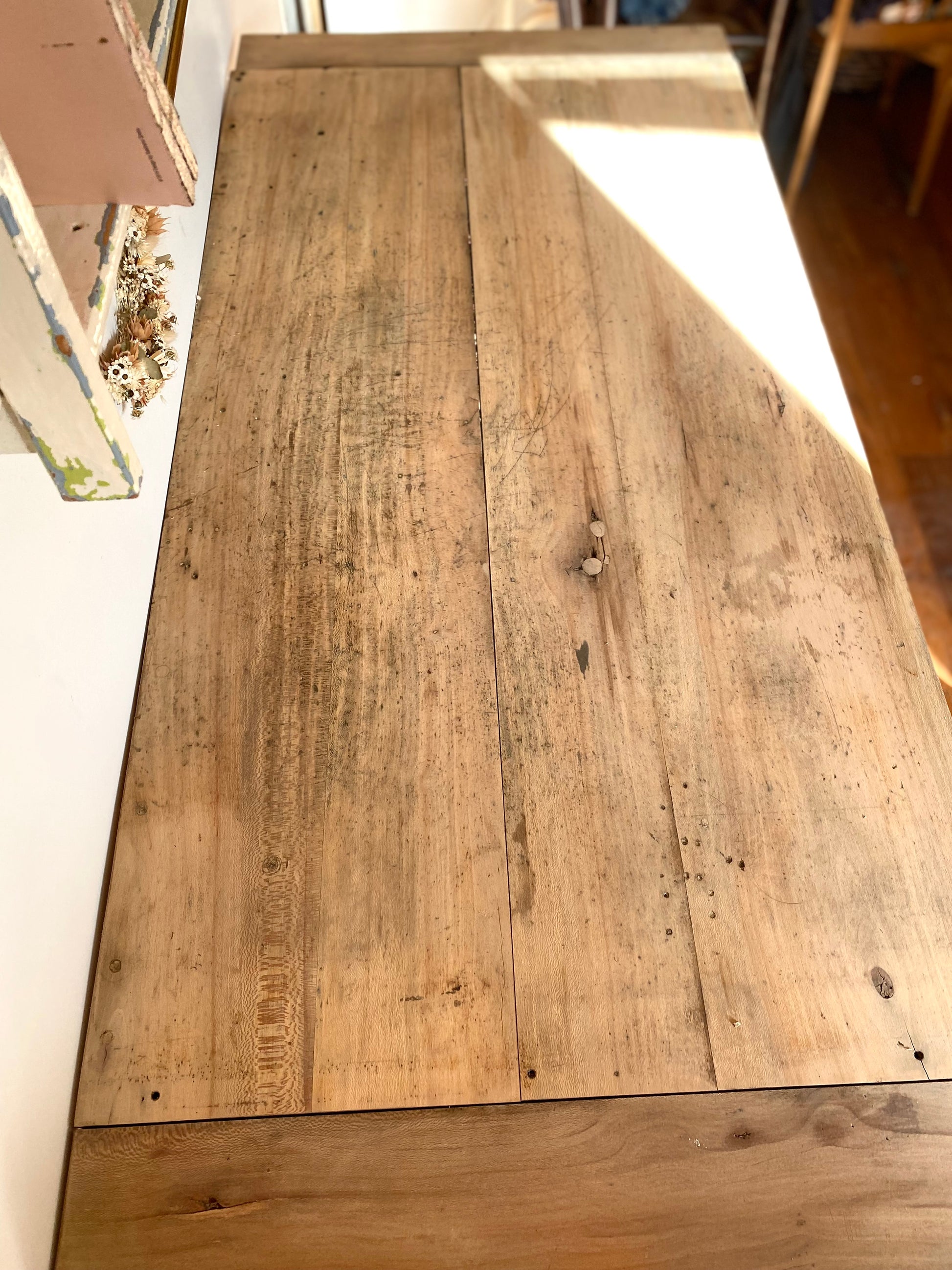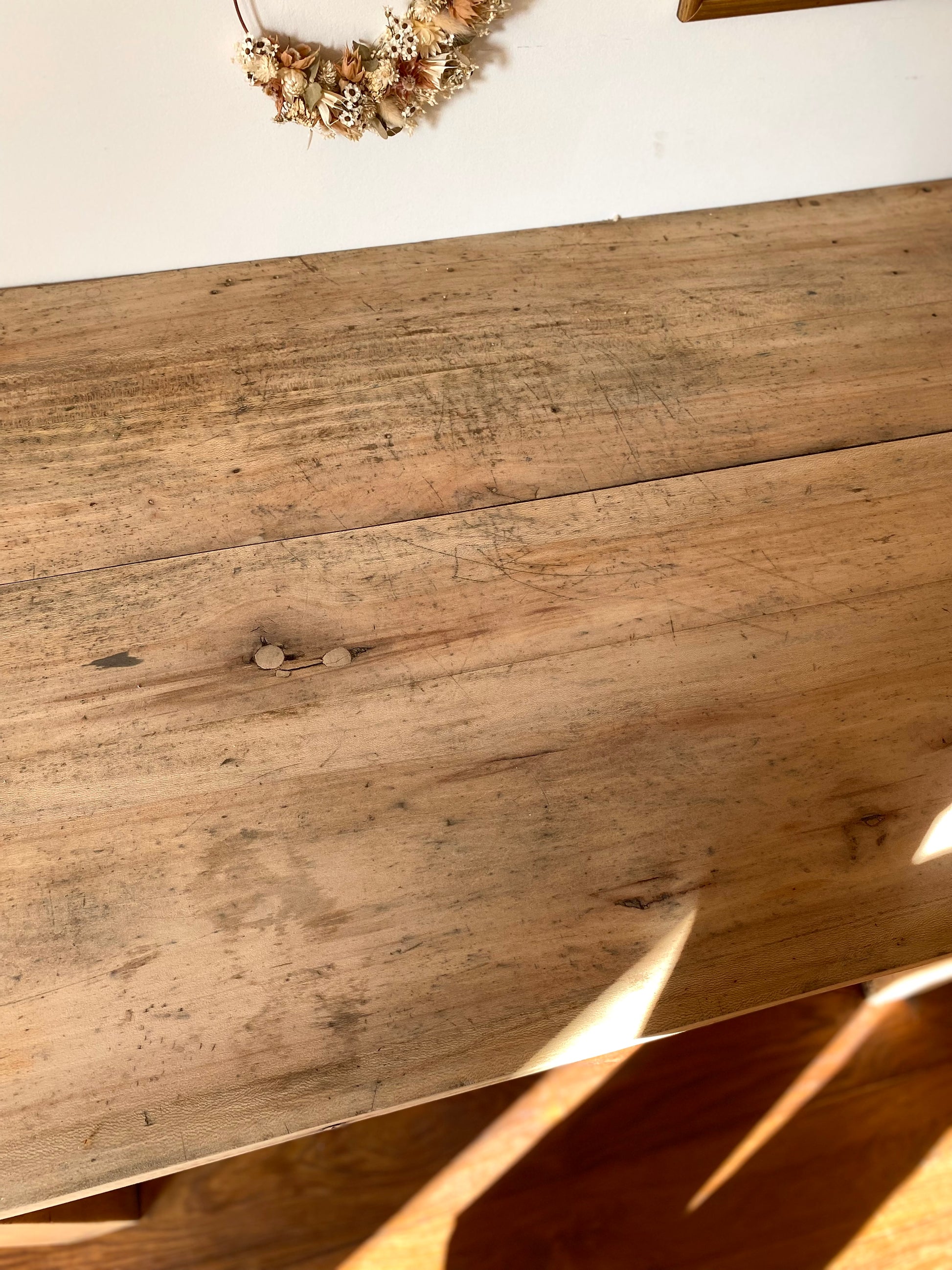 Il a été entièrement poncé et nettoyé mais le bois du plateau témoigne forcément de son ancienne vie d'atelier, ce qui lui donne tout son charme!