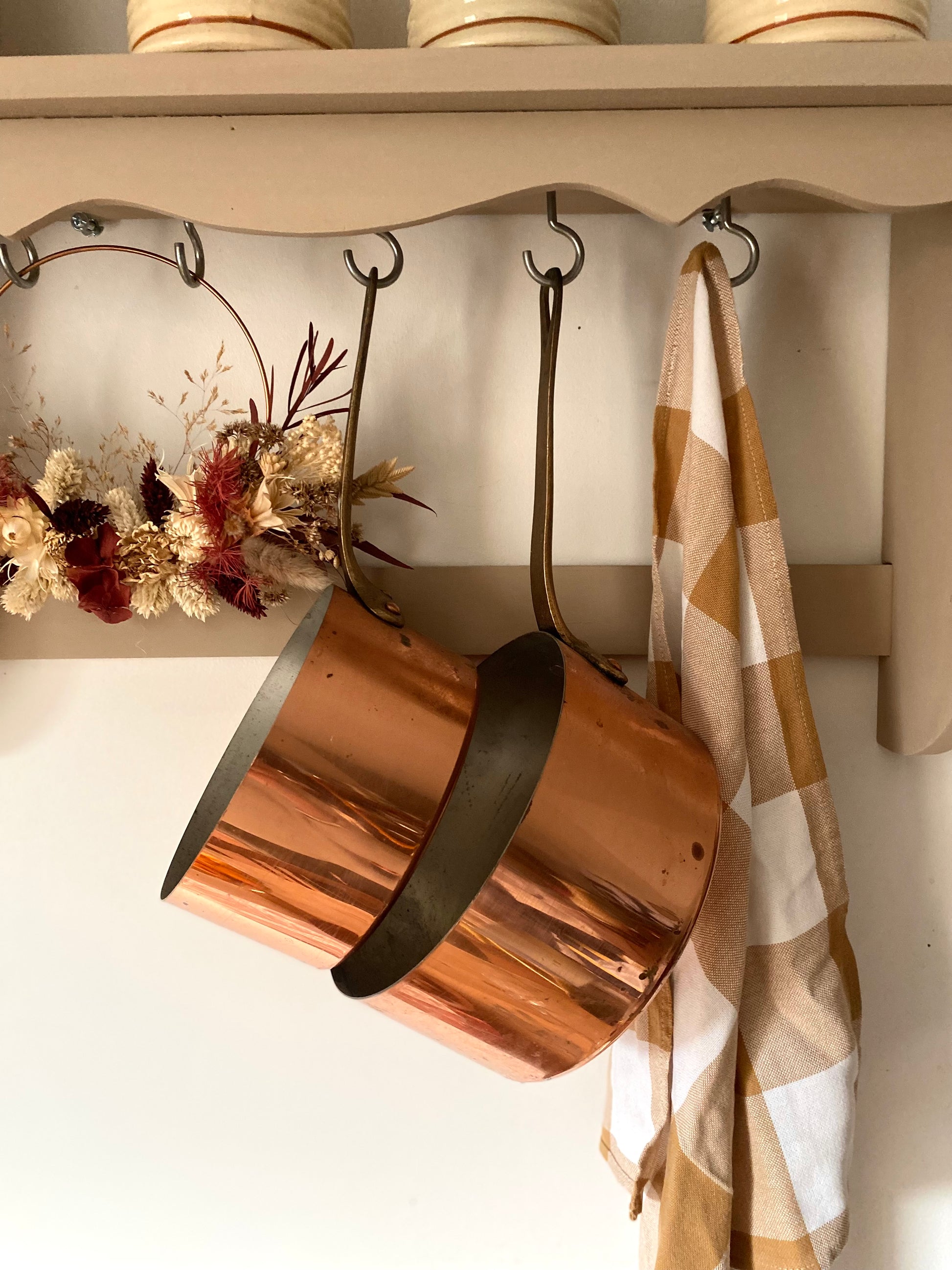 Les poignées sont longues et sont fixées par des rivets. Elles sont en laiton, un alliage qui contraste joliment avec la couleur chaude du cuivre. Elles sont un signe d'ustensile de cuisine de haute qualité, souvent destiné à un usage professionnel ou à la grande bourgeoisie.