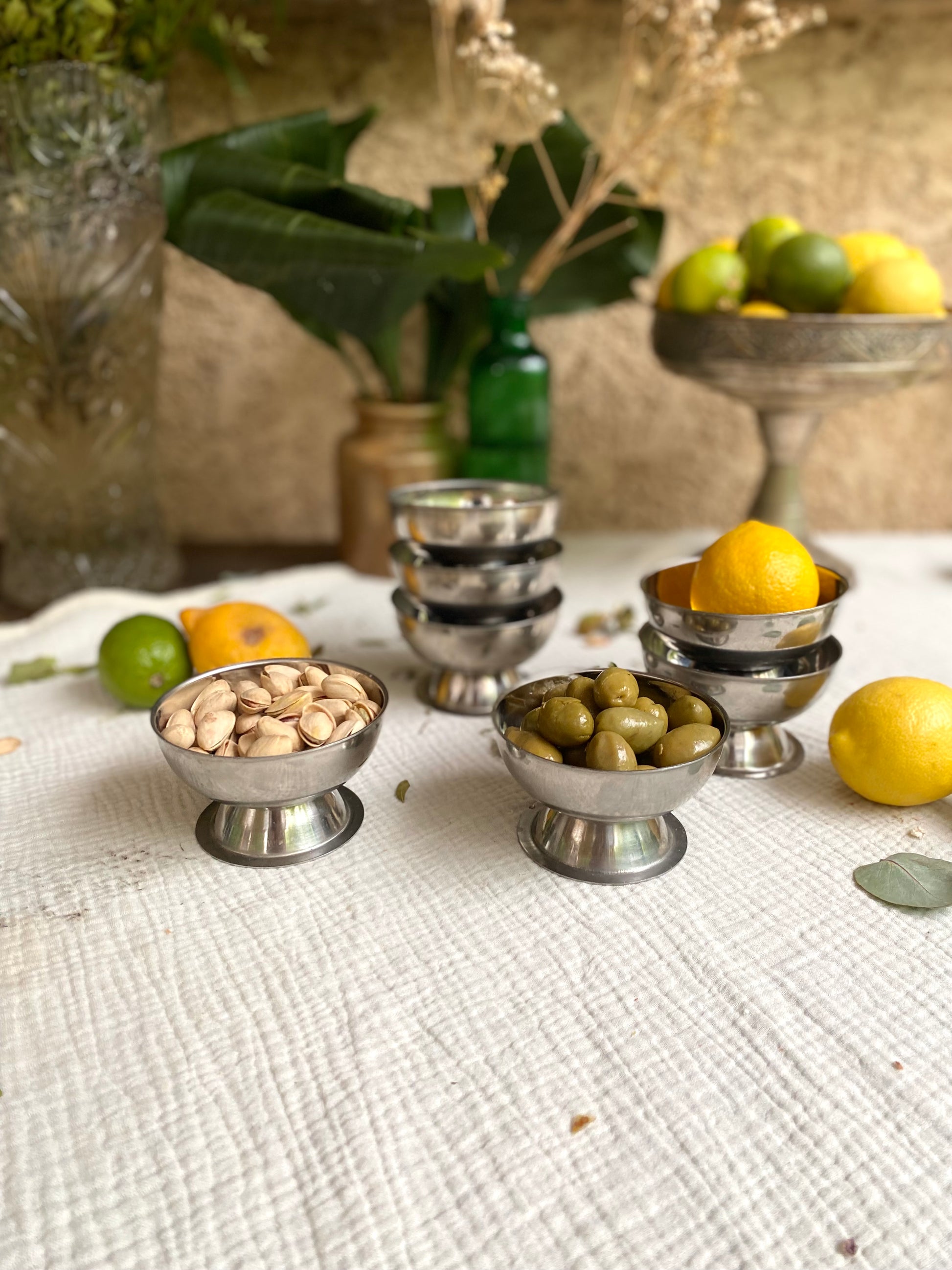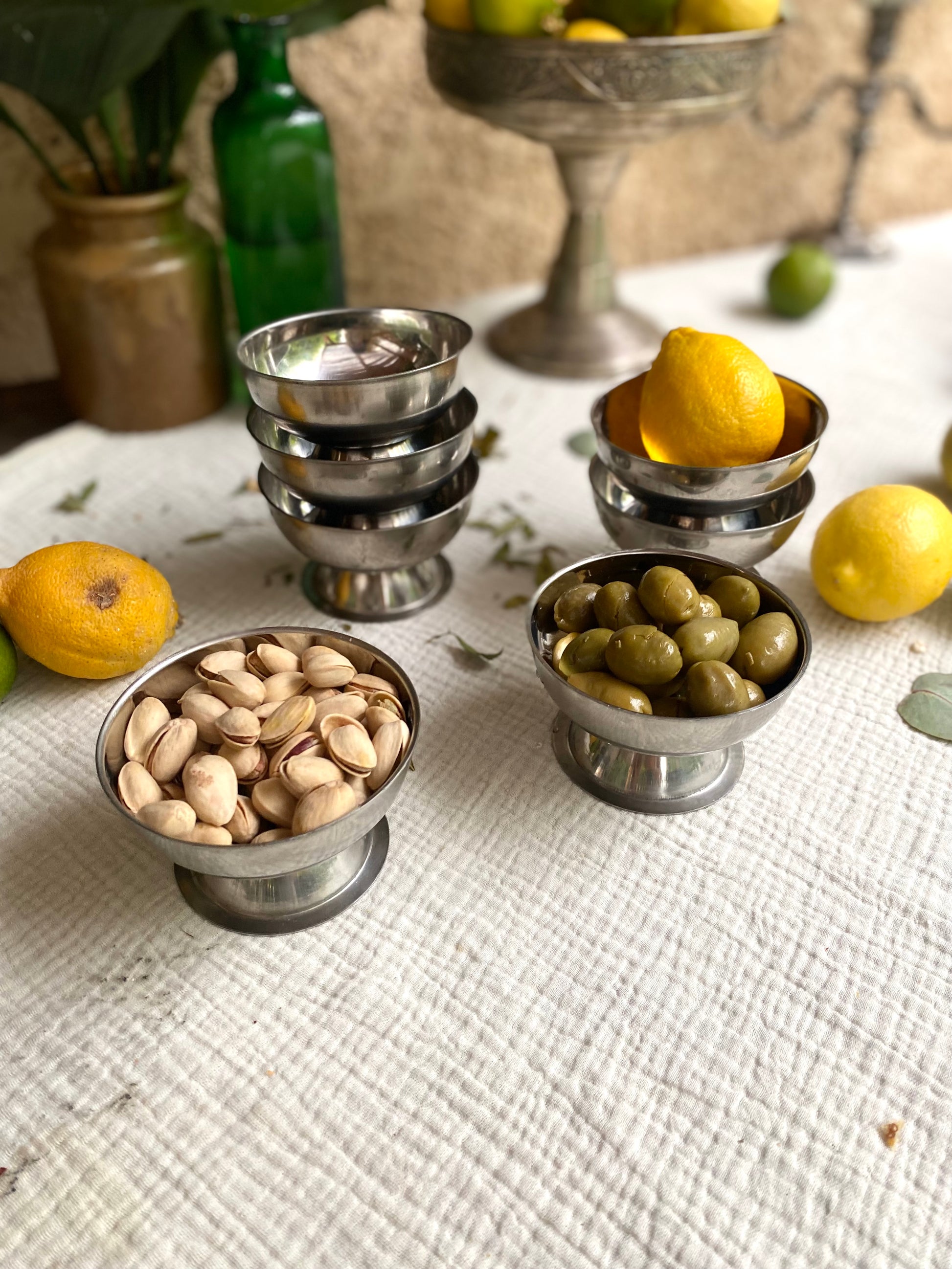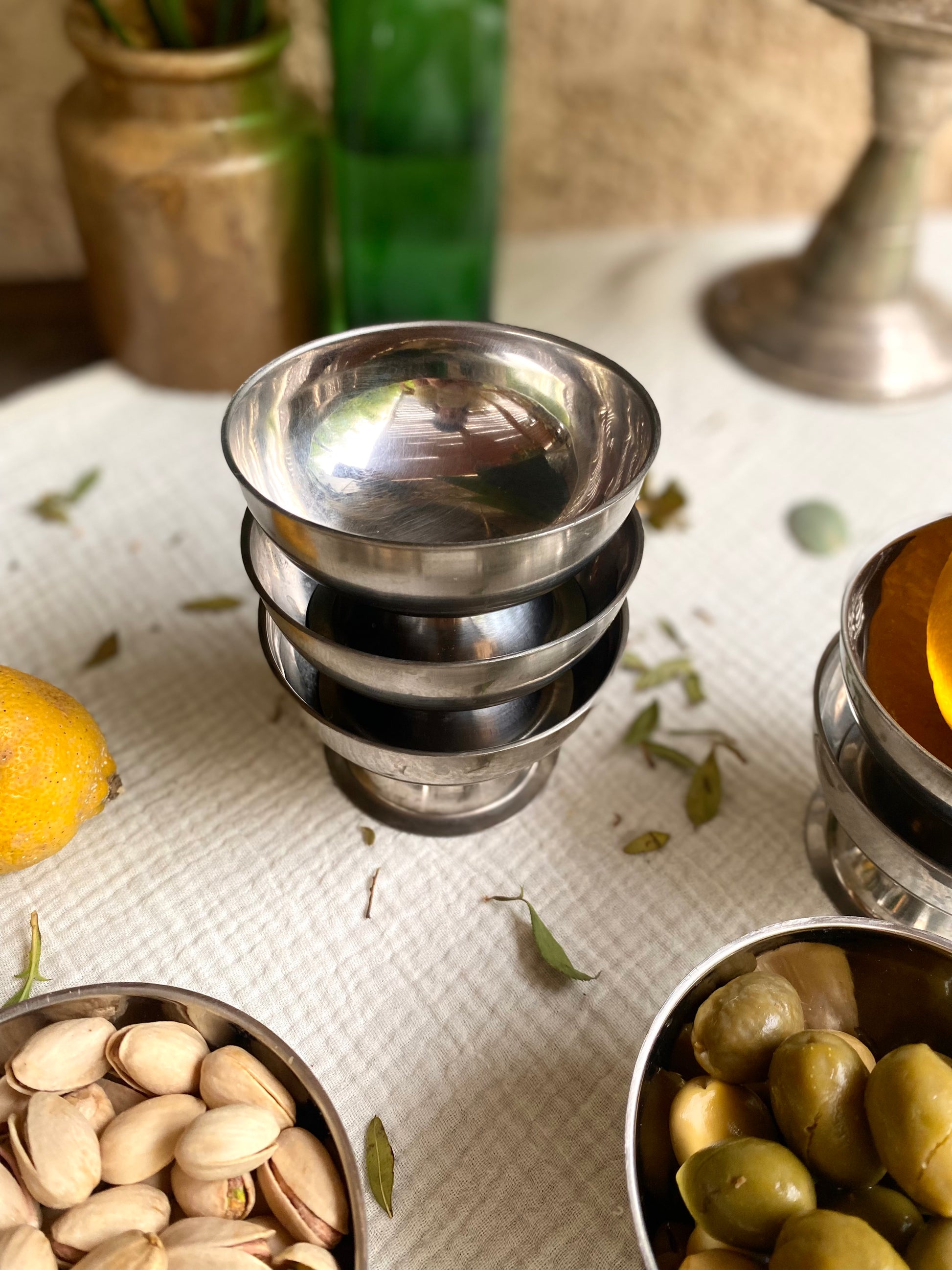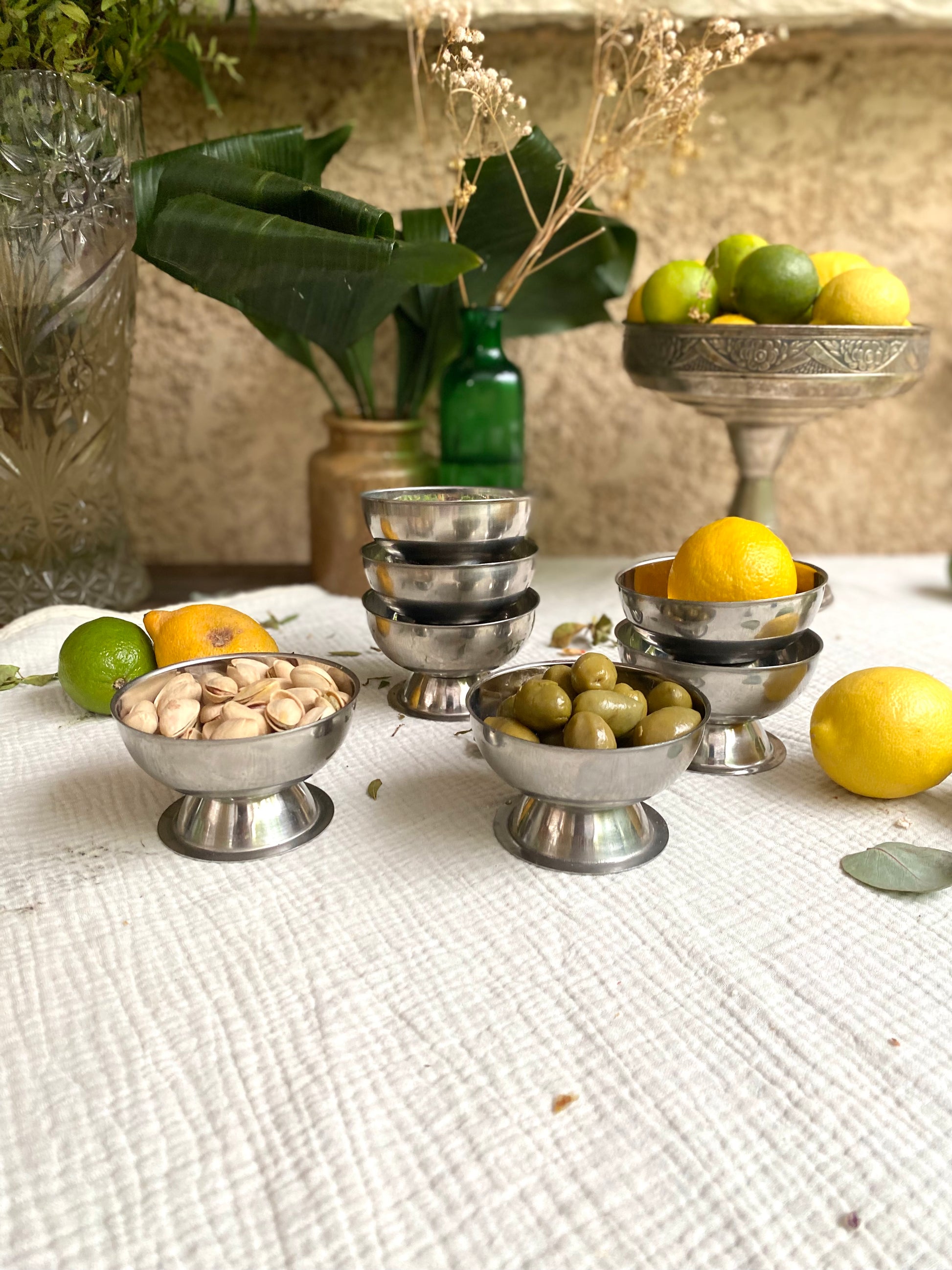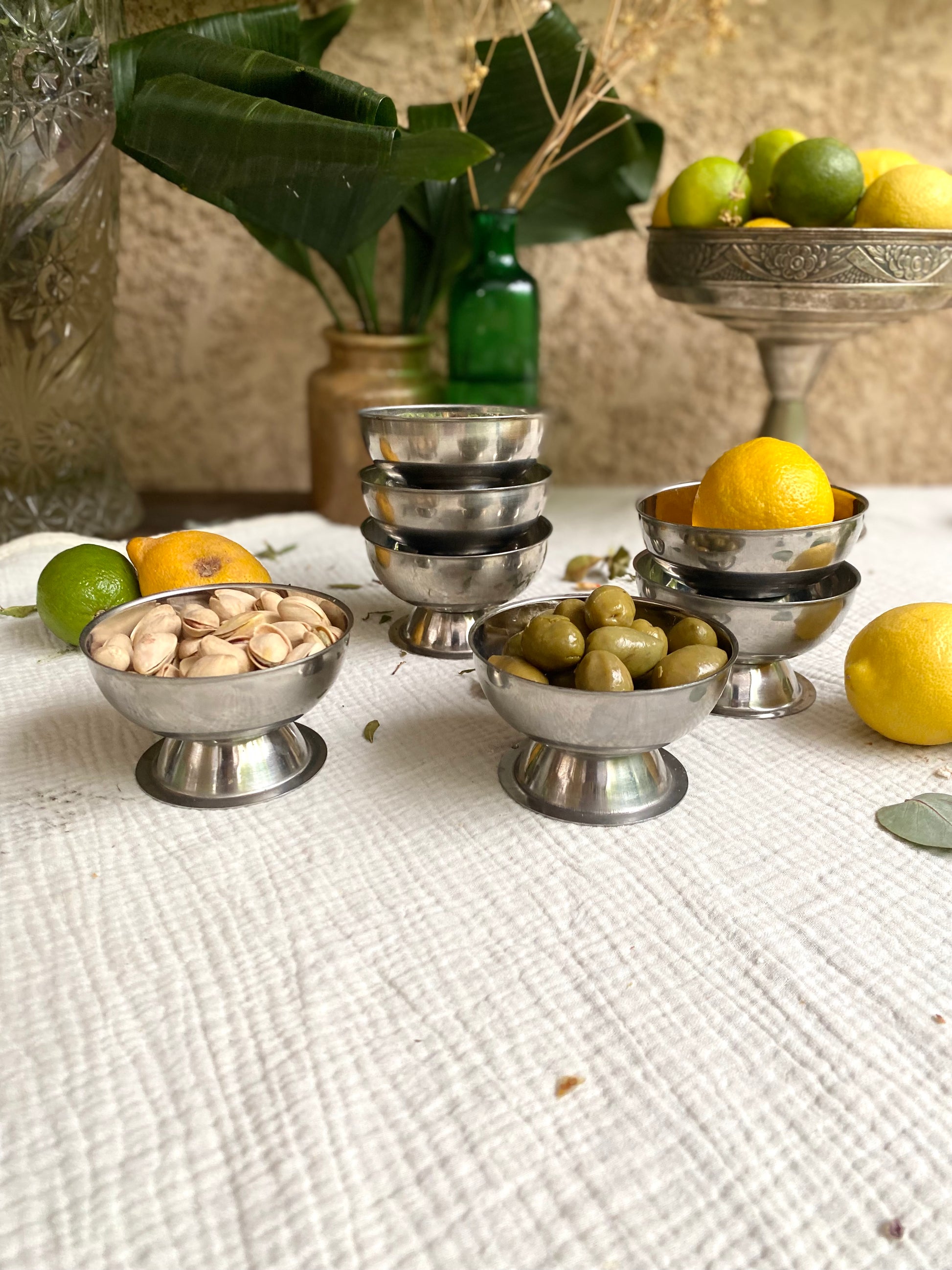 Service de 7 coupes à glaces en inox ancien que j’aime beaucoup détourner en coupelle pour présenter les olives, les cacahuète ou le houmous ;)