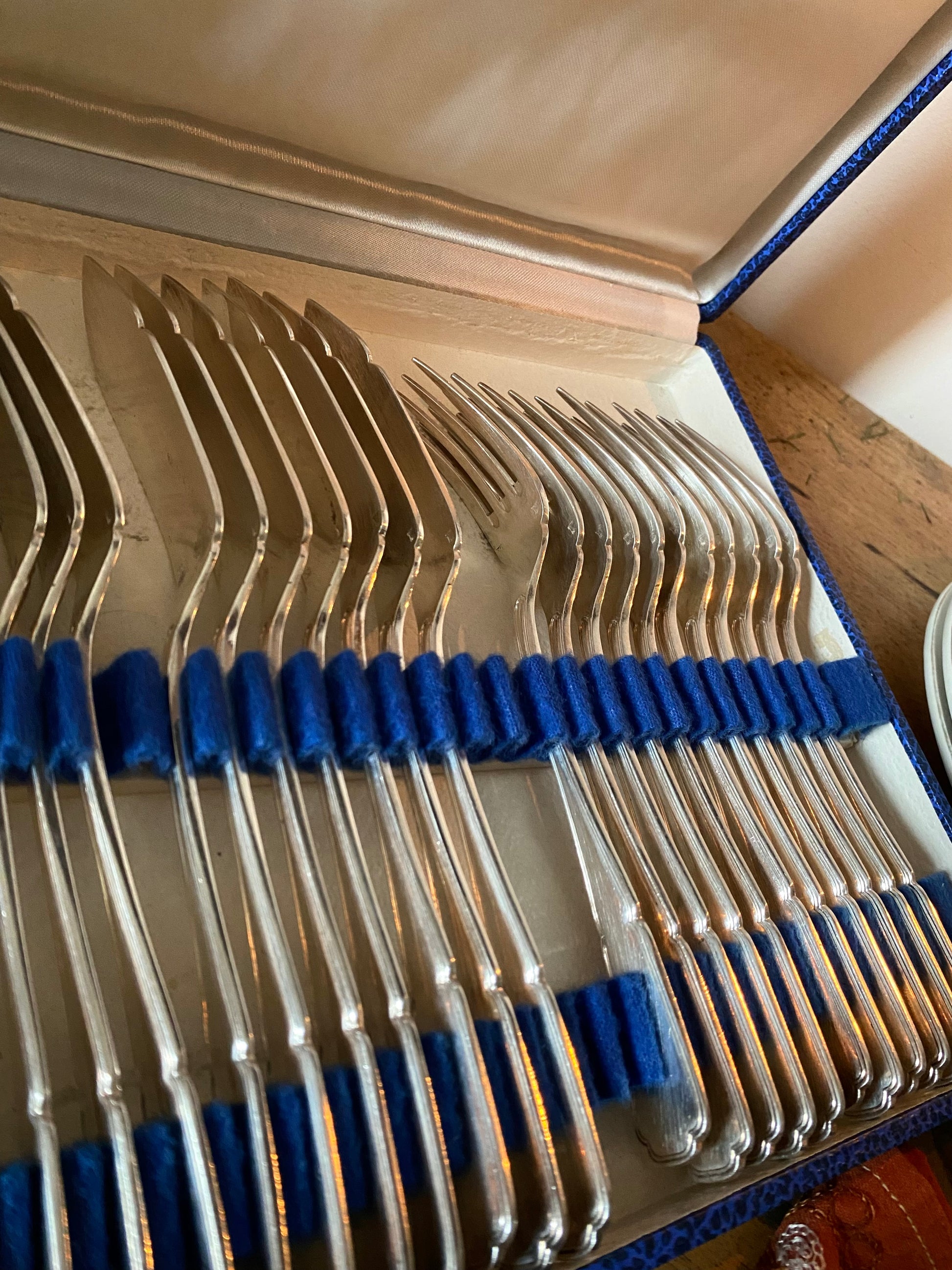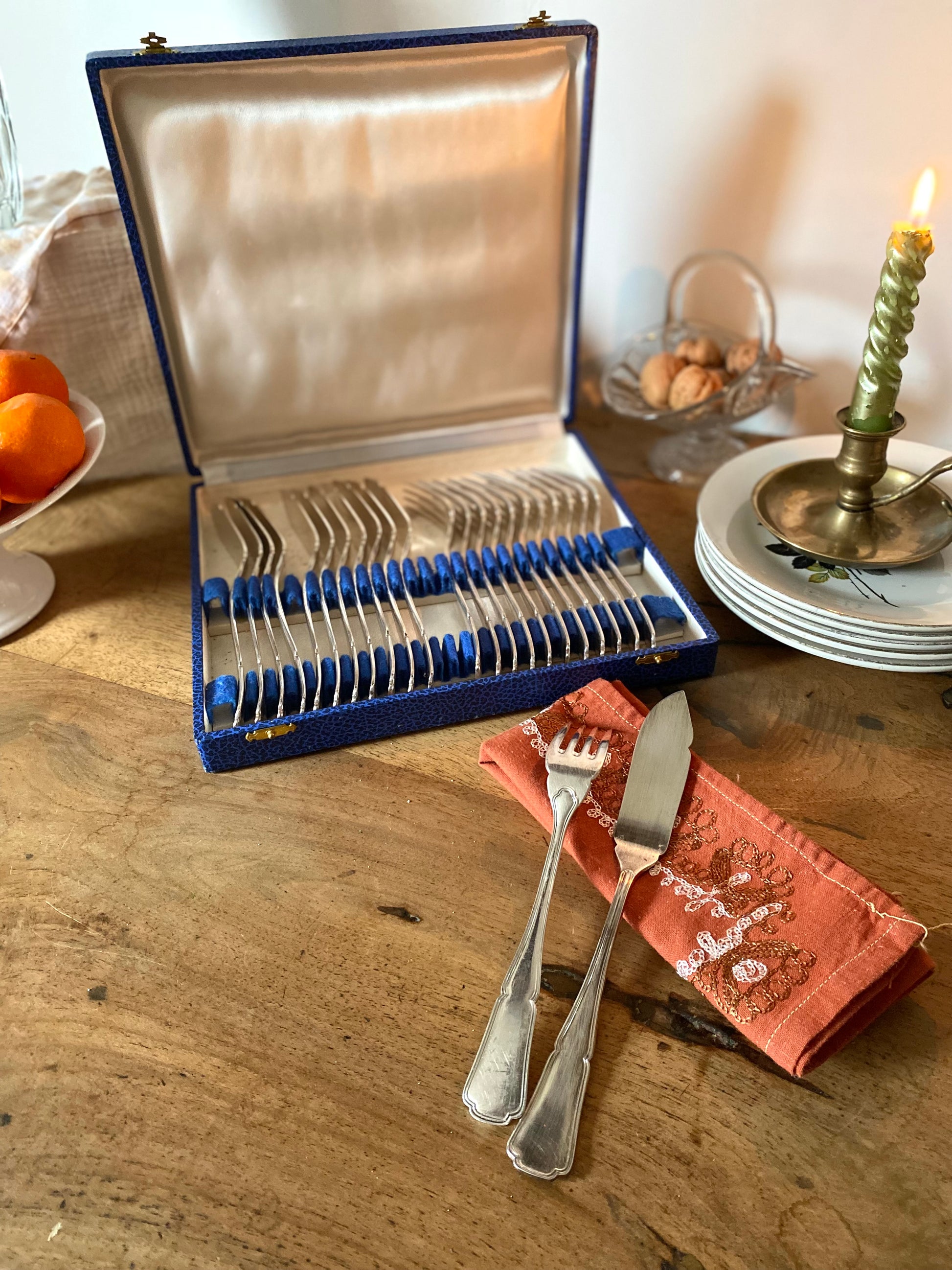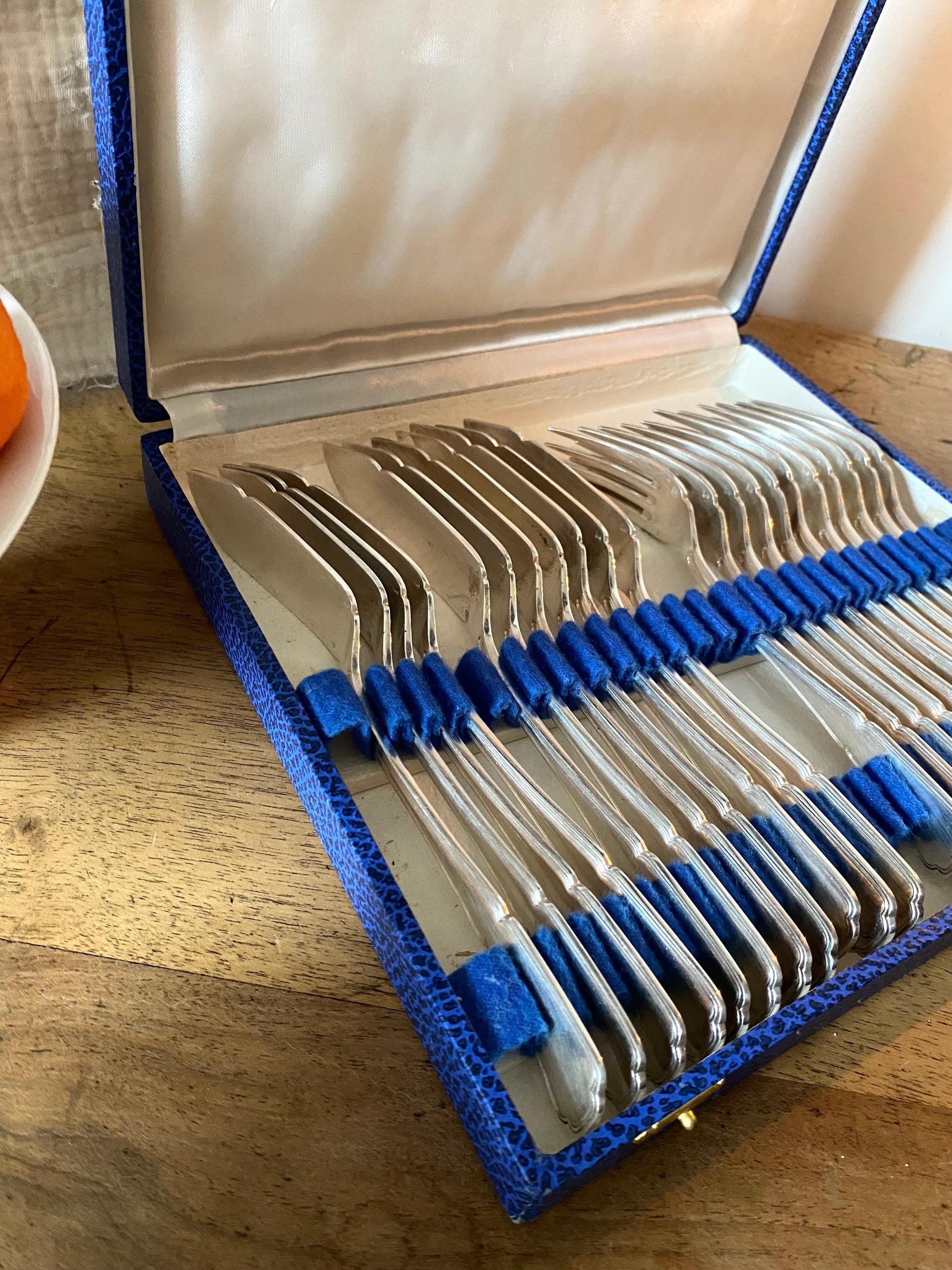Service de couverts à poisson complet, comprenant 12 couteaux et 12 fourchettes (soit 24 pièces au total) datant de 1930.
