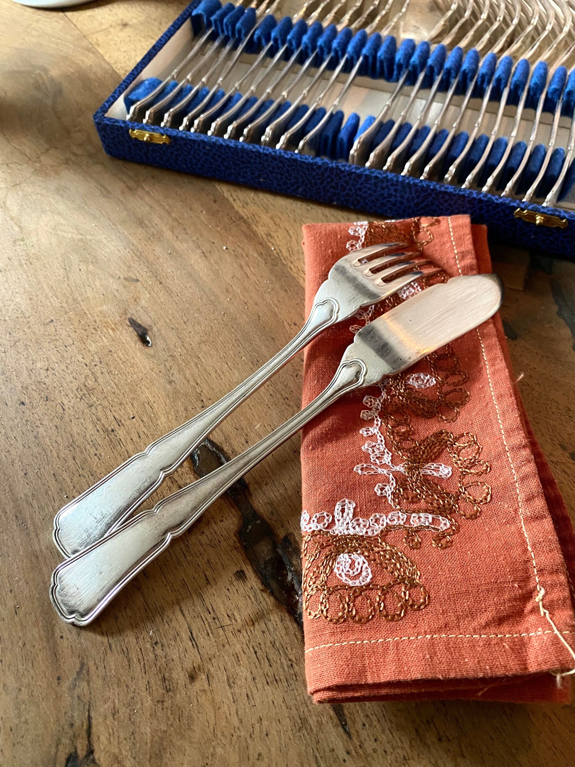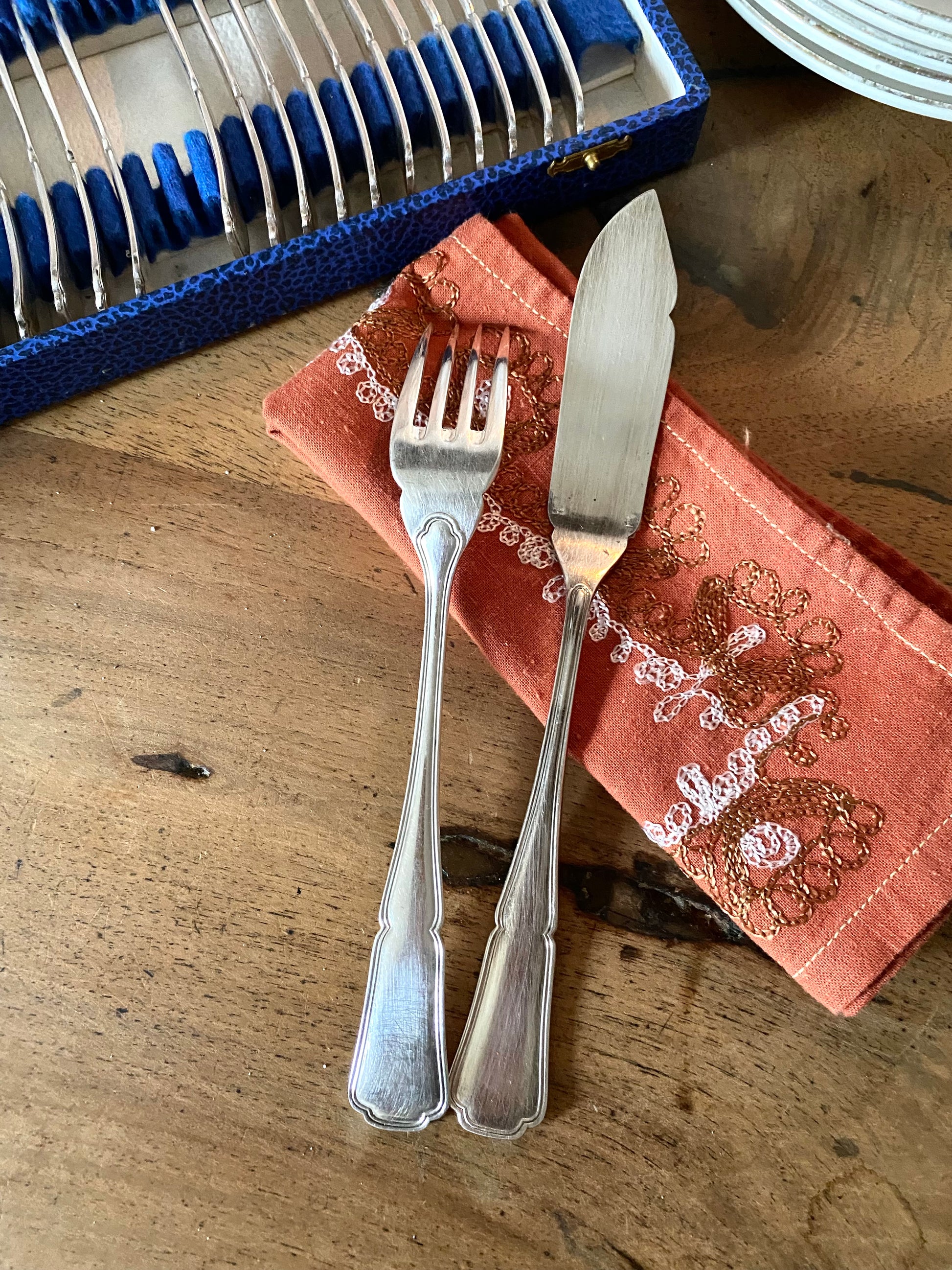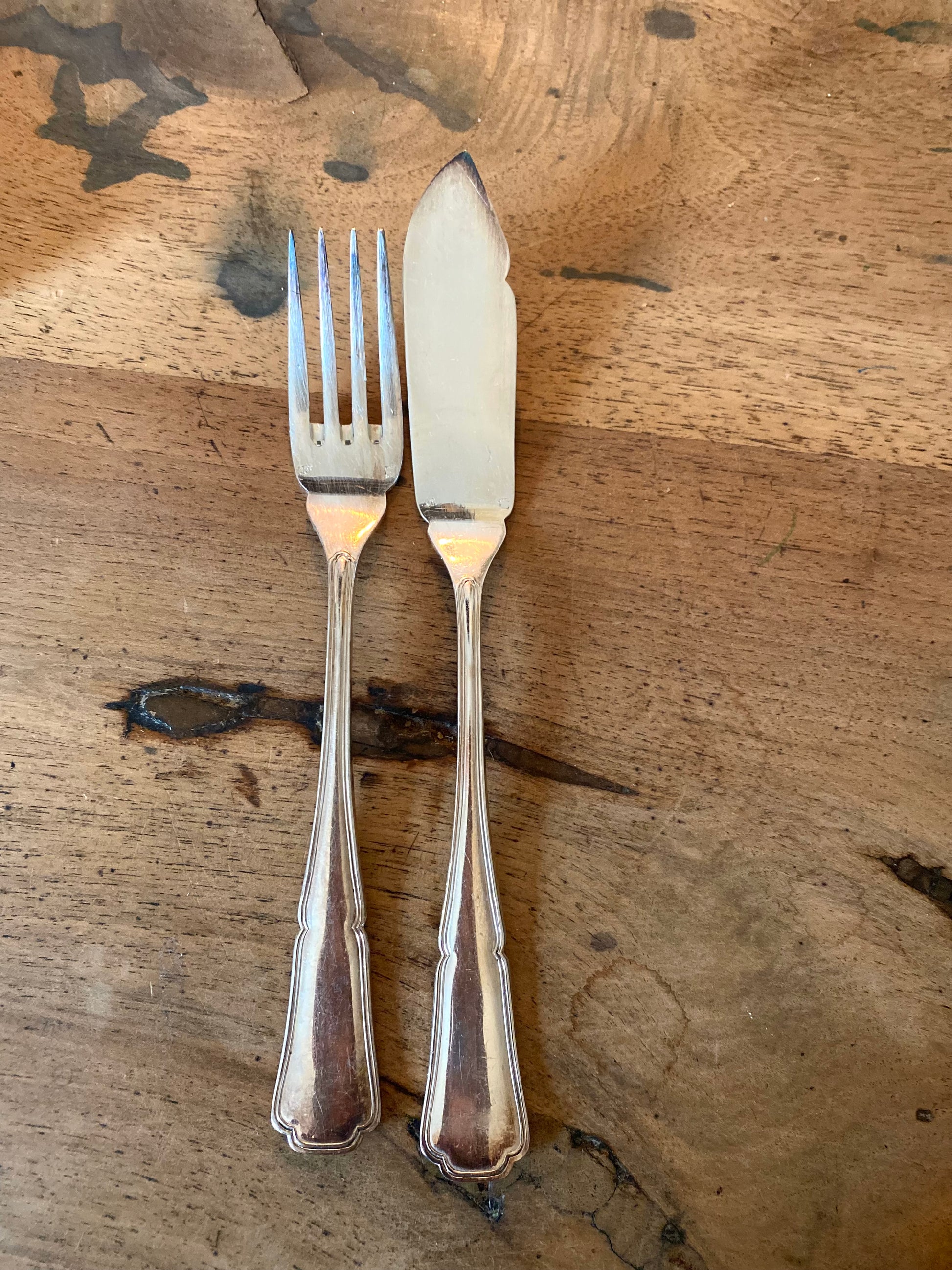 Service de couverts à poisson complet, comprenant 12 couteaux et 12 fourchettes (soit 24 pièces au total) datant de 1930.