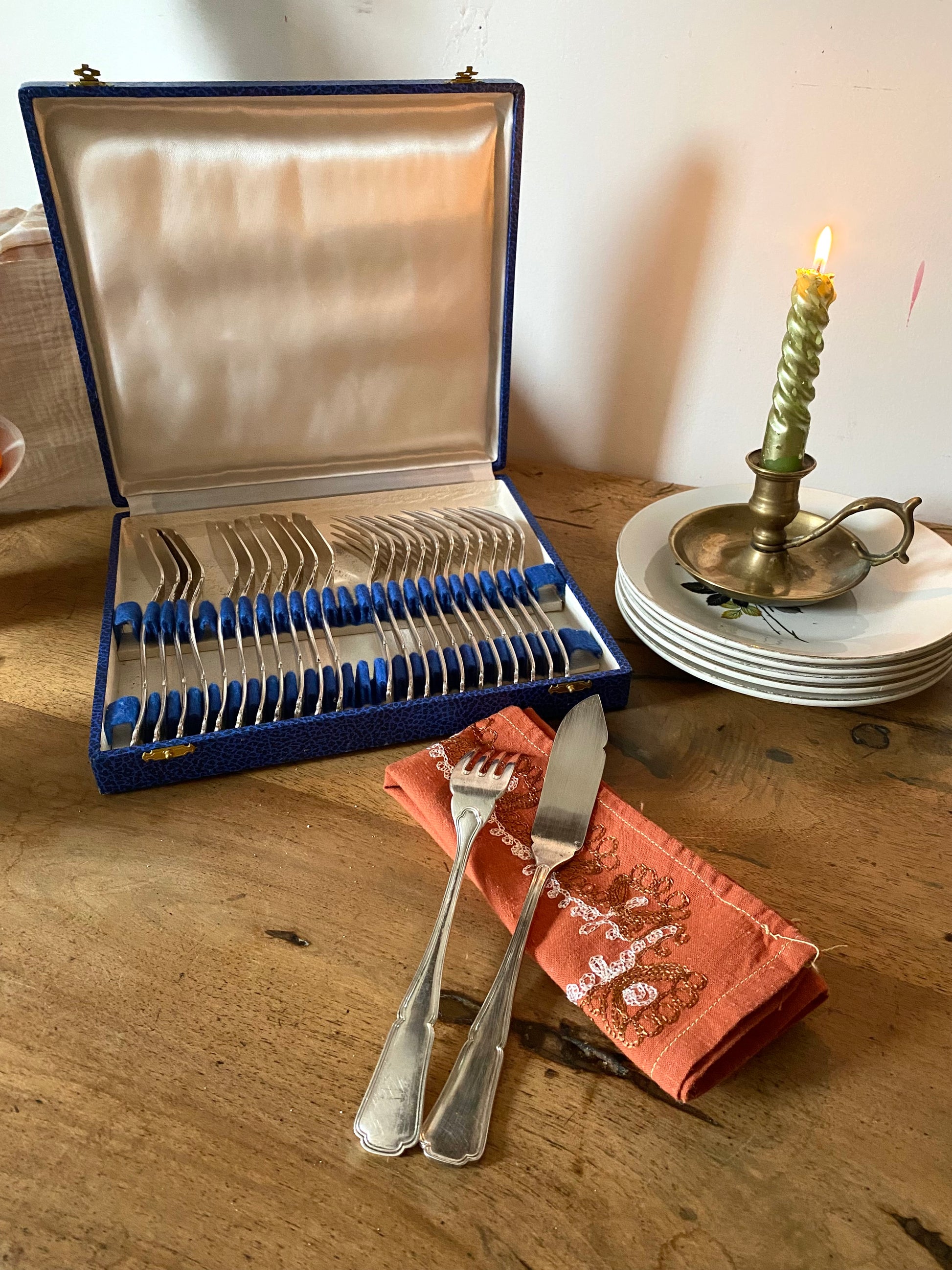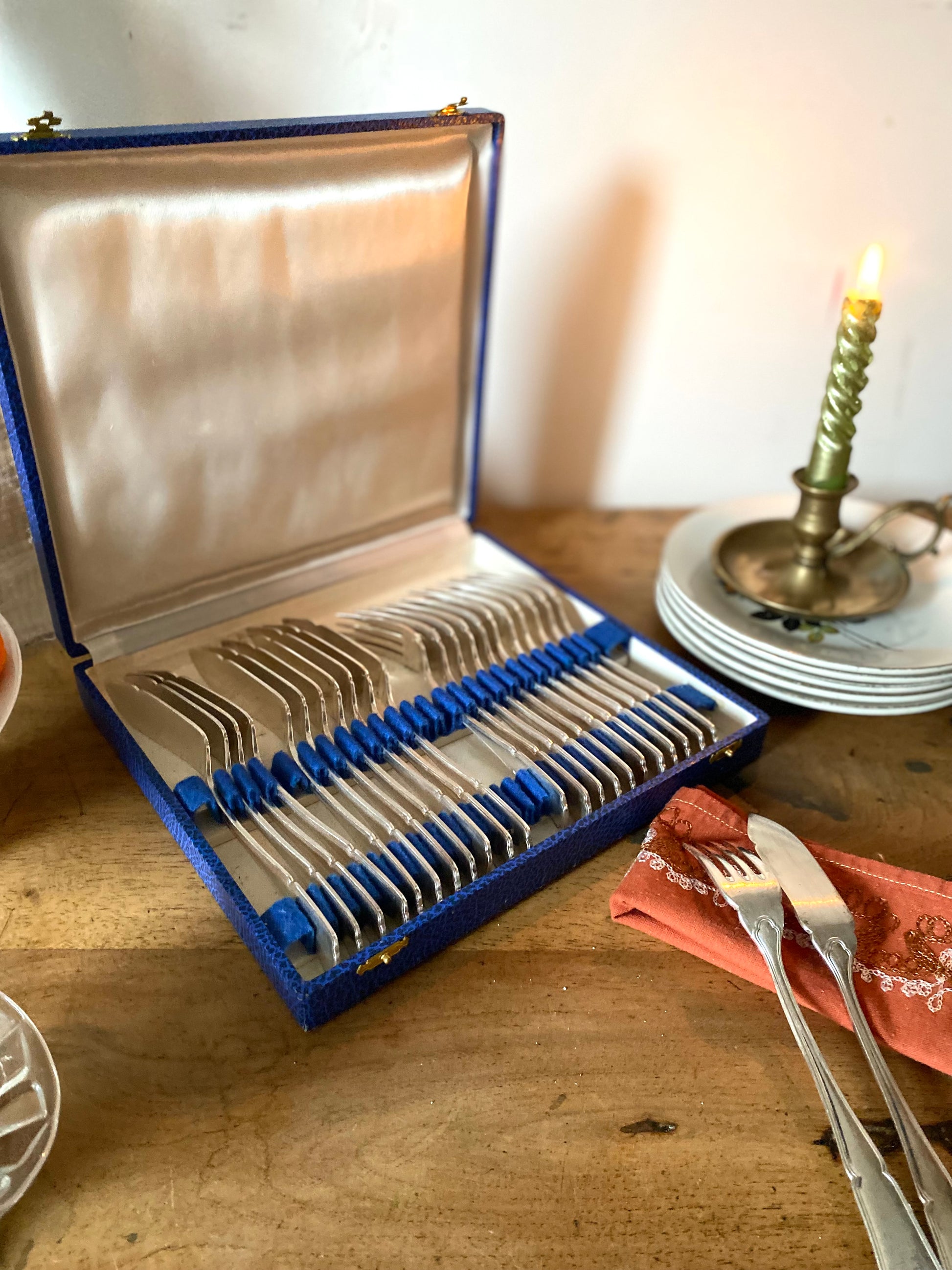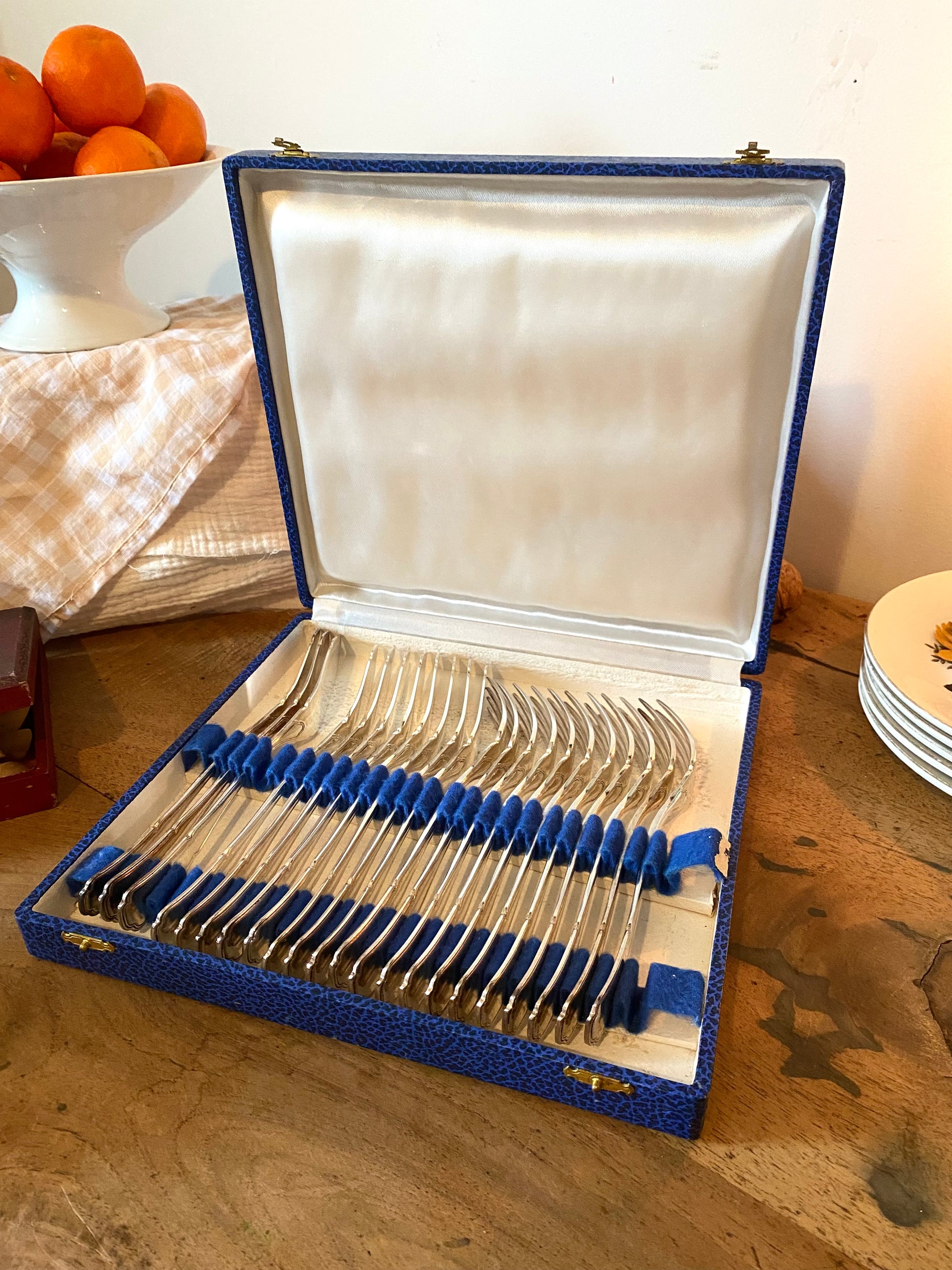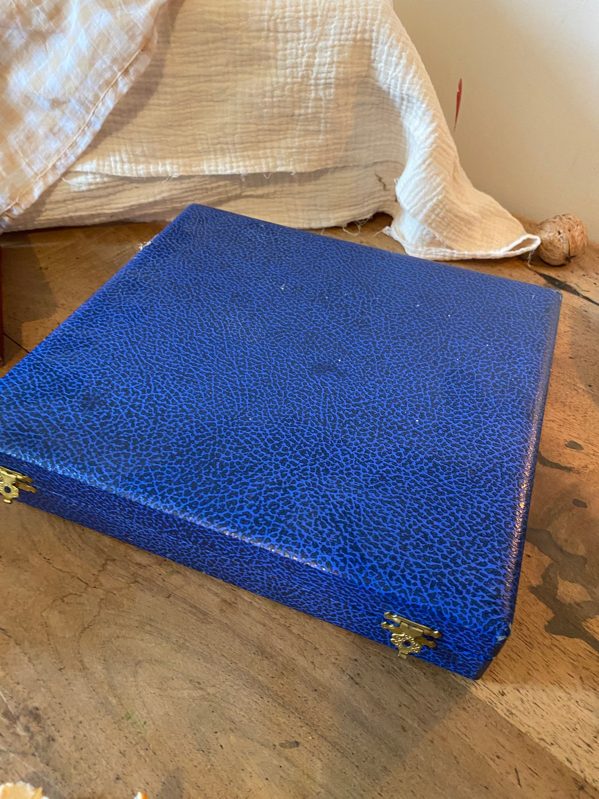 • Le coffret : Les couverts sont rangés dans un écrin rectangulaire gainé d'un papier ou cuir bleu à texture "peau de lézard". L'intérieur est doublé de satin blanc/ivoire et de feutrine bleue avec des encoches individuelles pour maintenir chaque pièce en place.