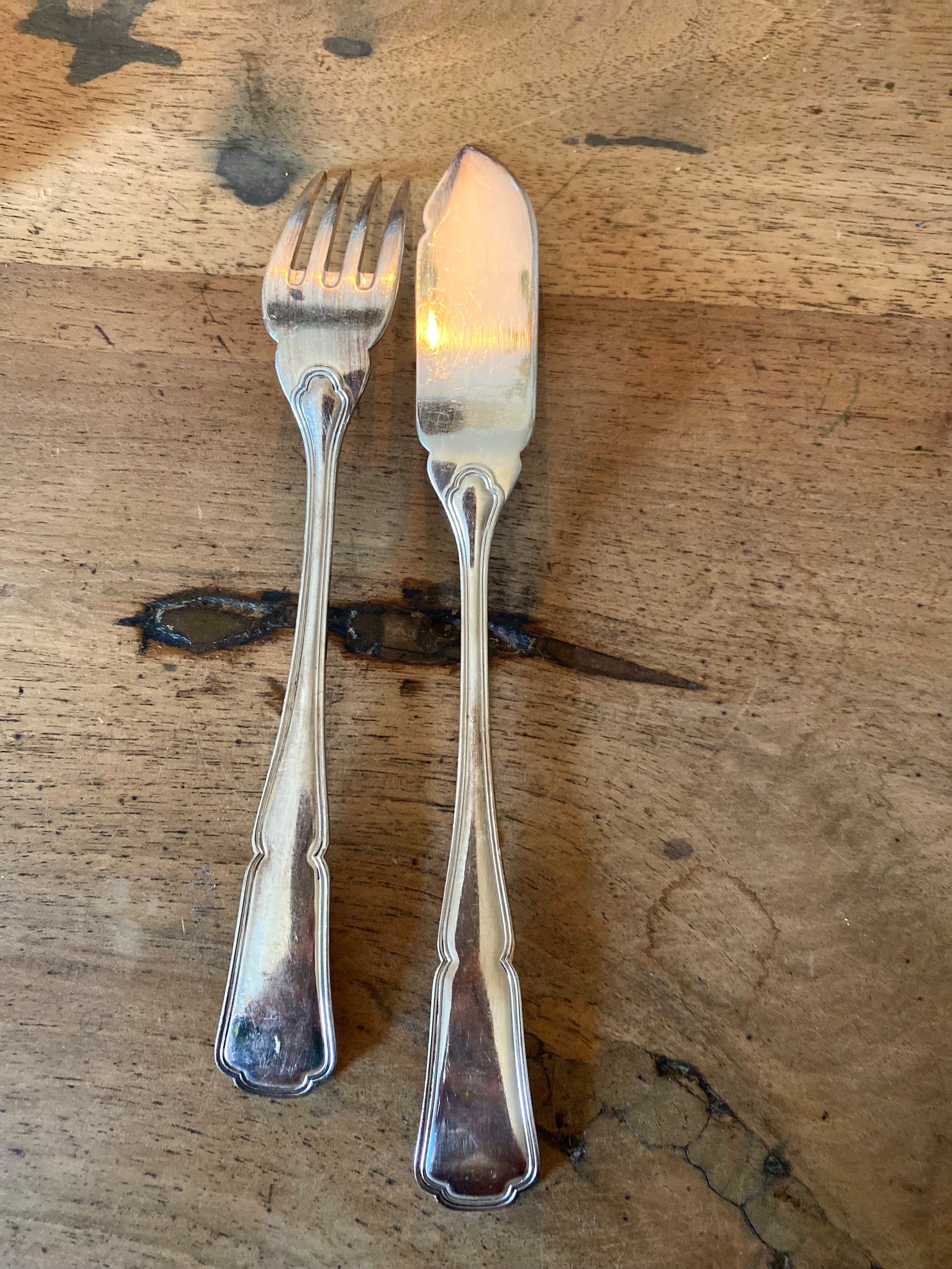 • Les fourchettes à poisson : Elles sont plus larges que des fourchettes de table classiques et possèdent généralement quatre dents. L'une des dents extérieures présente souvent une fente plus profonde ou une forme différente pour aider à lever les filets.