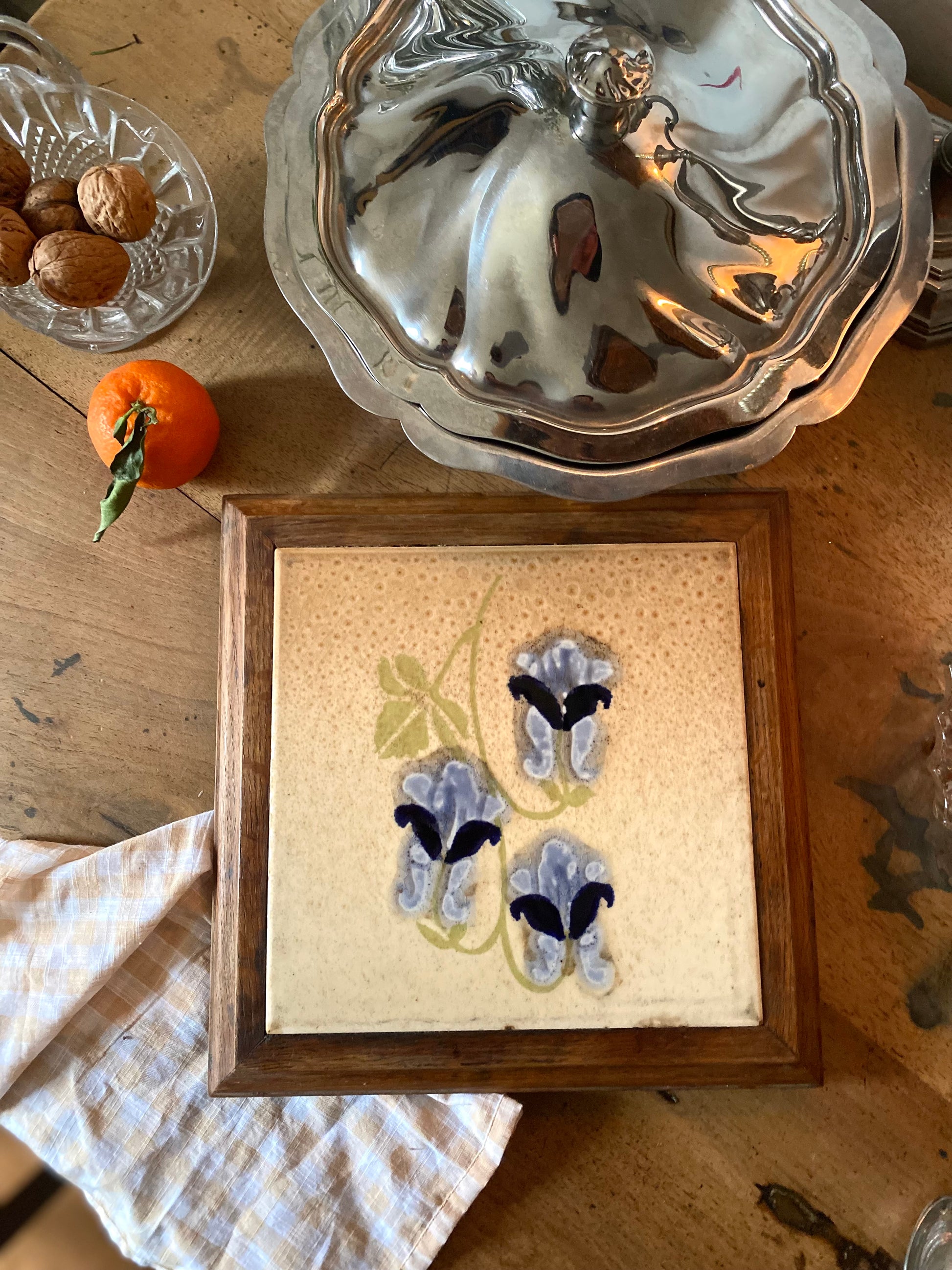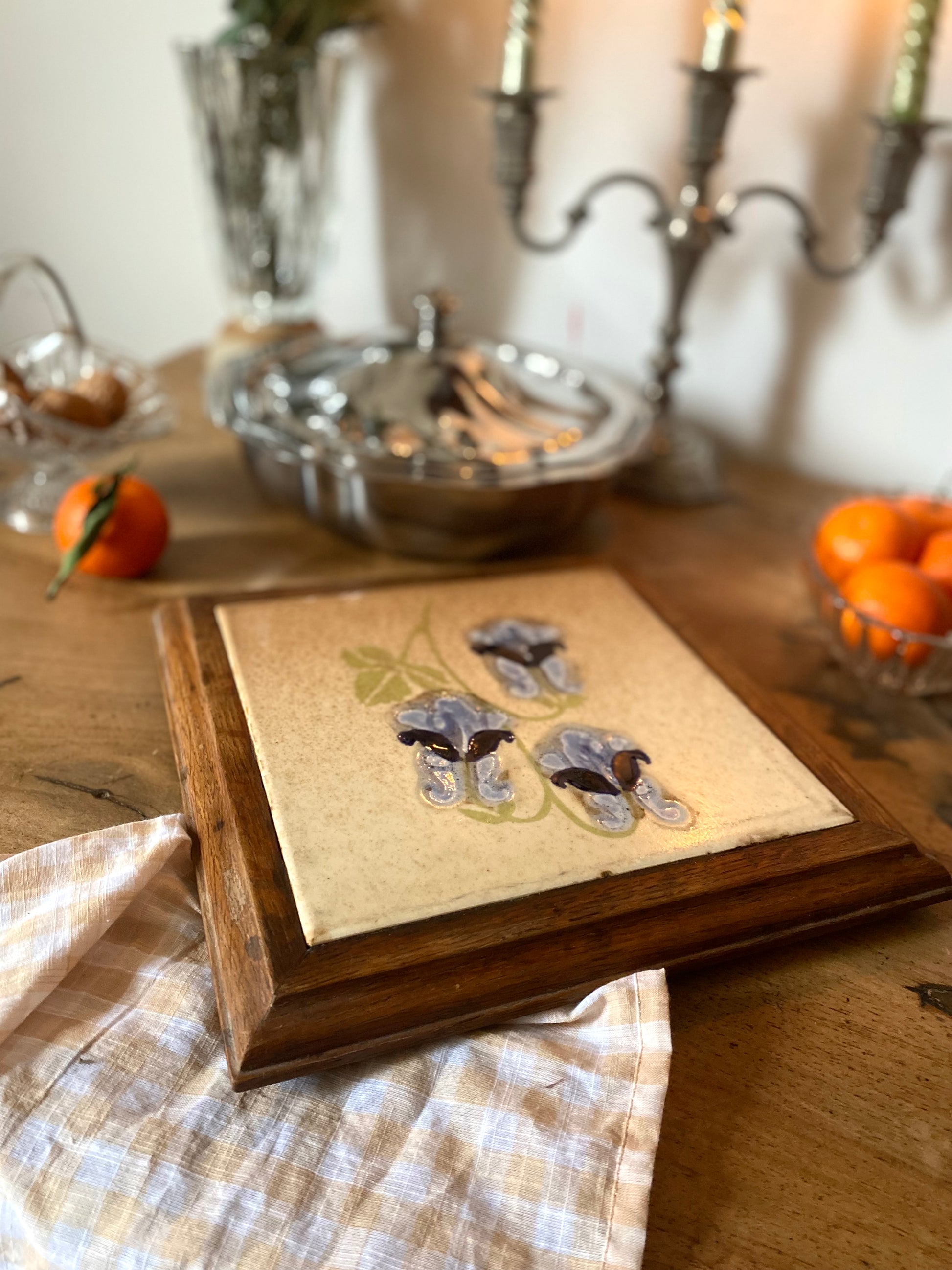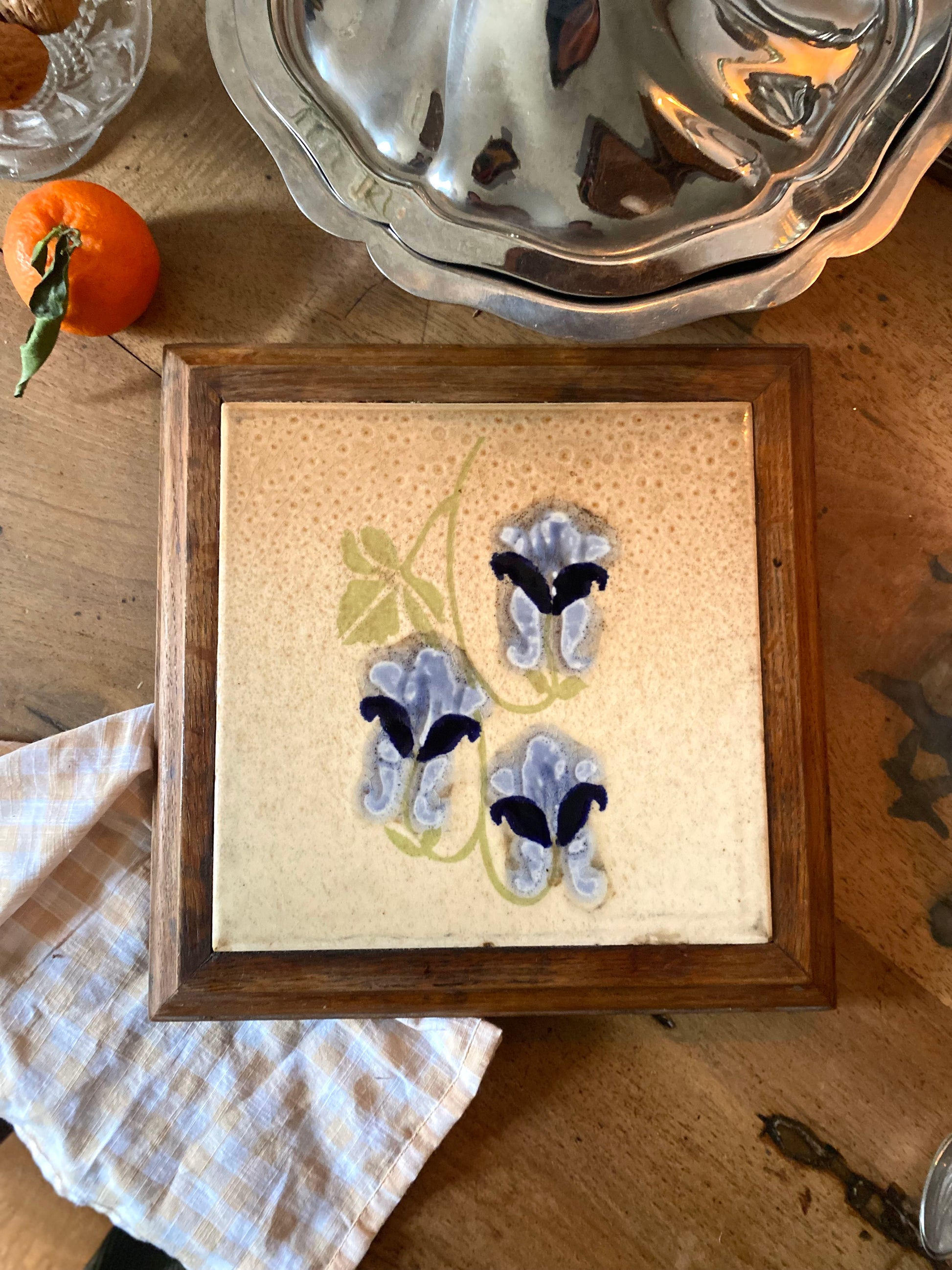 Ravissant dessous de plat datant de 1960 en carreau de faïence encastrée dans un cadre en bois