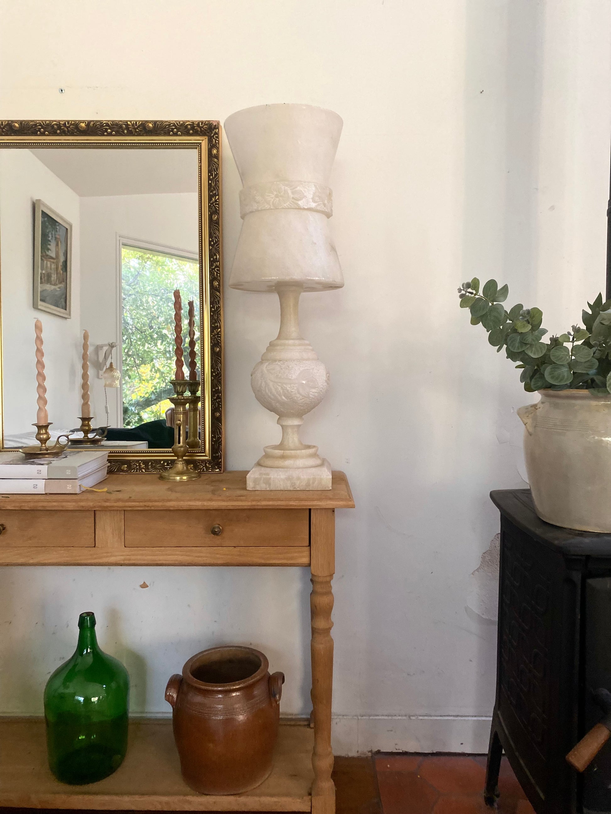Magnifique lampe à poser ( usage decoratif uniquement car le câble a été coupé) de grande taille (78 cm), véritable pièce de décoration en albâtre véritable datant des années 1950.
