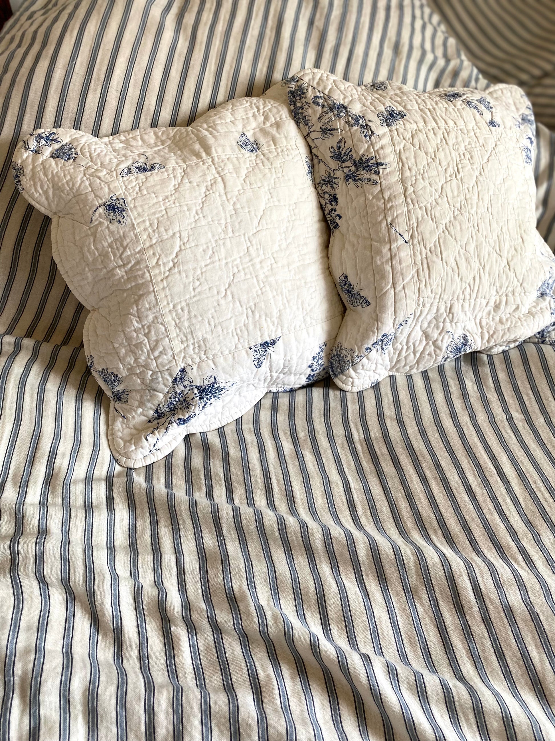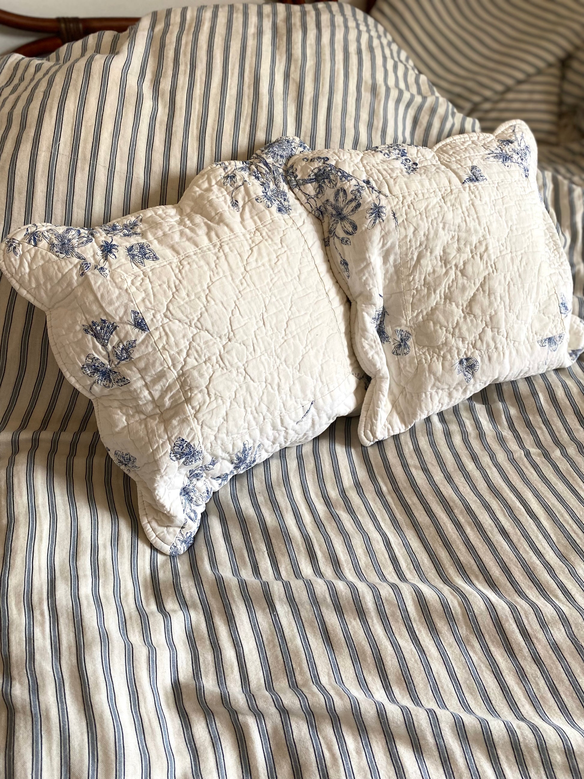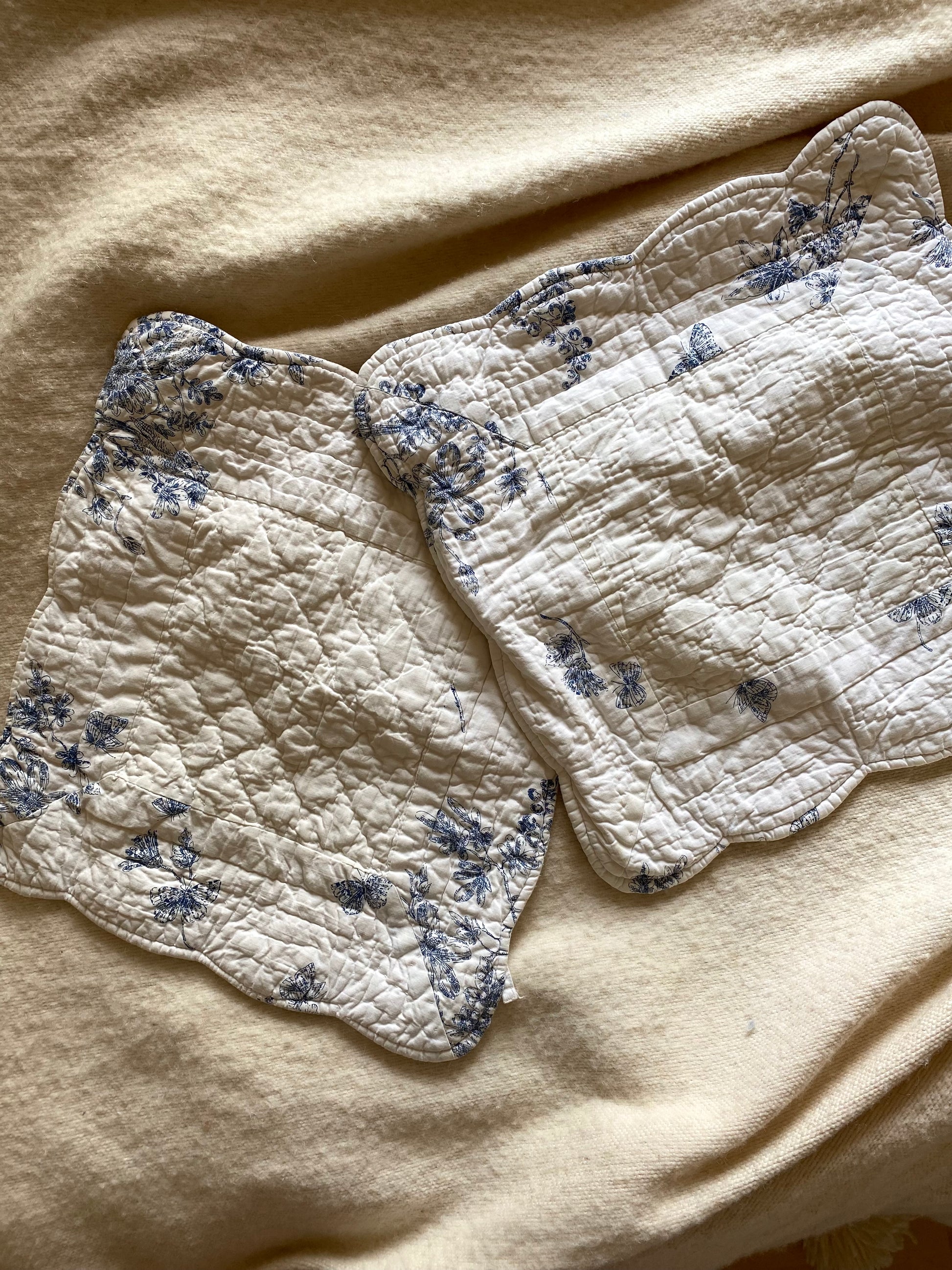 Adorable paire de housses de coussin en coton ancien matelassé en toile de Jouy.