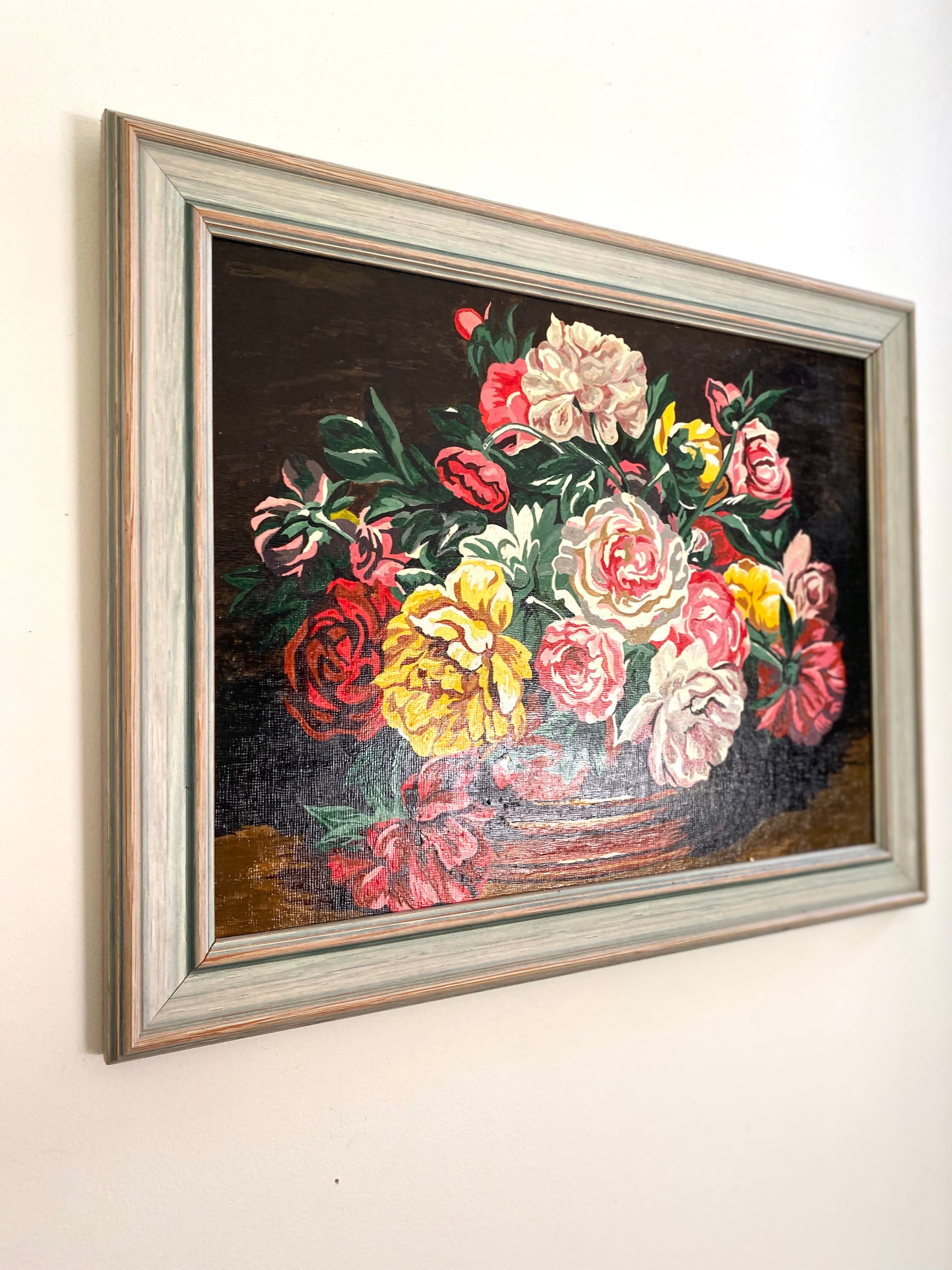 Ravissante huile sur bois vintage représentant un bouquet aux couleurs chatoyantes sur fond noir.