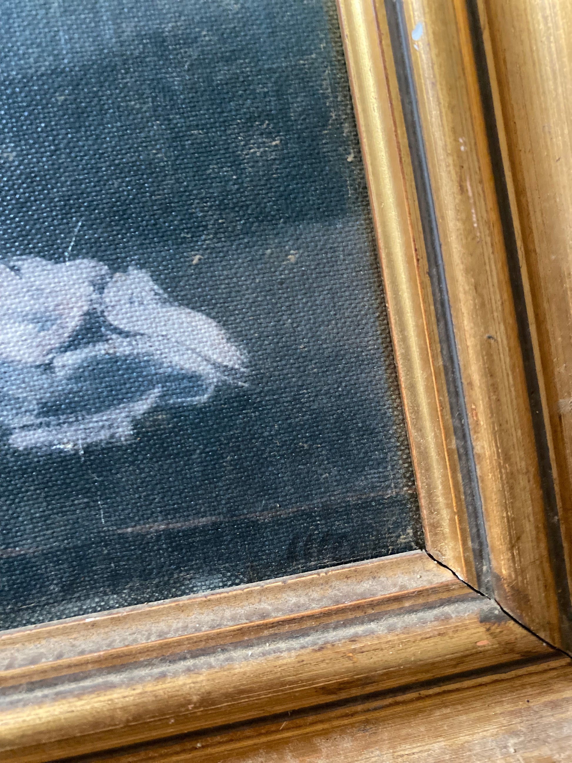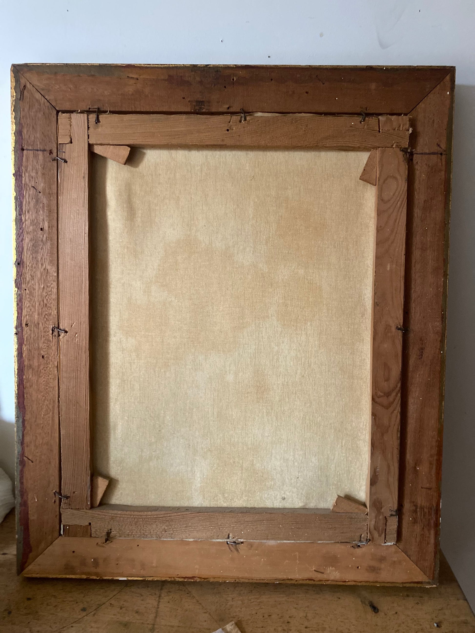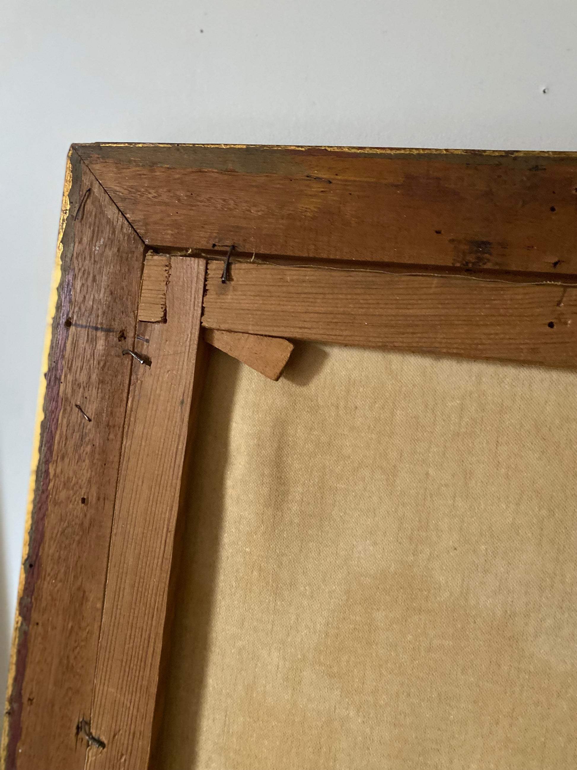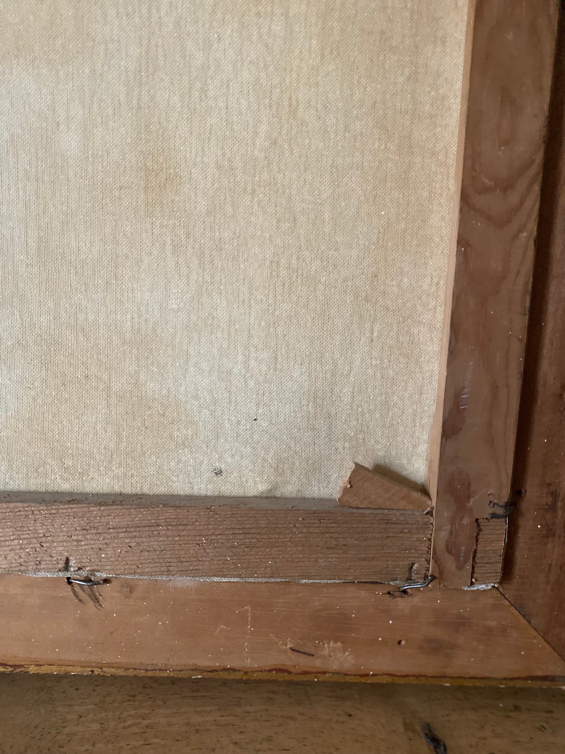 Le bois et le montage : Le bois du châssis présente une patine sombre et une usure naturelle cohérente avec plus de 130 ans d'âge. La manière dont la toile est fixée (clous anciens/semences) est également typique de cette époque.
