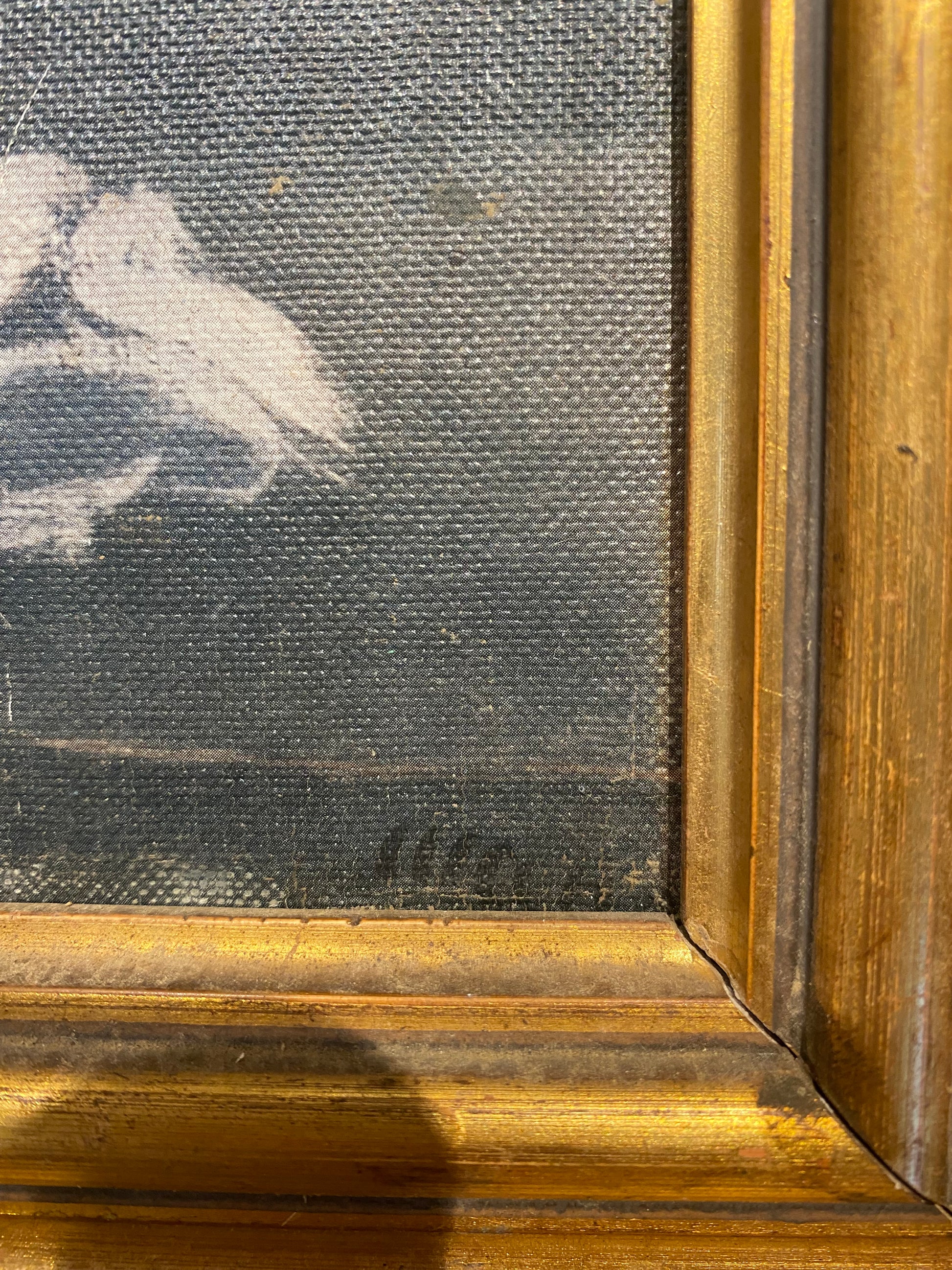 Le cadre à larges moulures dorées à la feuille est de style Louis-Philippe ou Napoléon III, ce qui correspond parfaitement à la période de production de la toile.