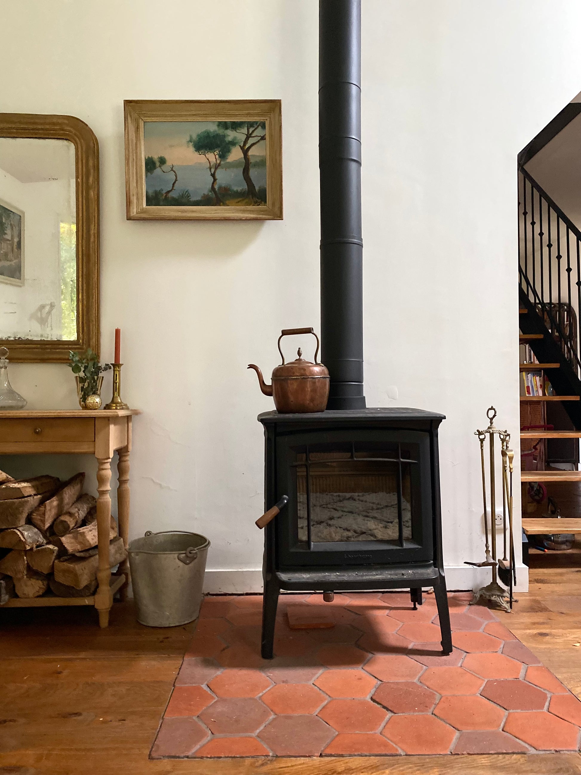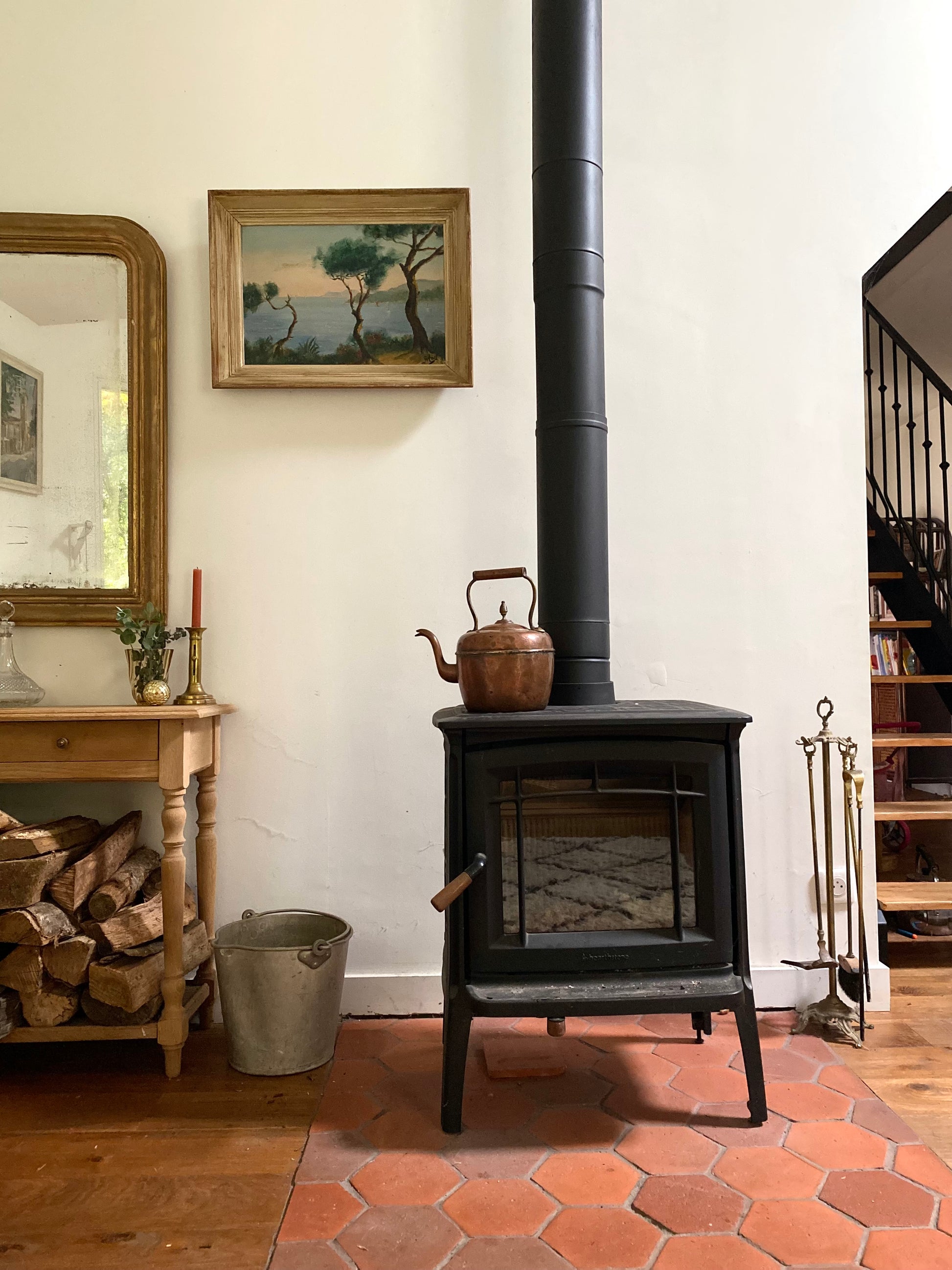 Une très jolie palette de couleurs très douce, dominée par les bleus et les verts, avec des touches de rose-orangé dans le ciel.