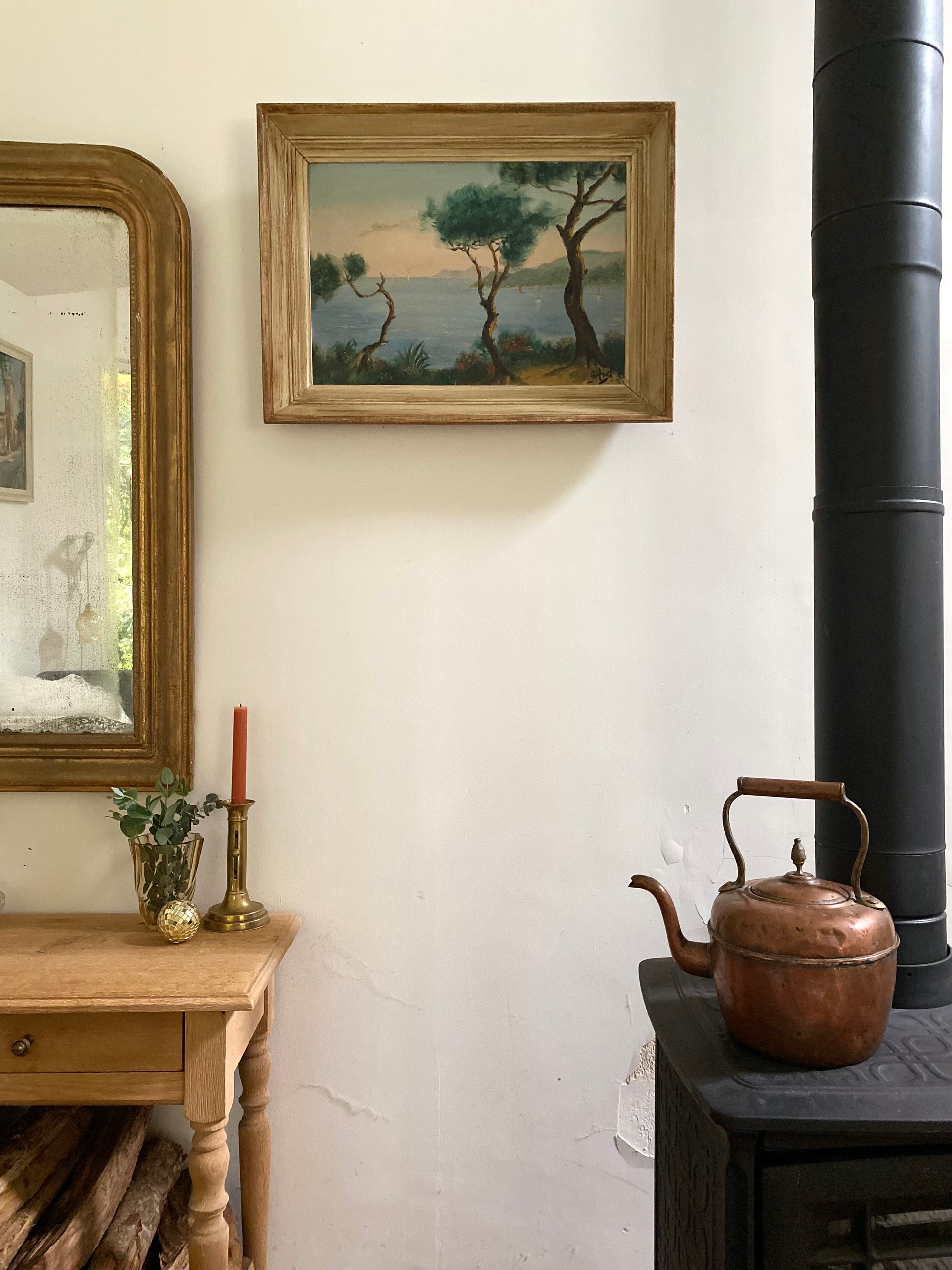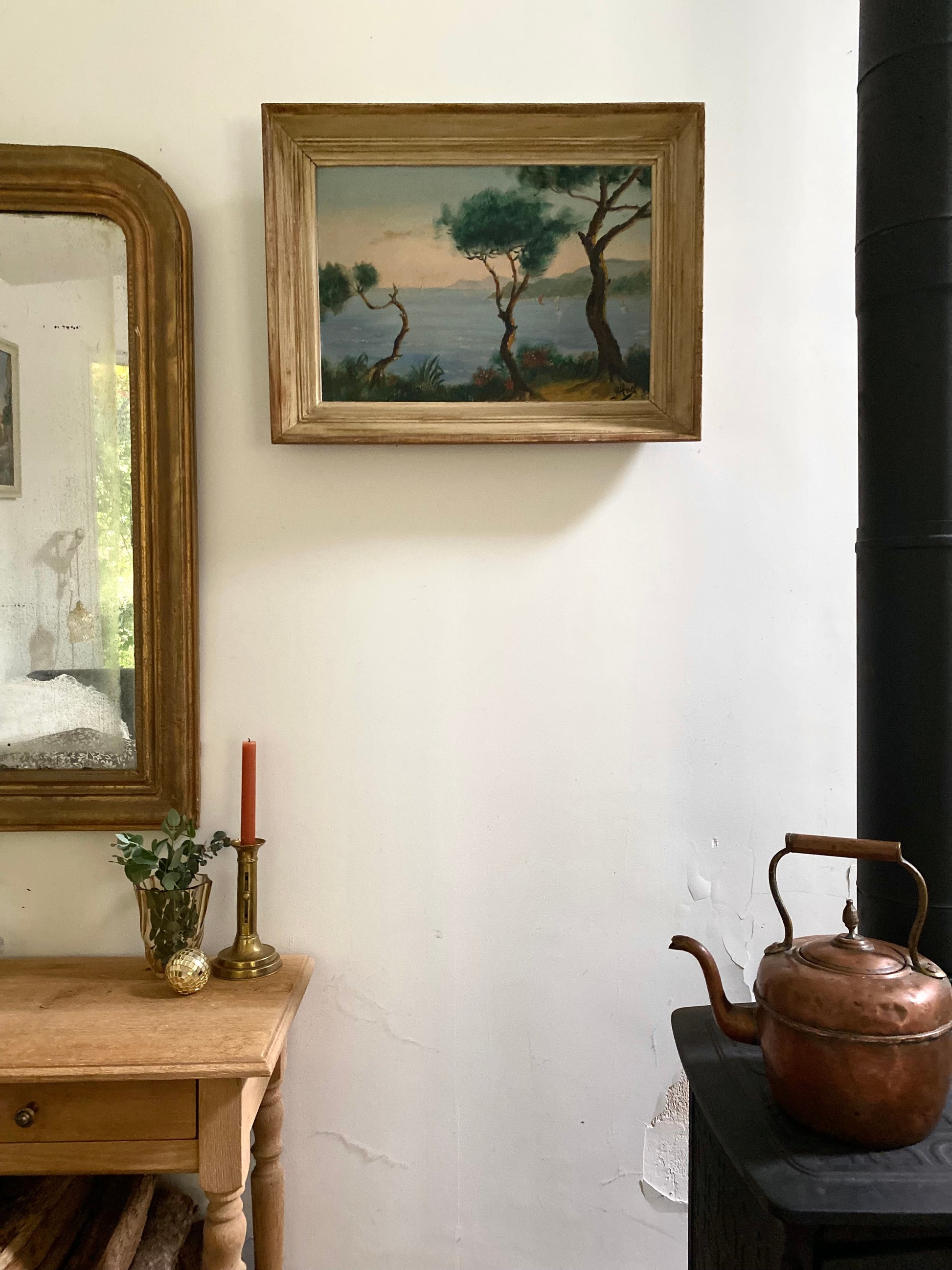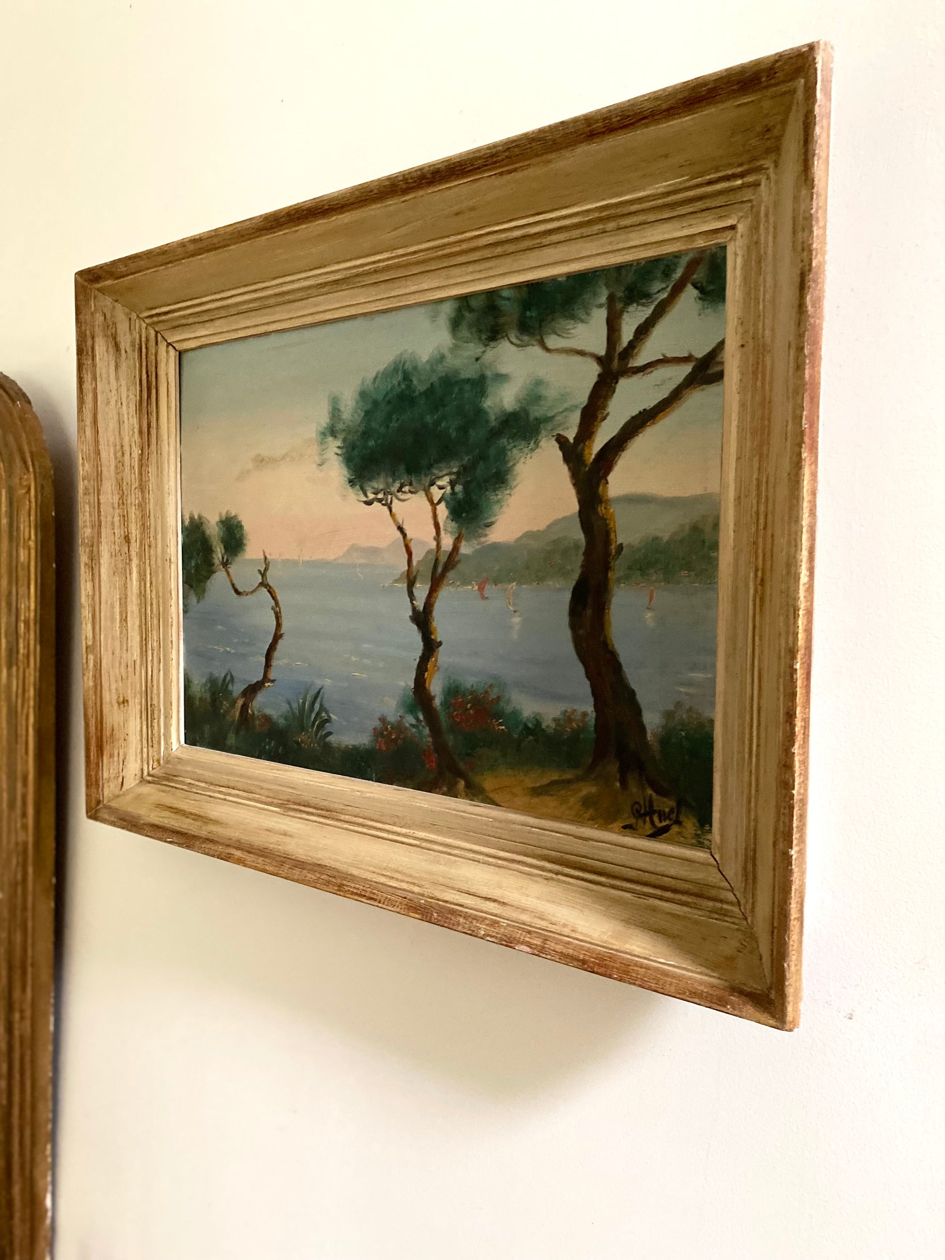 Peinture à l’huile ancienne de la première moitié du XXe siècle , représentant une scène côtière méditerranéenne, peut-être de la Côte d'Azur ou d'une région similaire, en raison de la végétation et de l'atmosphère.