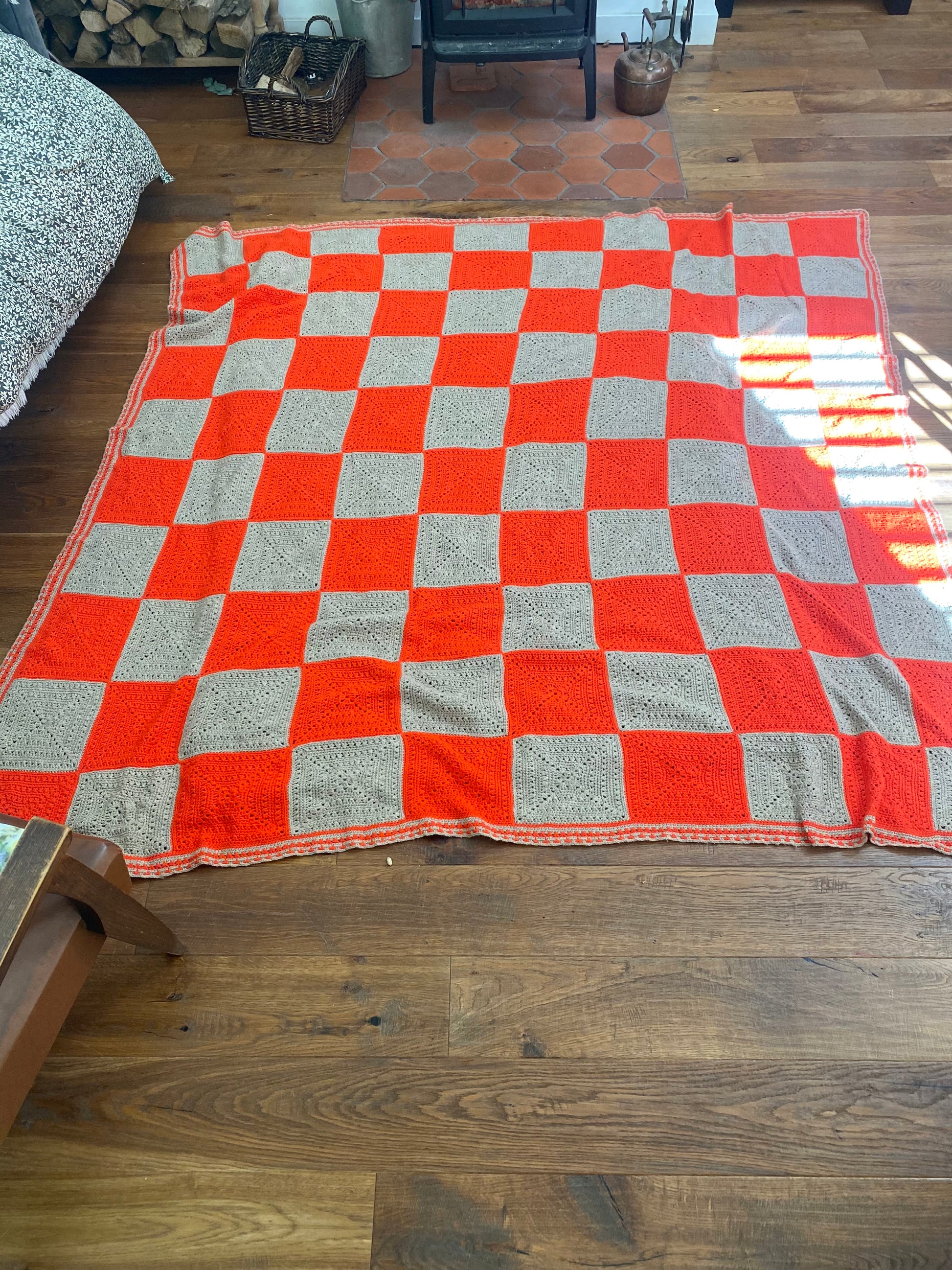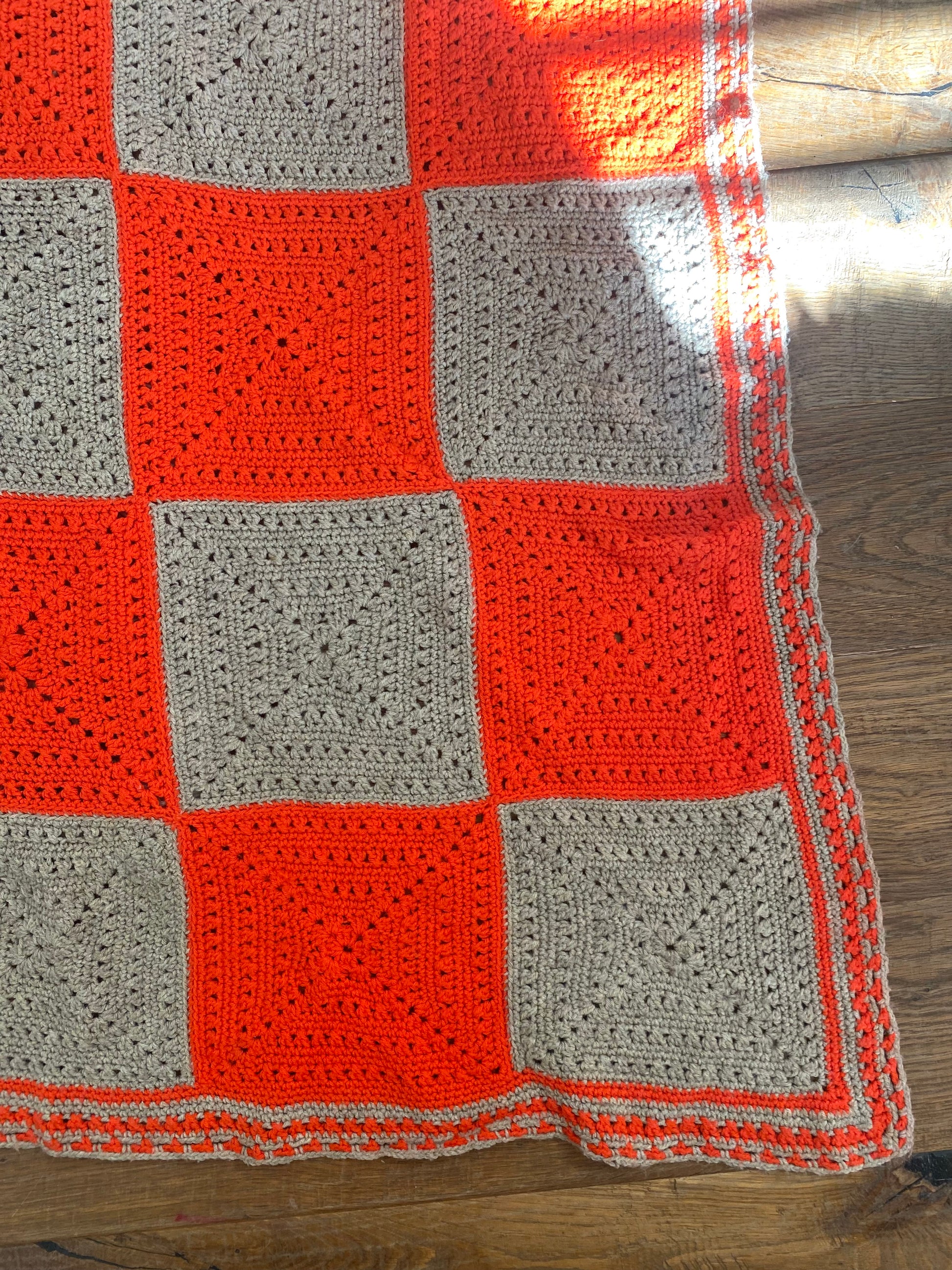 Magnifique couverture ou un plaid en laine fait main, au crochet, composée de motifs carrés assemblés aussi appelés carré de grand-mère (granny square) d’un orange vif et un beige/taupe neutre datant des années 70.