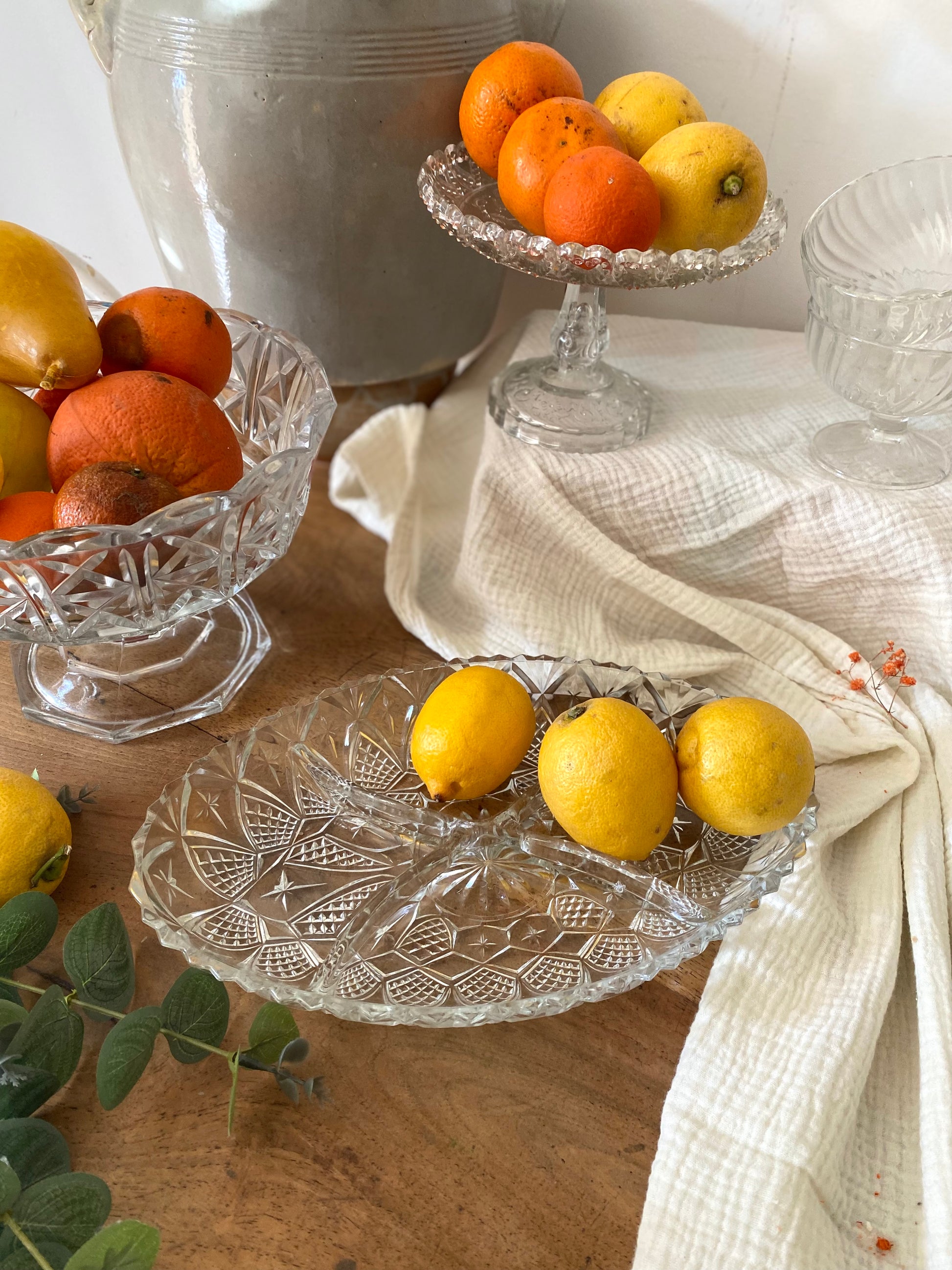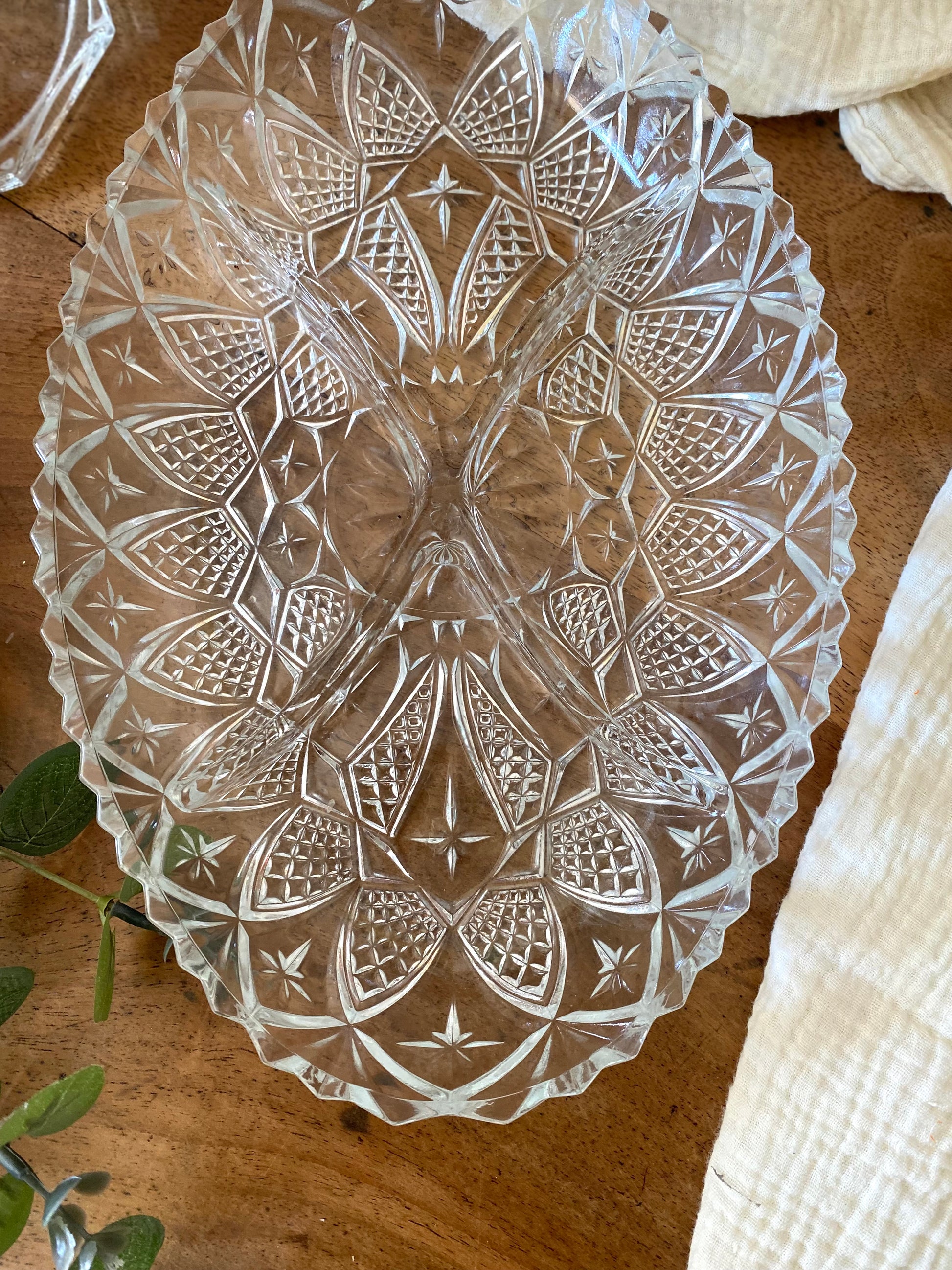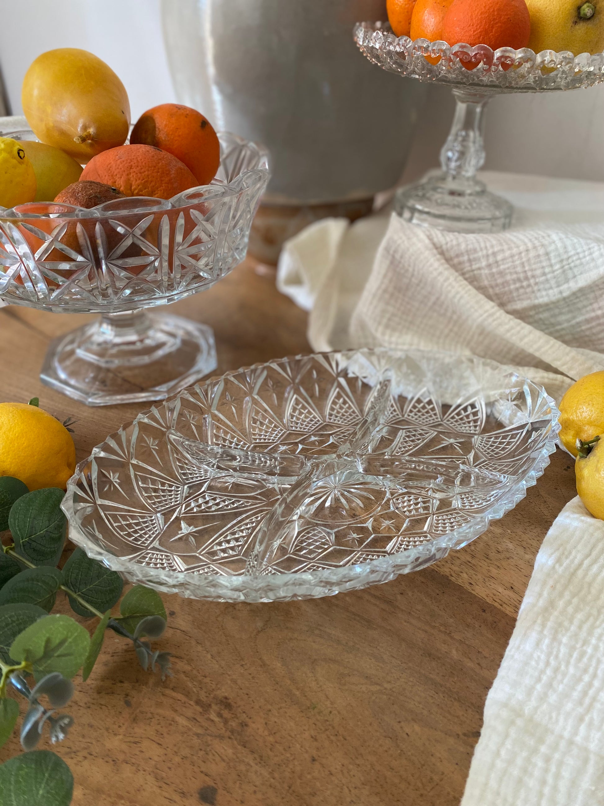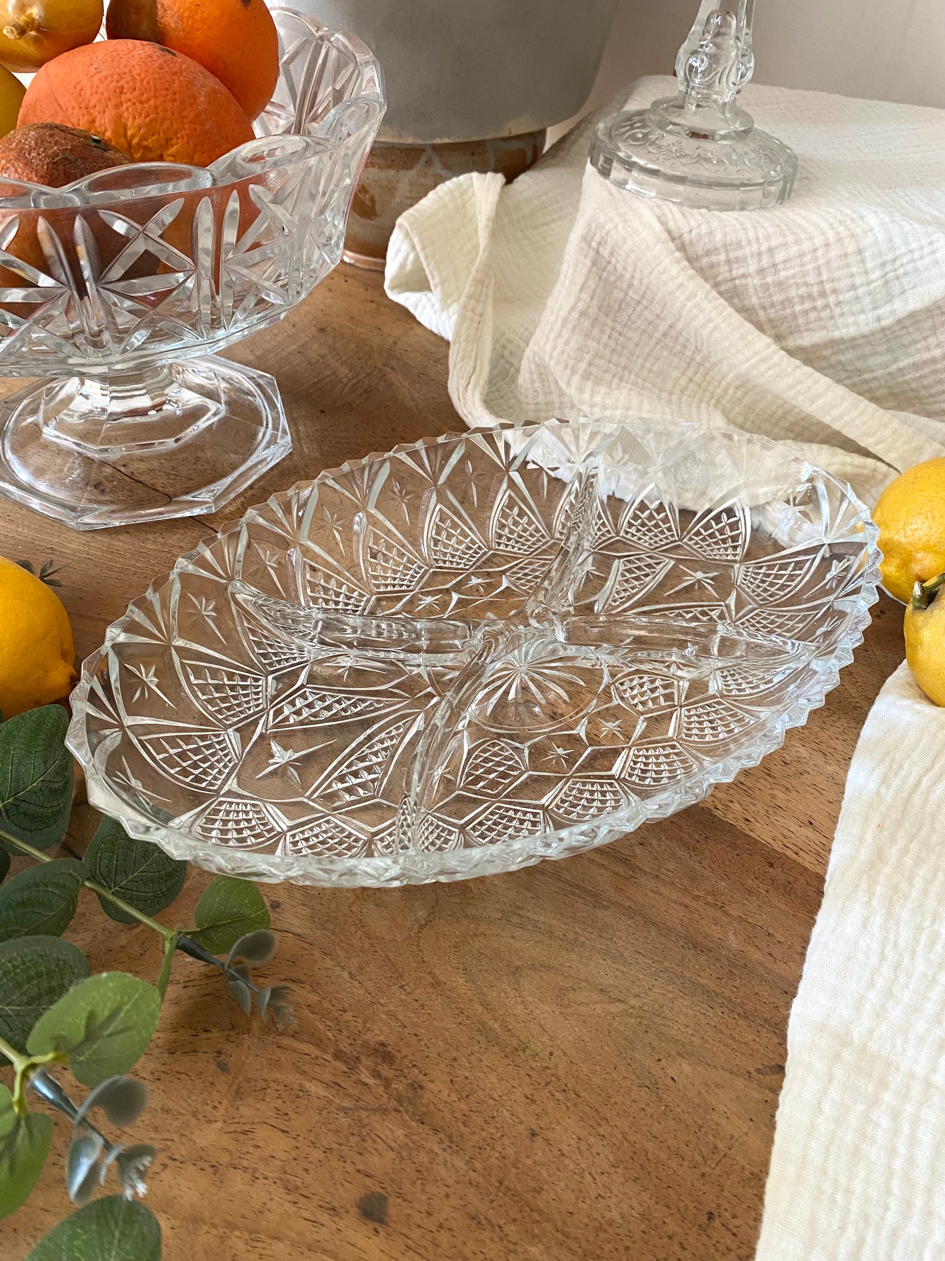 Ce bel objet est un plat à compartiments ou plat à hors-d'œuvre en verre moulé-pressé datant des années 1950.