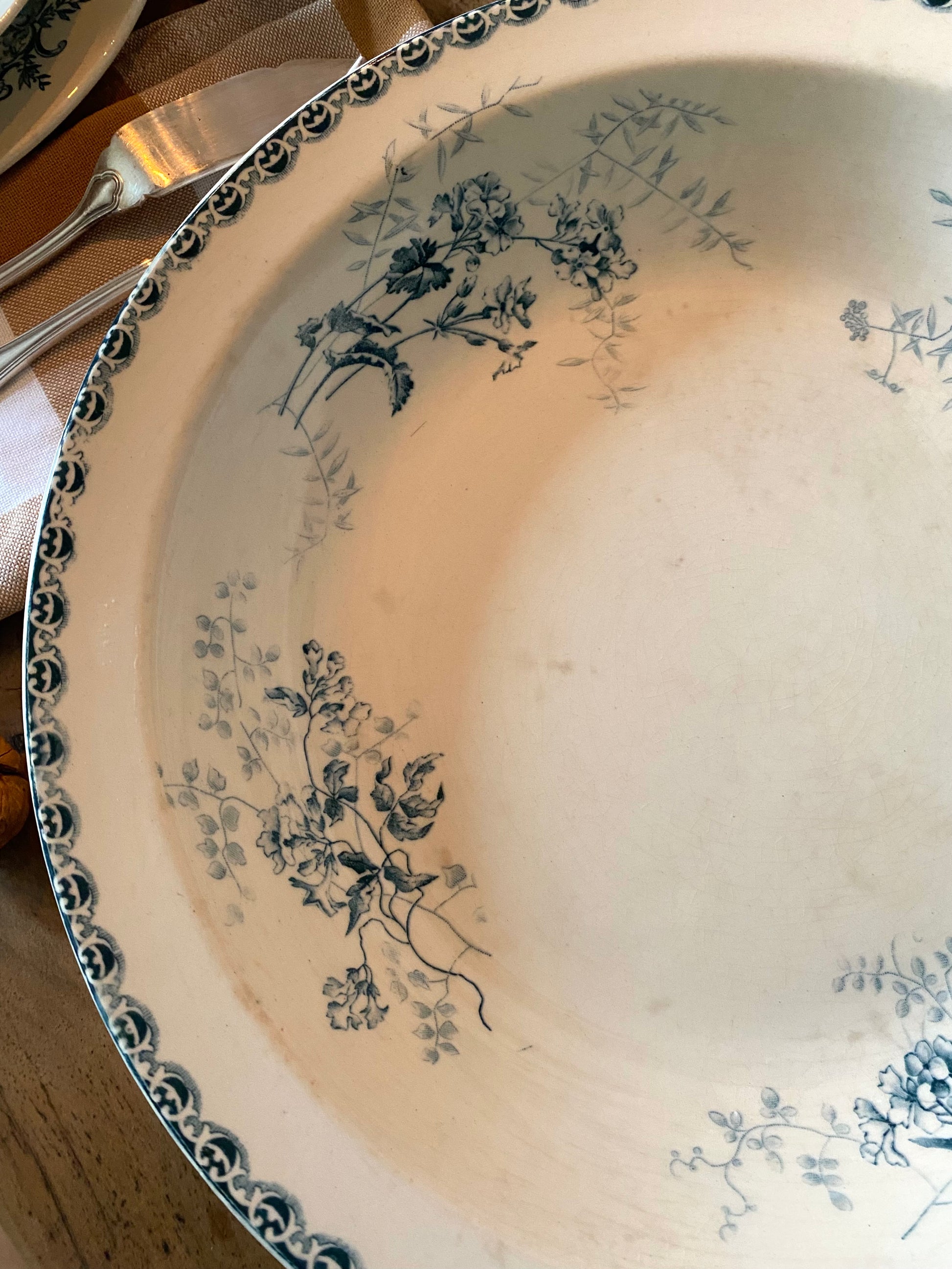Ce plat est une magnifique pièce de faïence française ancienne, typique de la fin du XIXe siècle ou du tout début du XXe siècle.