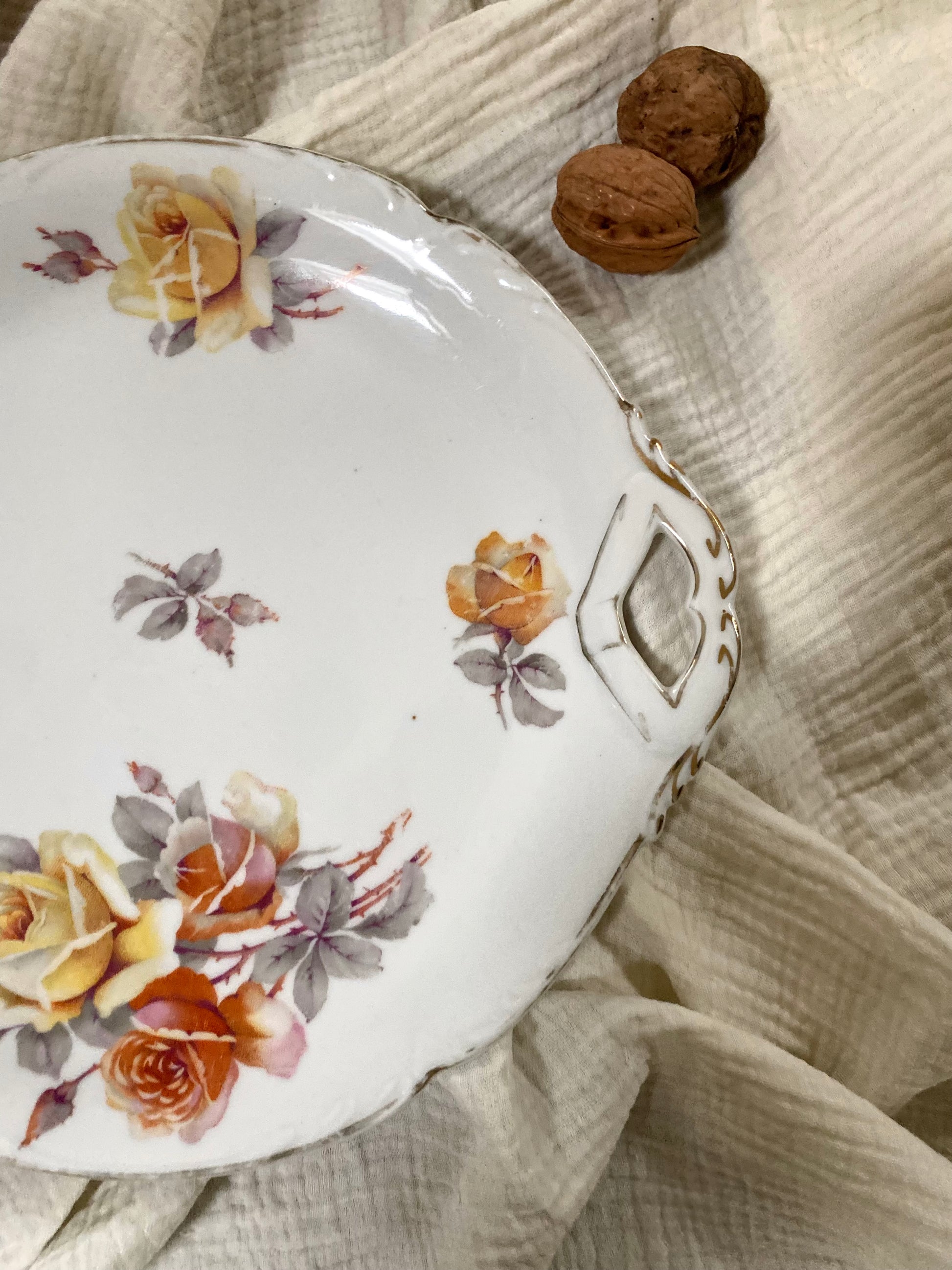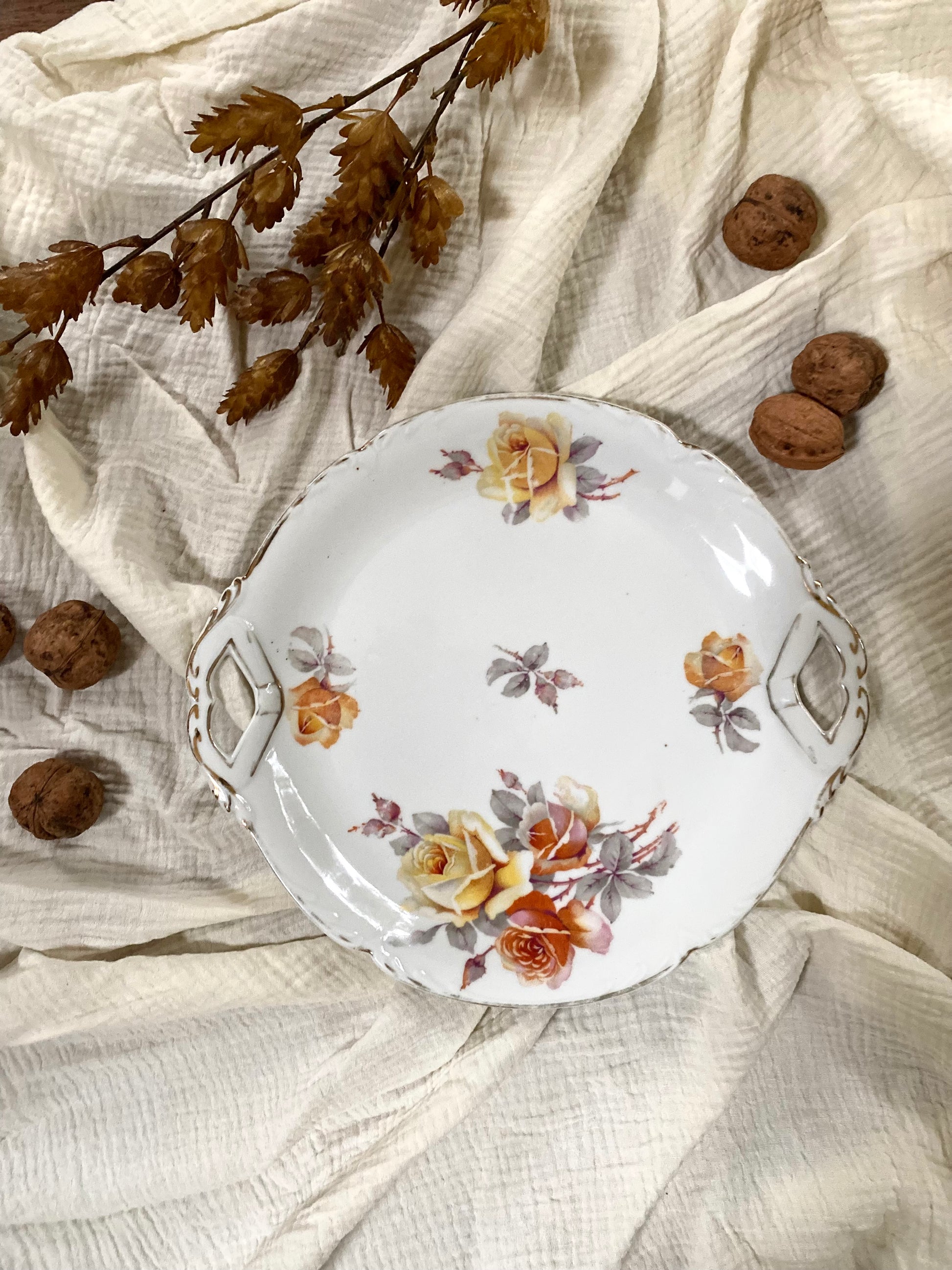 Ravissant plat de service à oreilles en faïence ancienne au joli décor automnal