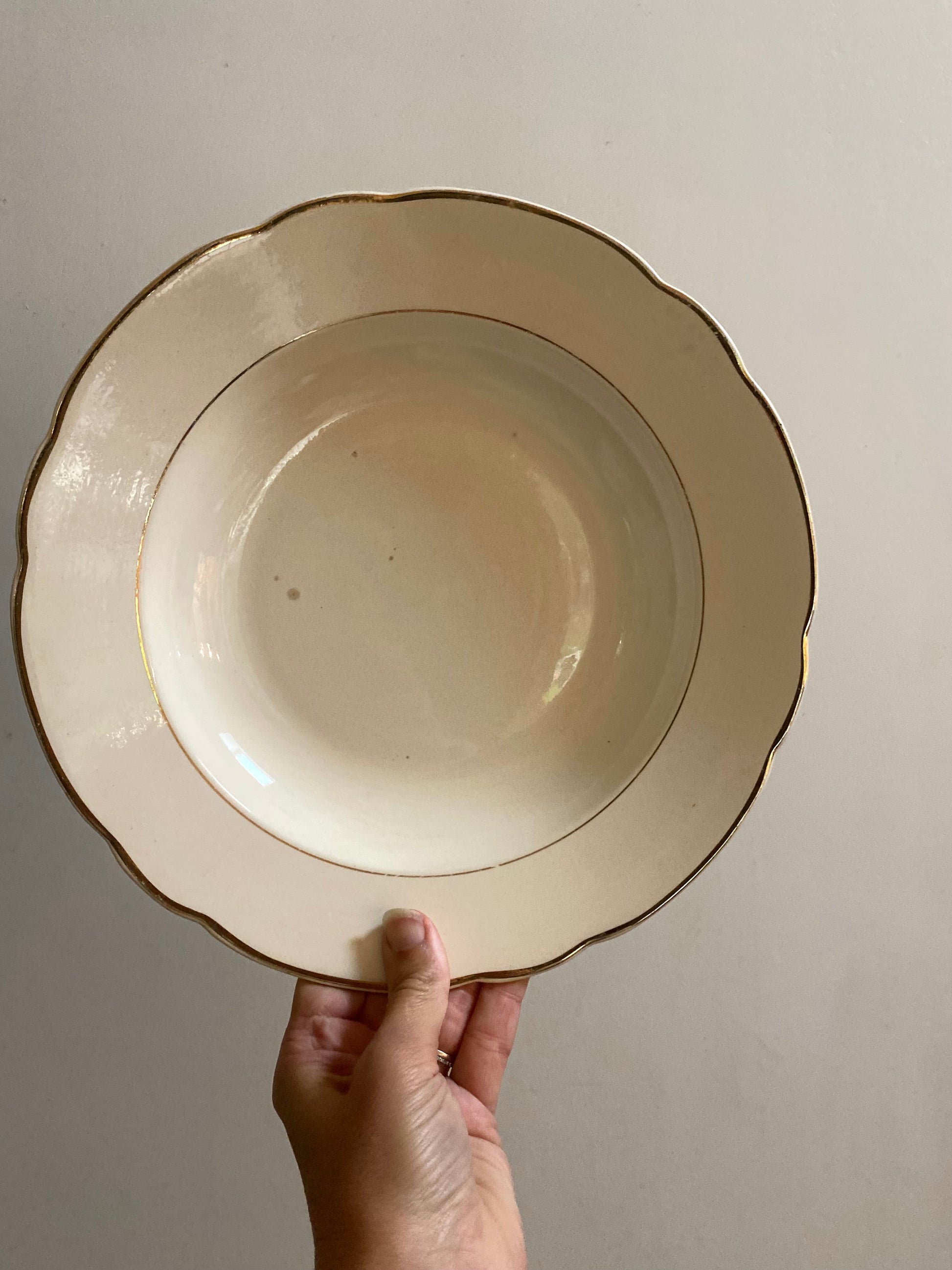 Grand plat de service creux en faïence blanche et élégant liseré doré. Parfait pour sublimer vos tables de fête !