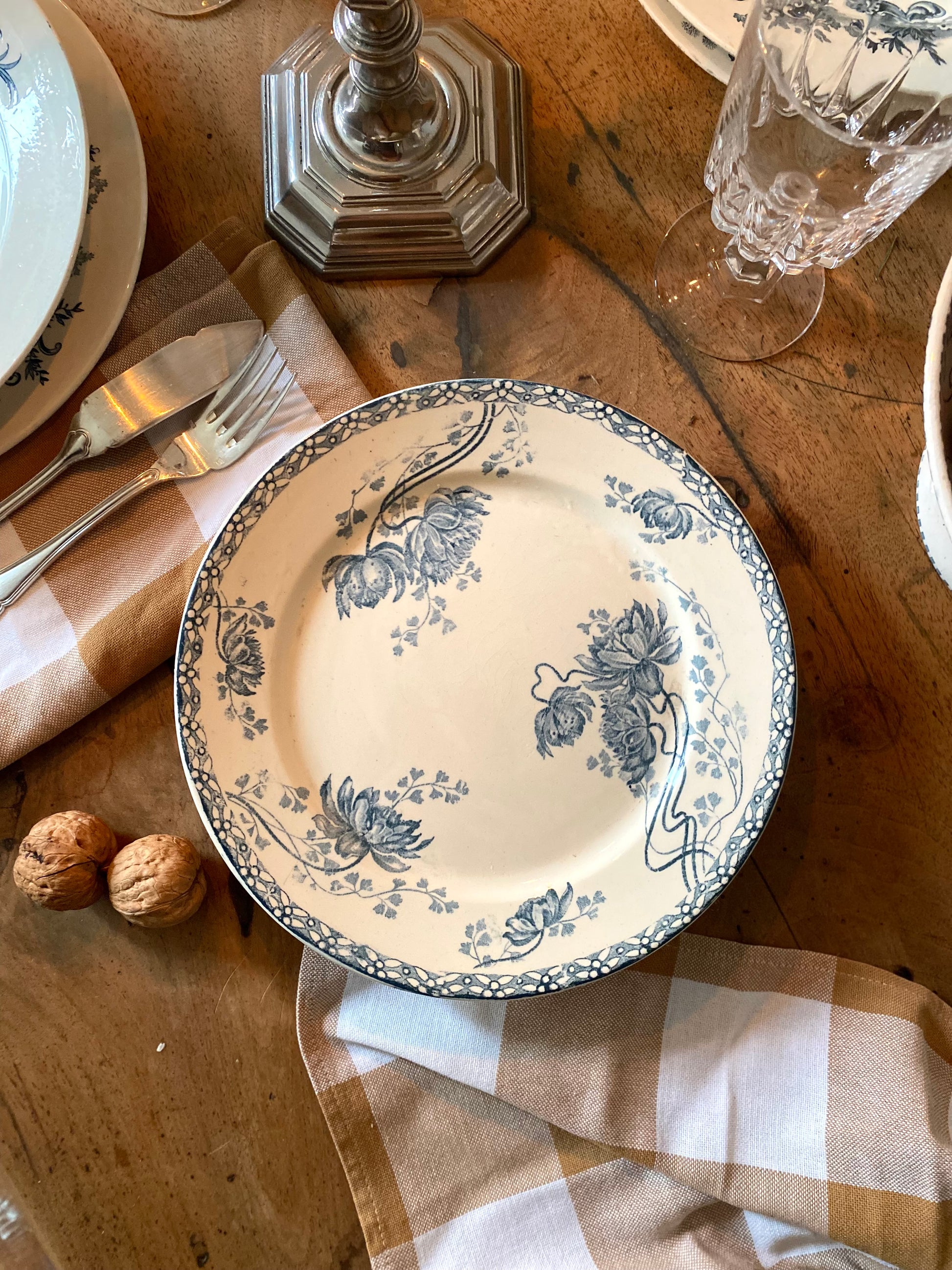 Il s'agit d'un décor de transfert de couleur bleu-gris sur un fond crème (ivoire). Le motif représente des fleurs épanouies (ressemblant à des anémones ou des pivoines stylisées) avec des tiges souples et des feuillages délicats qui semblent "grimper" sur le plat.