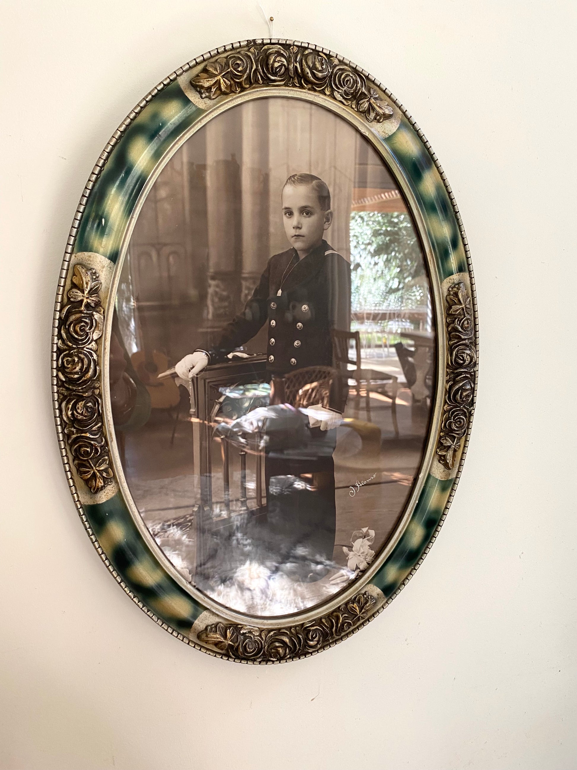 Le cadre, magnifique est en celluloïd ou en bois stuqué imitant l'écaille de tortue (finition "tortoiseshell").Les motifs de roses en relief (en haut, en bas et sur les côtés) sont de style Art Nouveau. La forme ovale était extrêmement populaire pour les portraits de famille à cette époque.