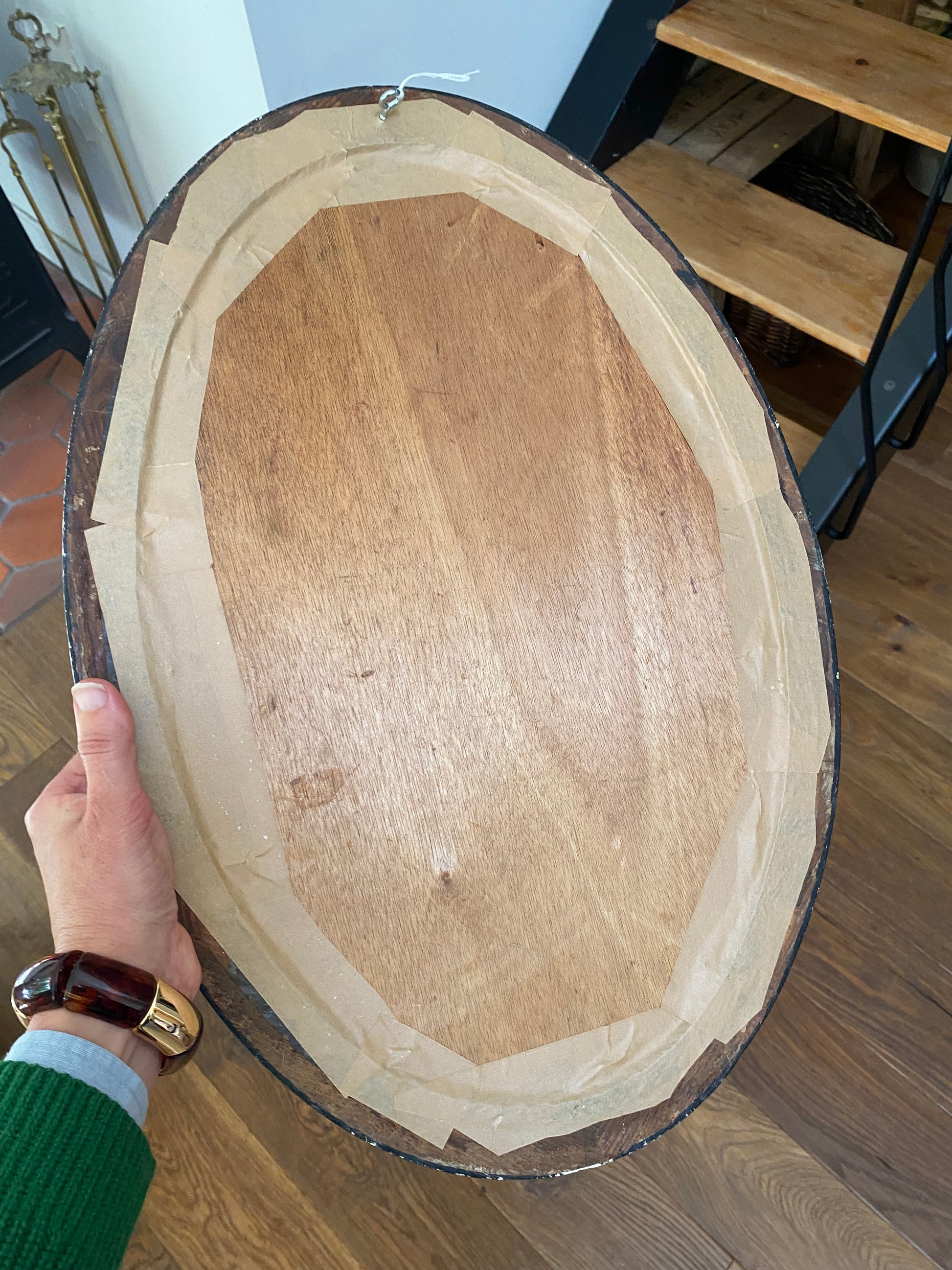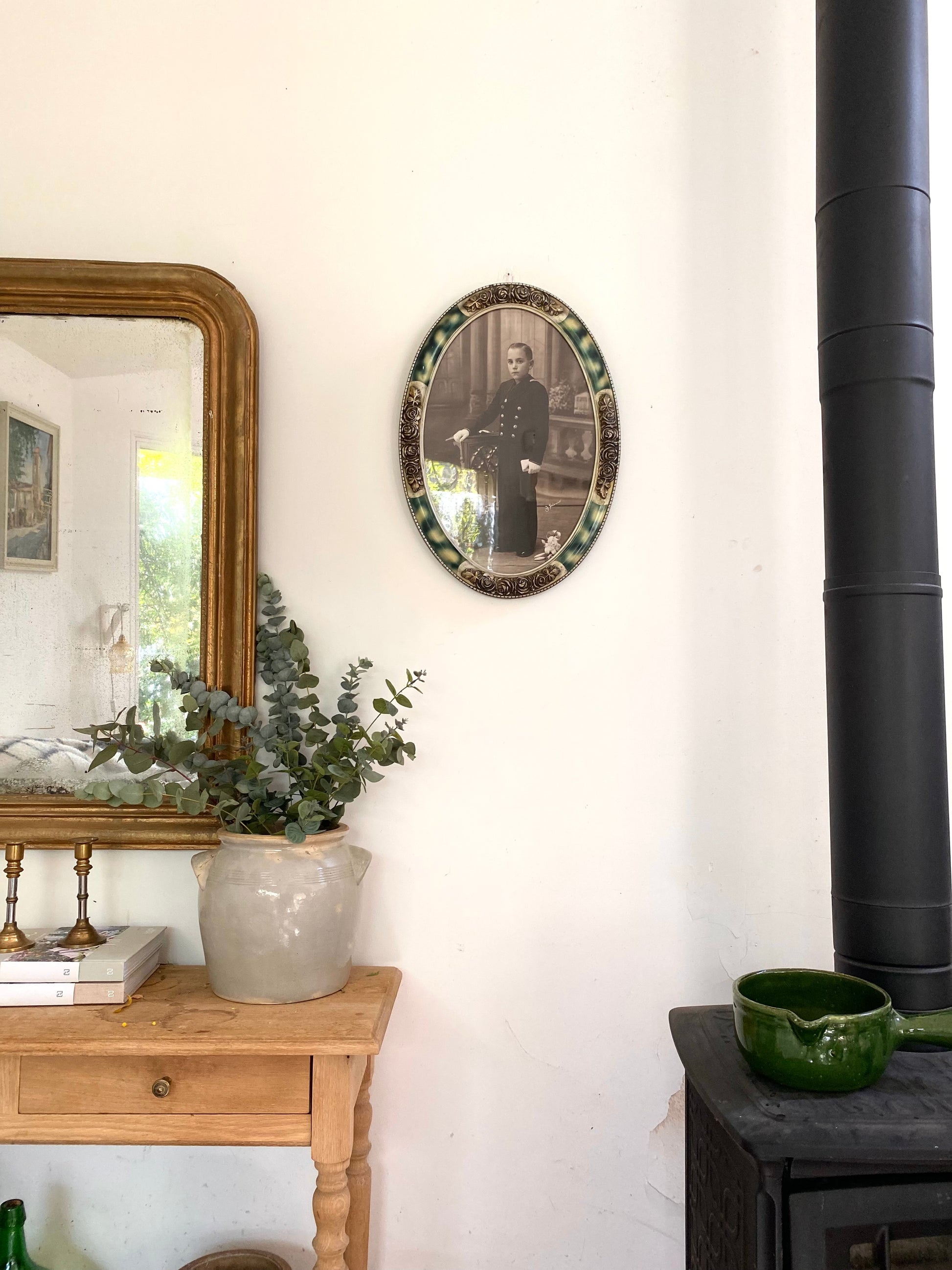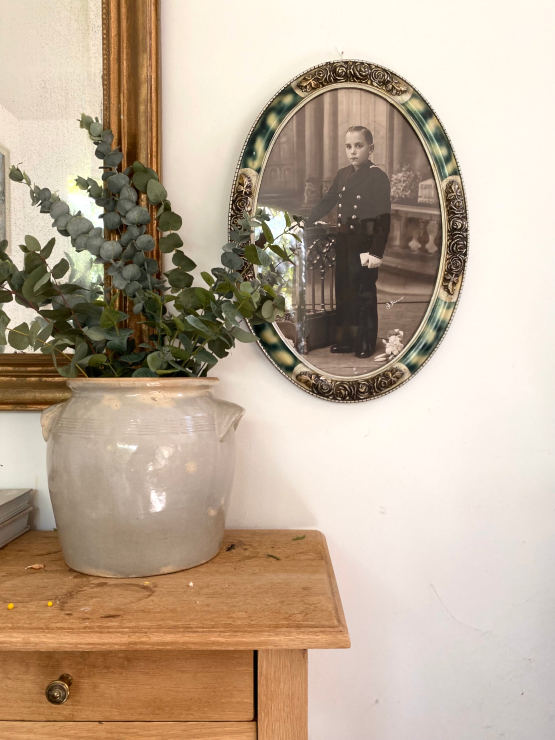 • Cadre d'exception : Magnifique cadre ovale d'origine avec une finition imitation "écaille de tortue" et d'élégants décors de roses en relief de style Art Nouveau.
