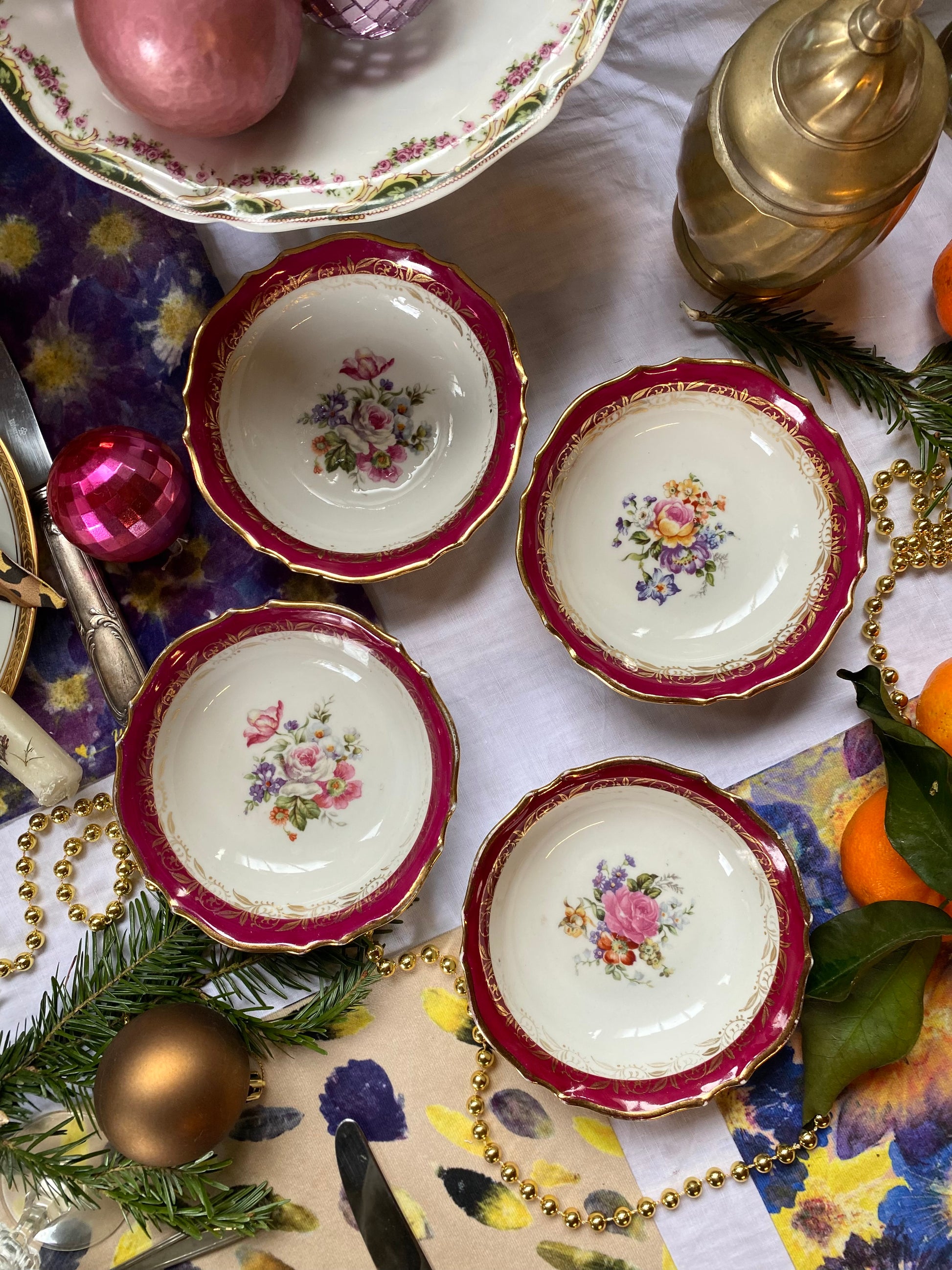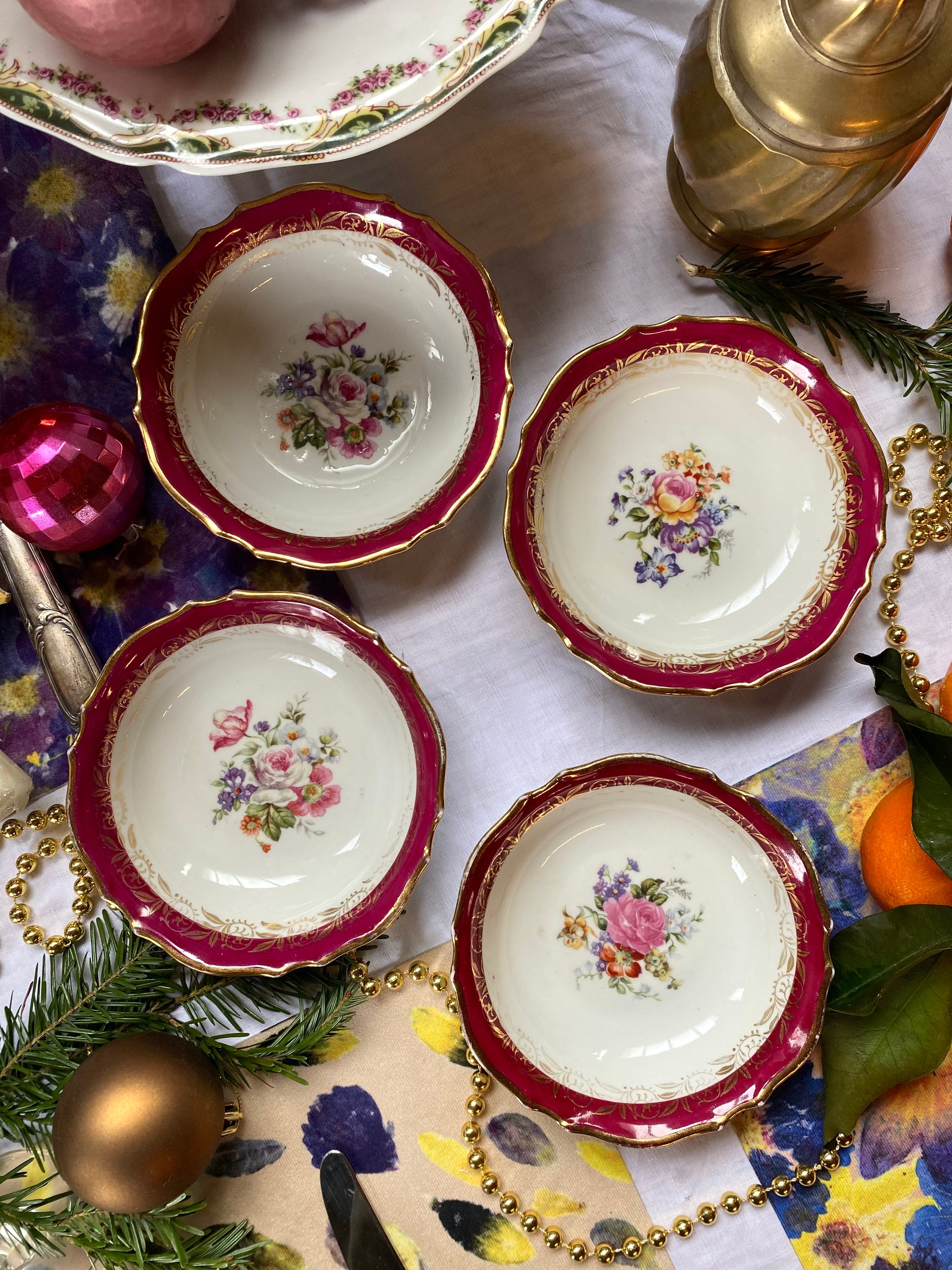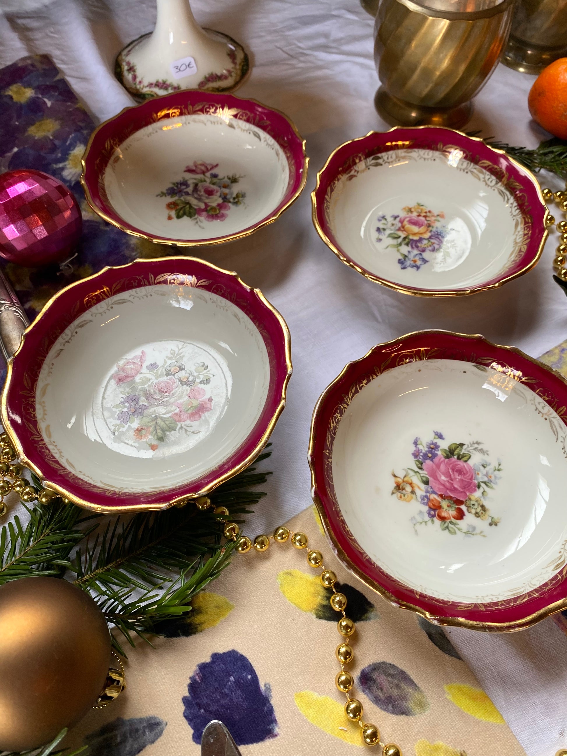 Ravissant ensemble de 4 ramequins en faïence ancienne au délicieux décor floral dans des teintes bordeaux.