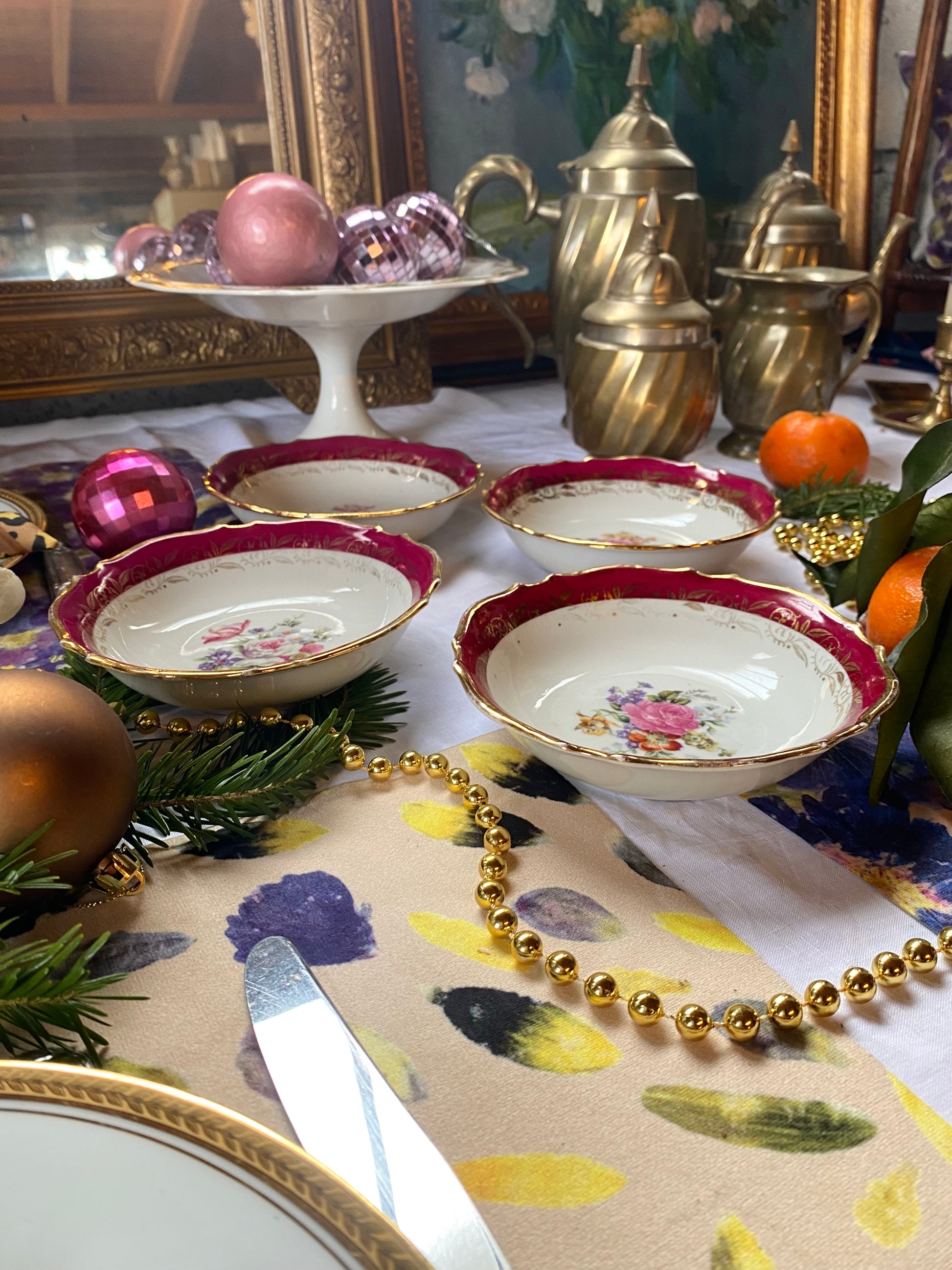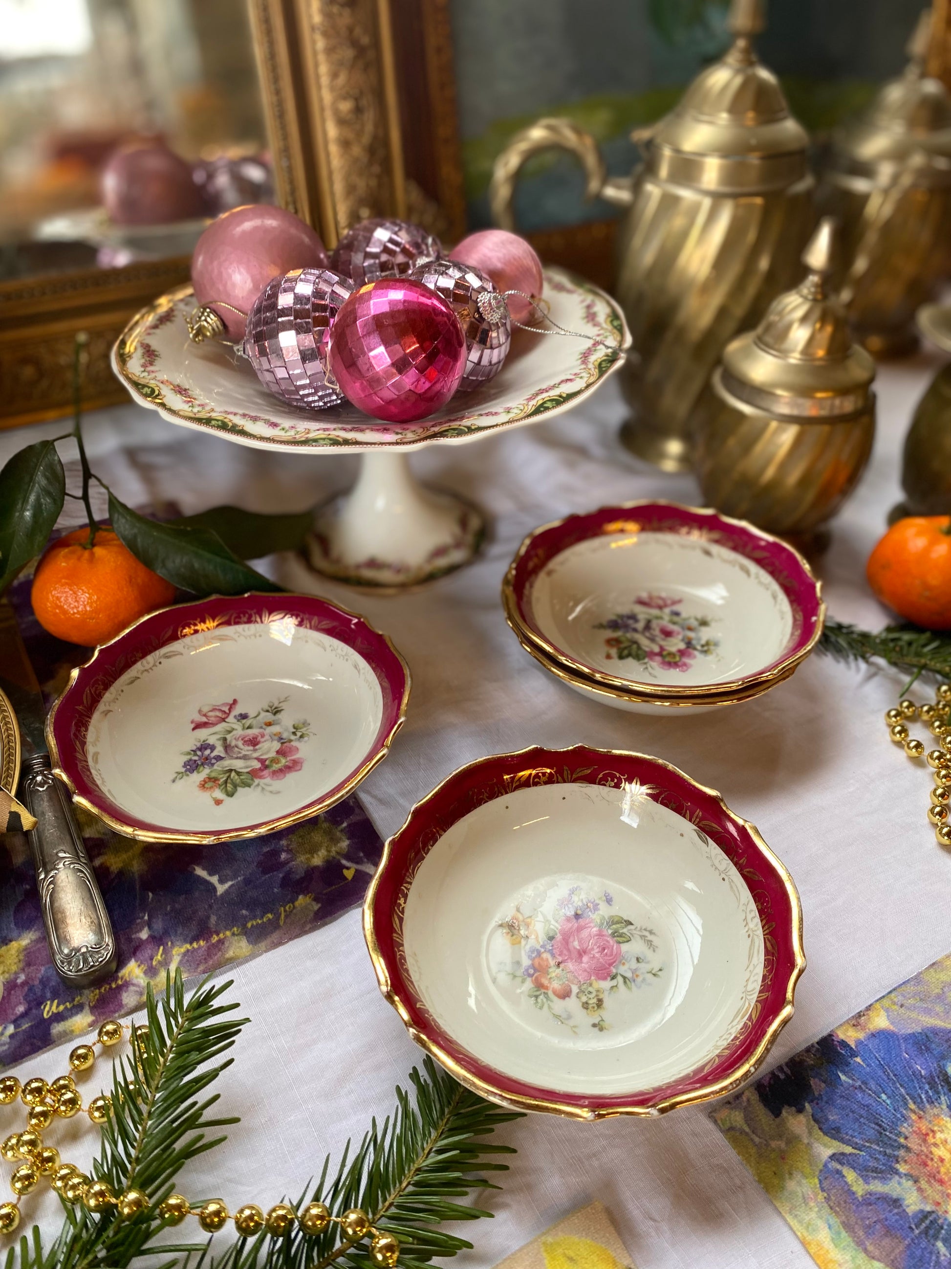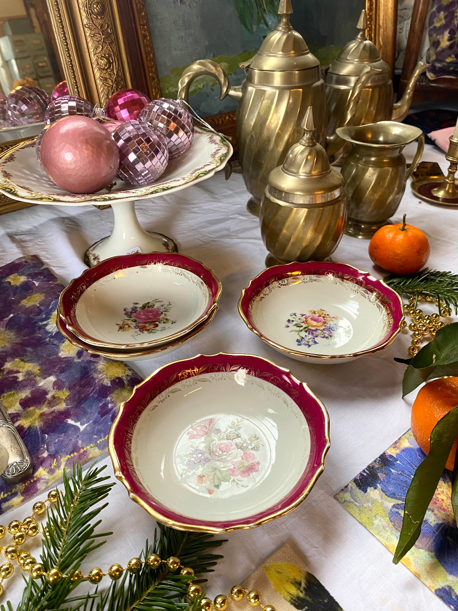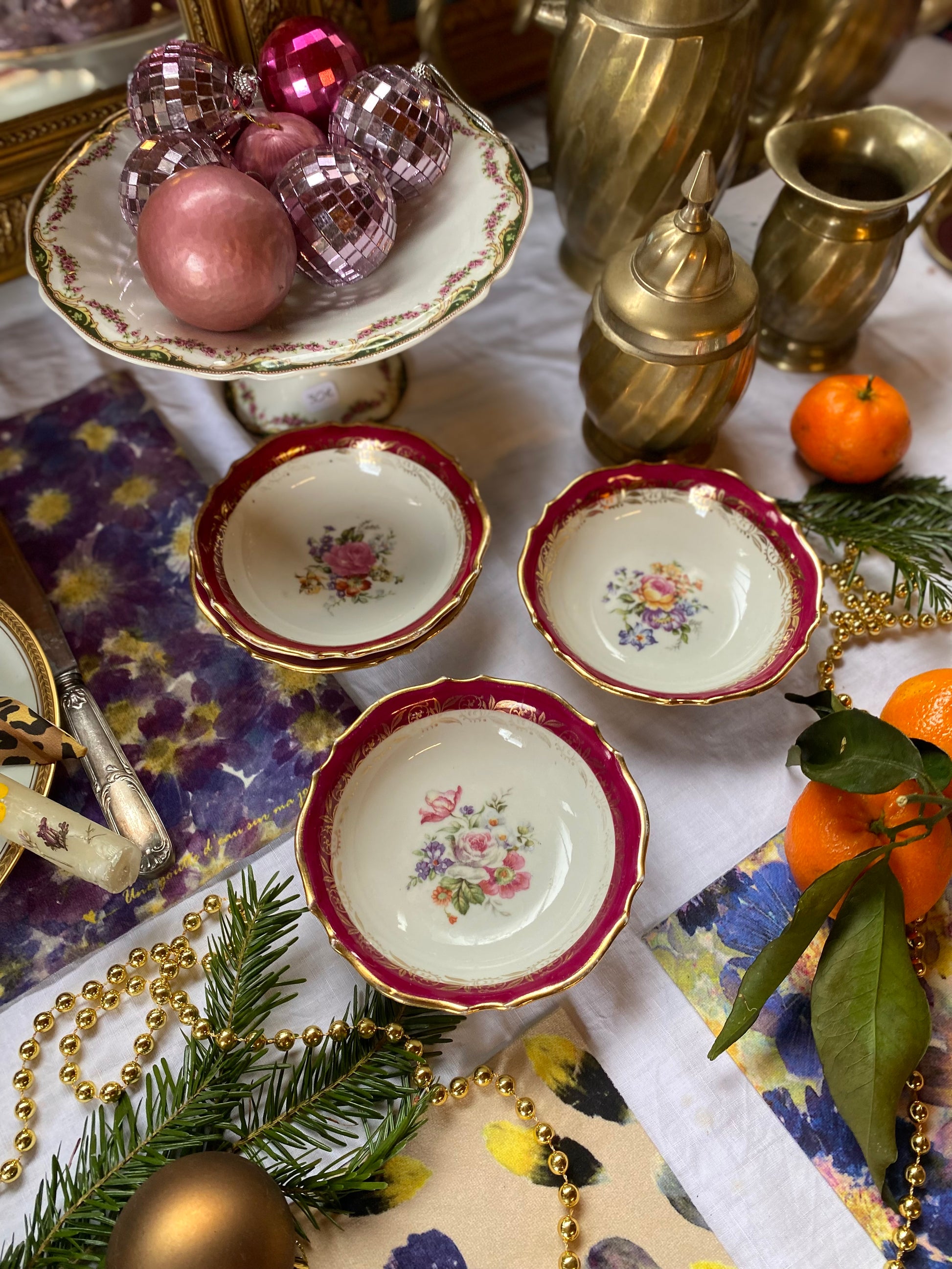 Ravissant ensemble de 4 ramequins en faïence ancienne au délicieux décor floral dans des teintes bordeaux.