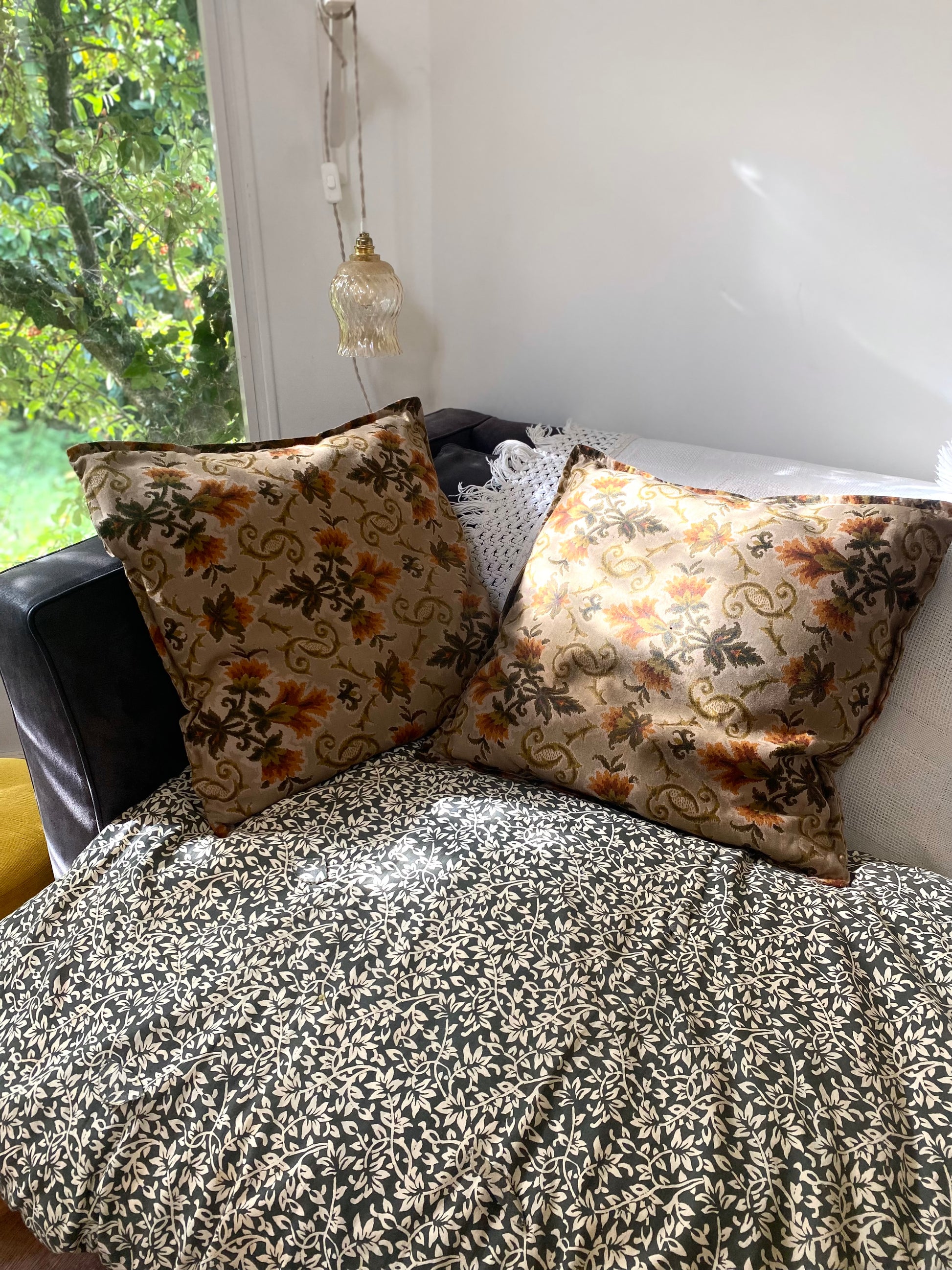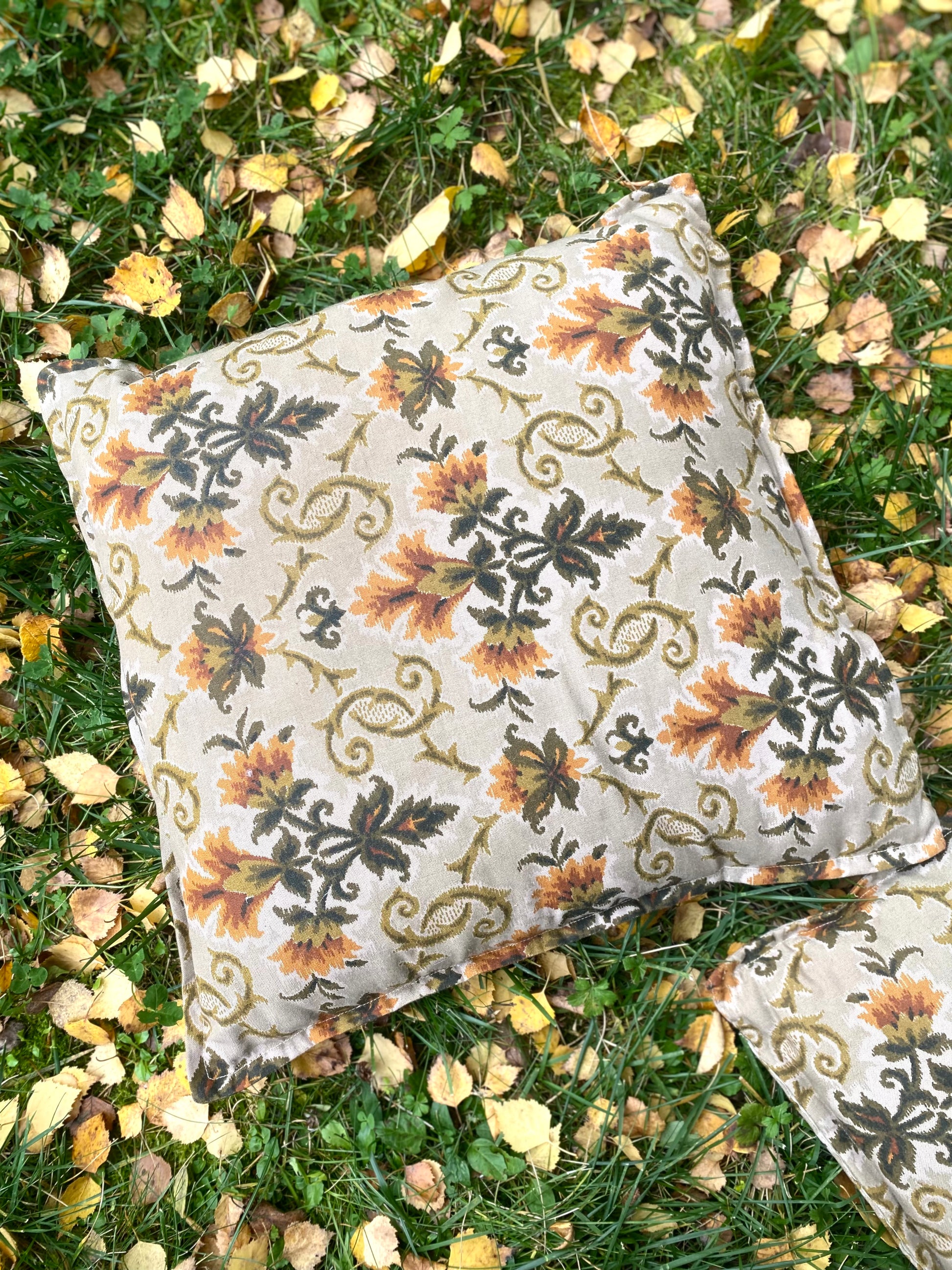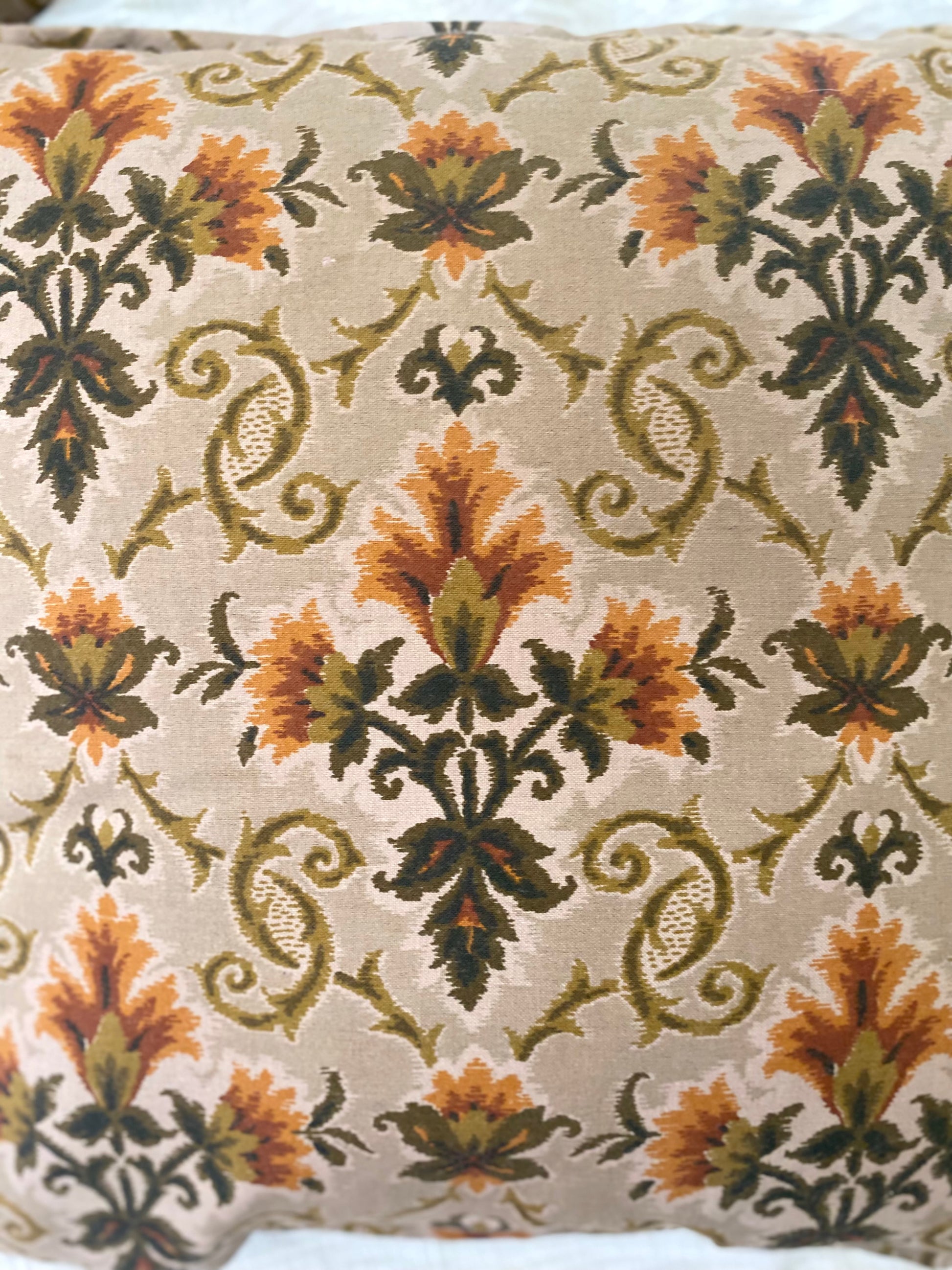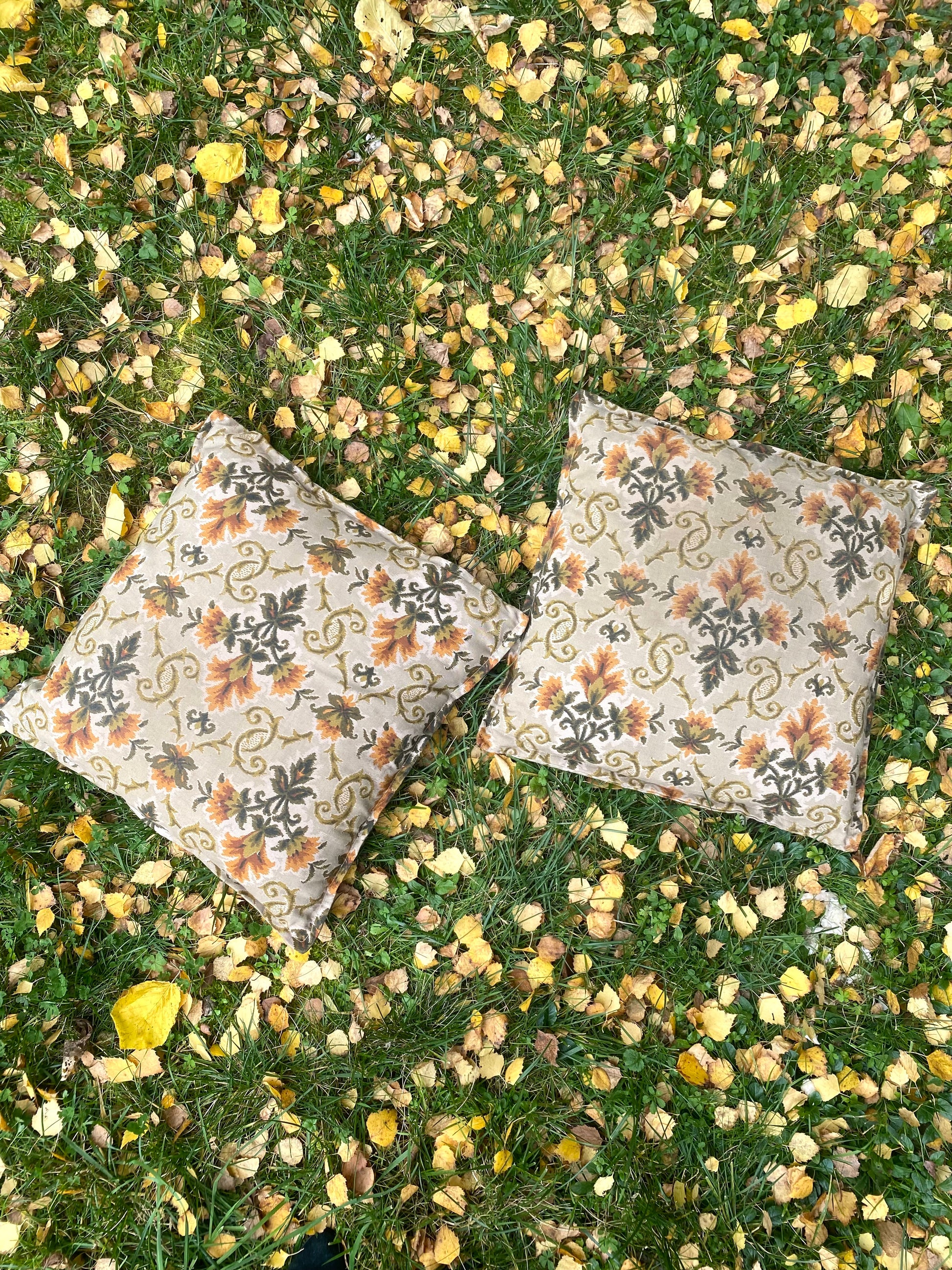 Ravissant duo de coussins en jacquard des années 70 présentant un motif floral et feuillu symétrique et répétitif, rappelant un style damassé ou un motif textile historique dans des tons chauds et organiques.