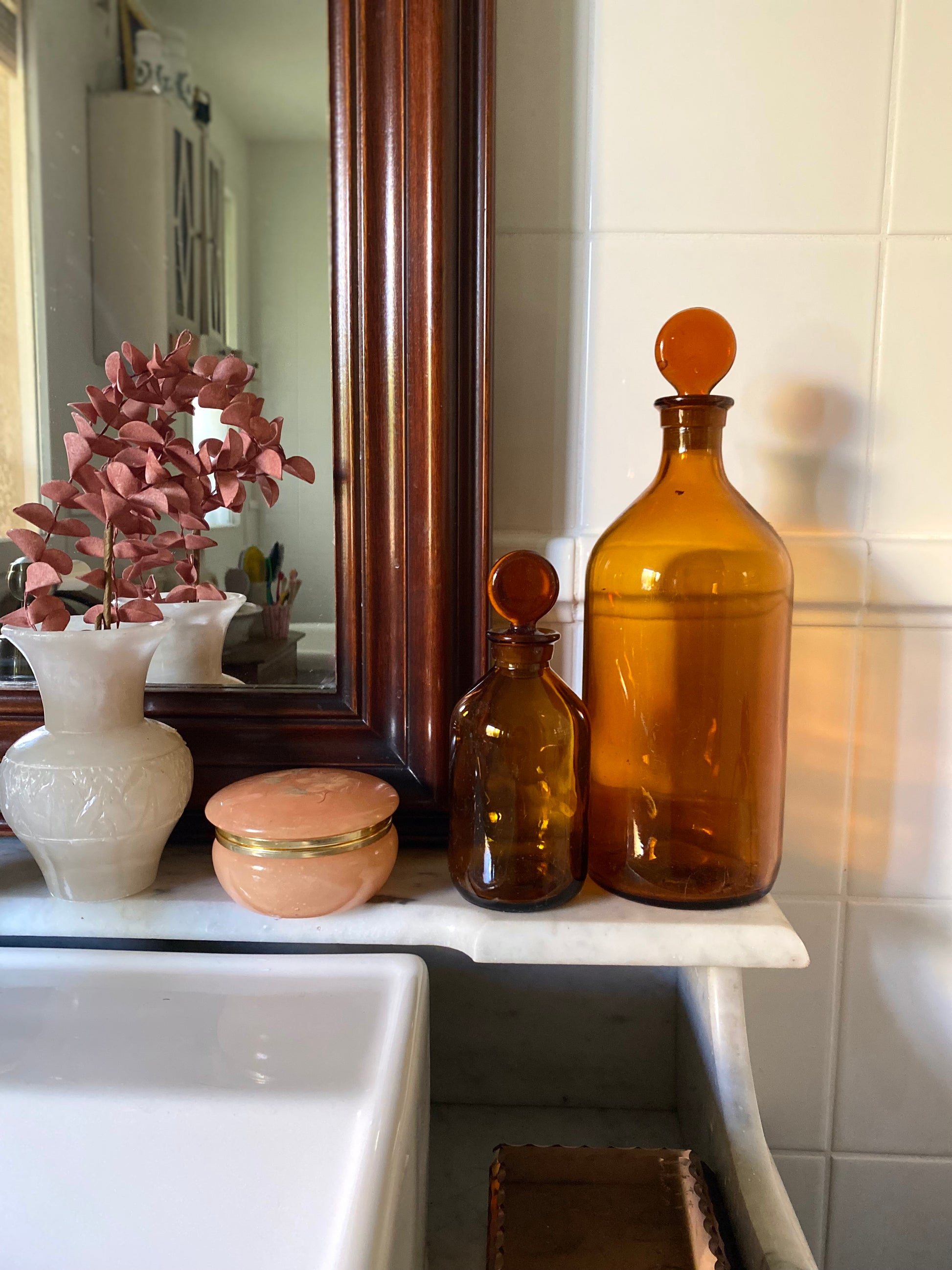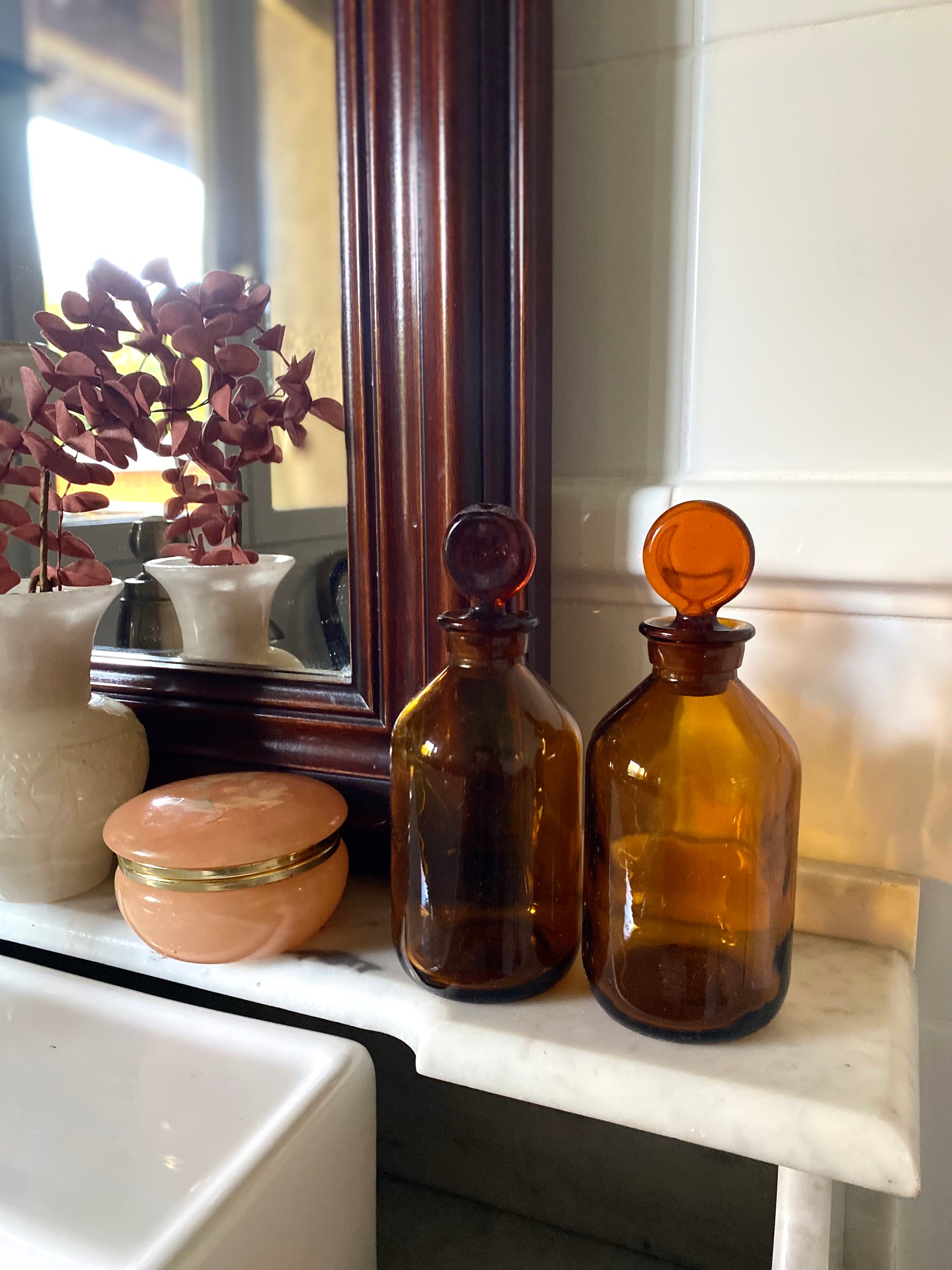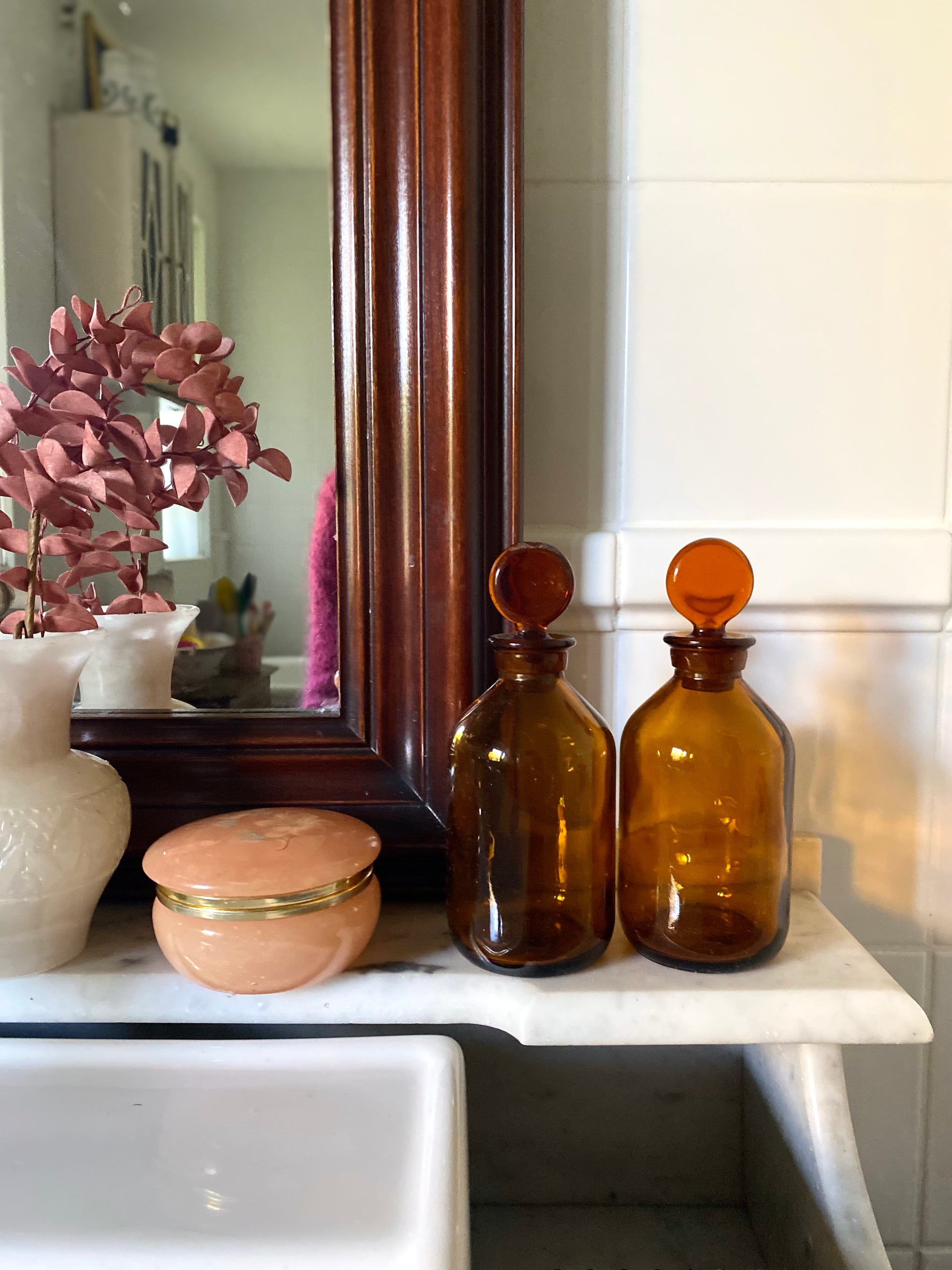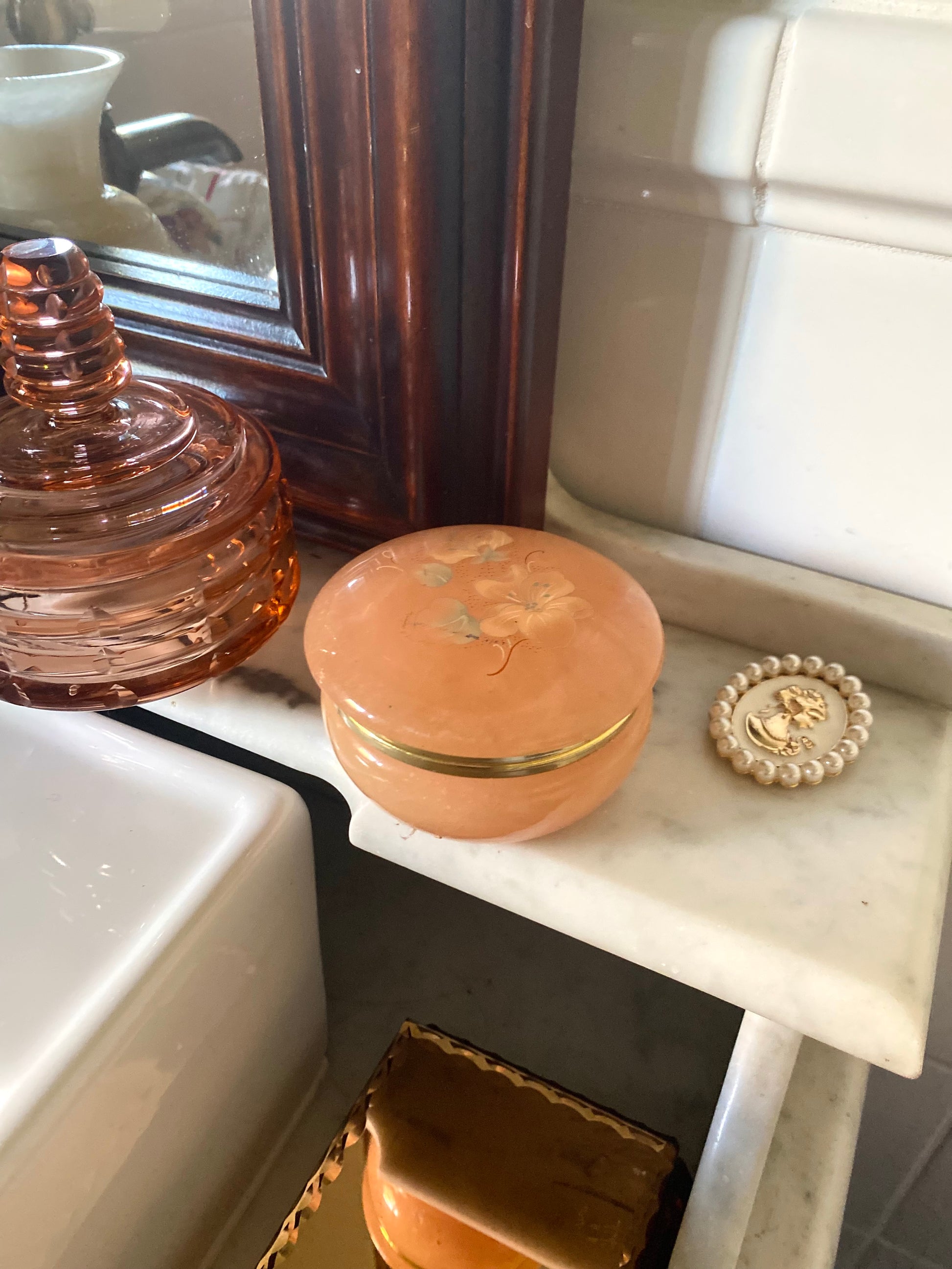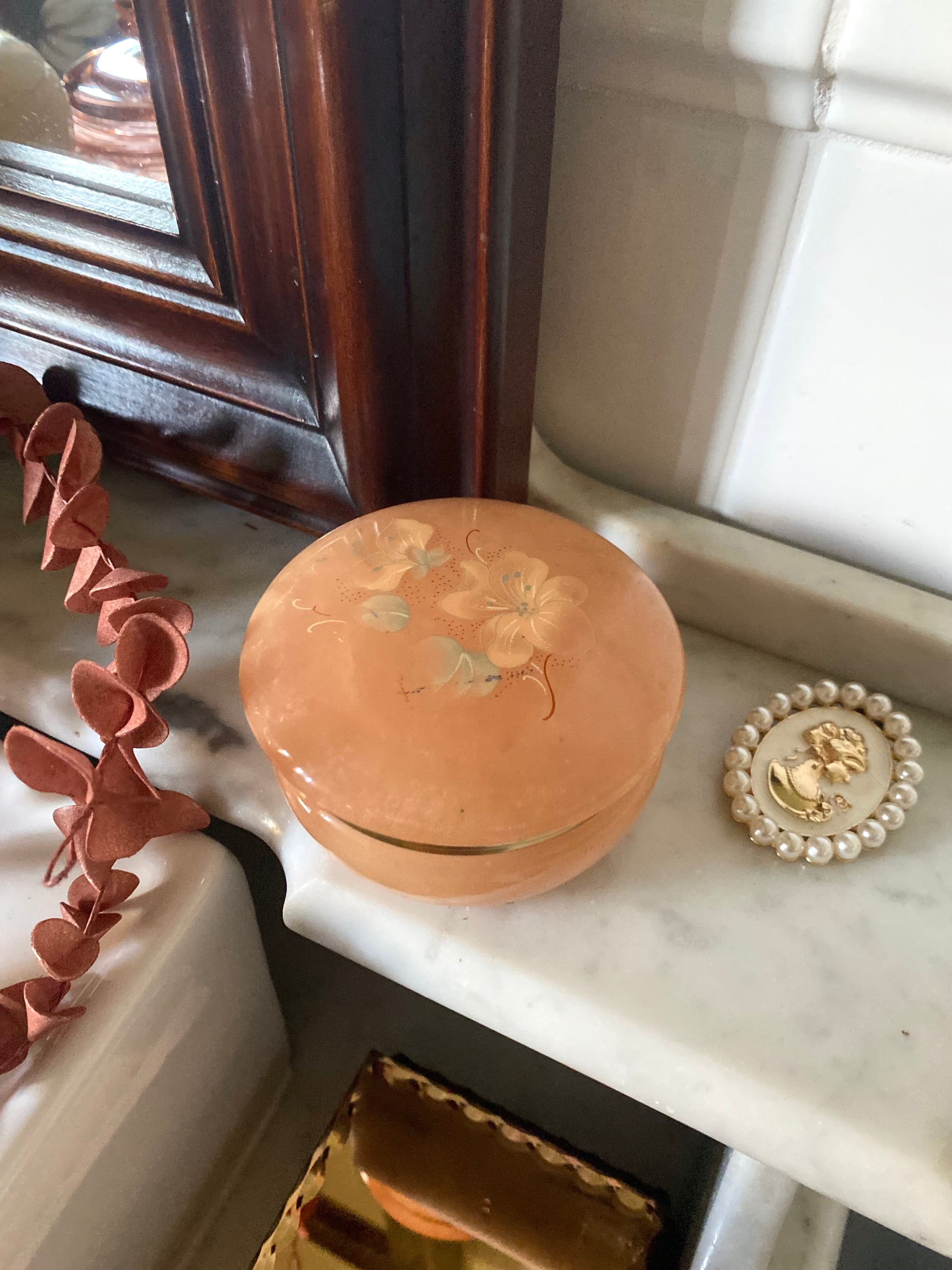 Élégante boîte à bijoux datant des années 1950 en albâtre avec un cerclage en laiton.