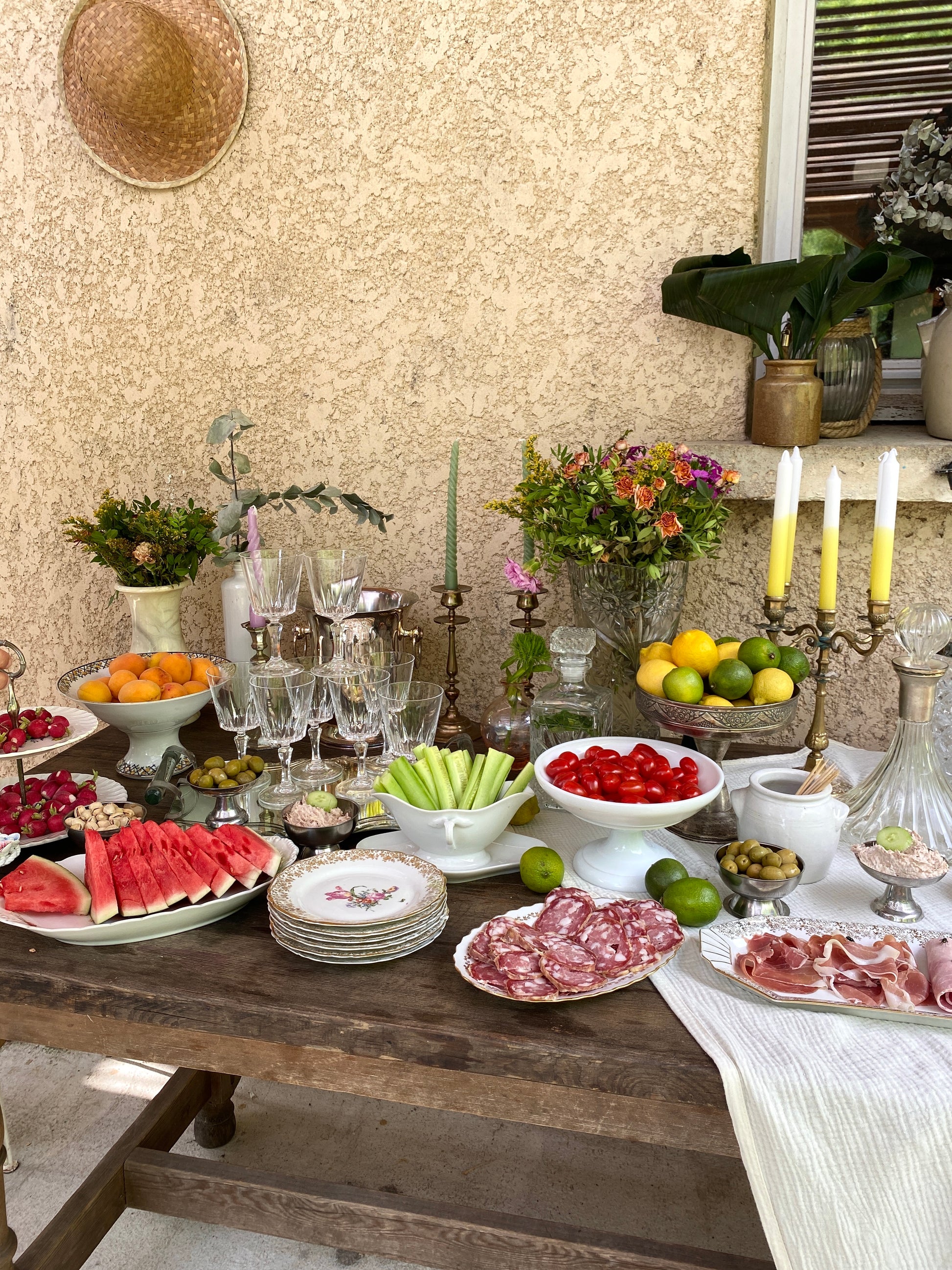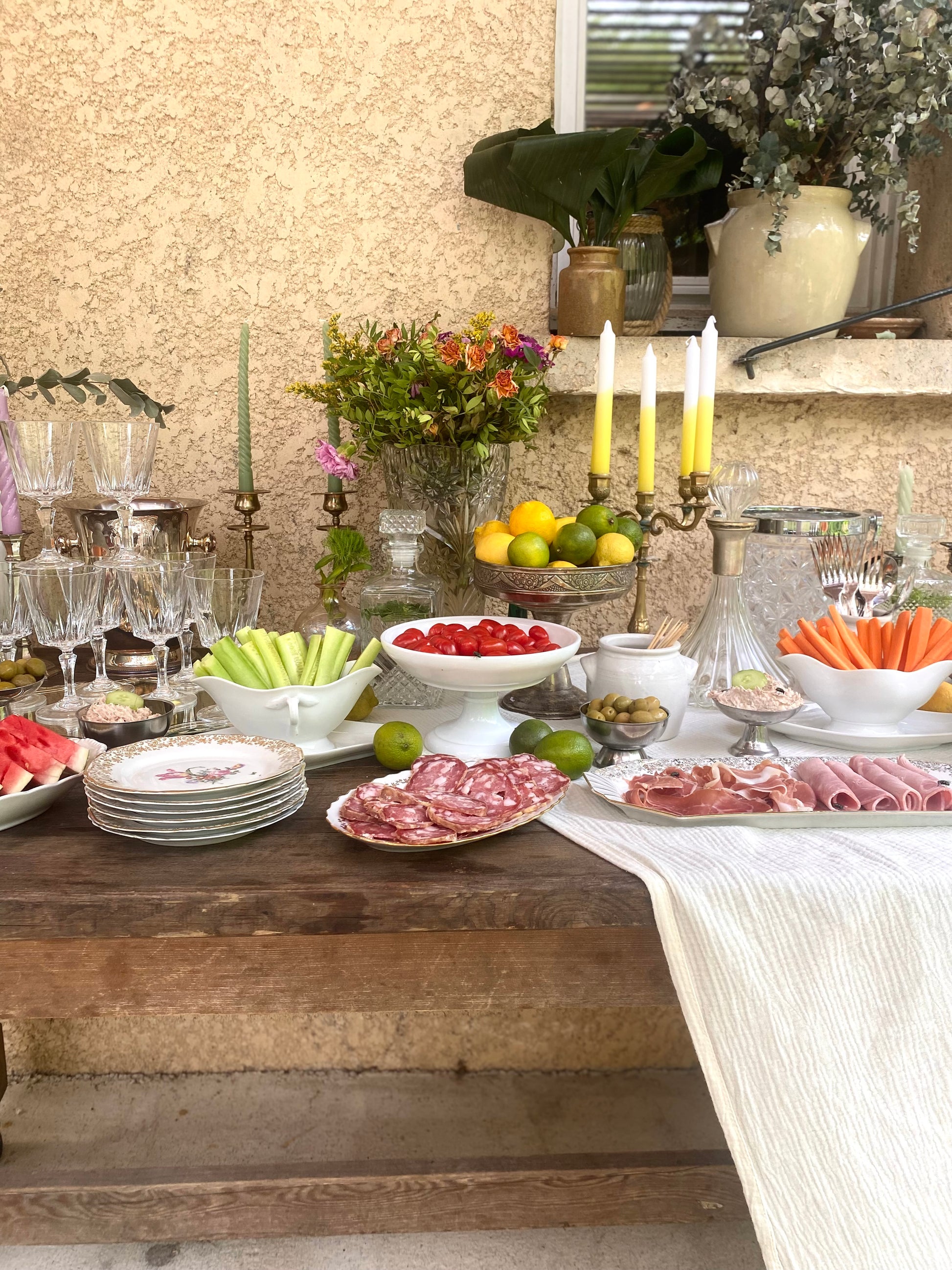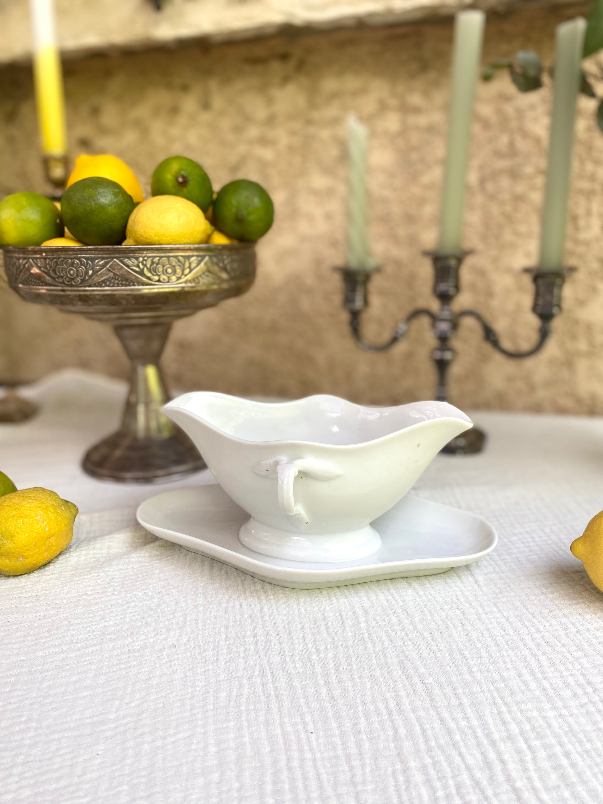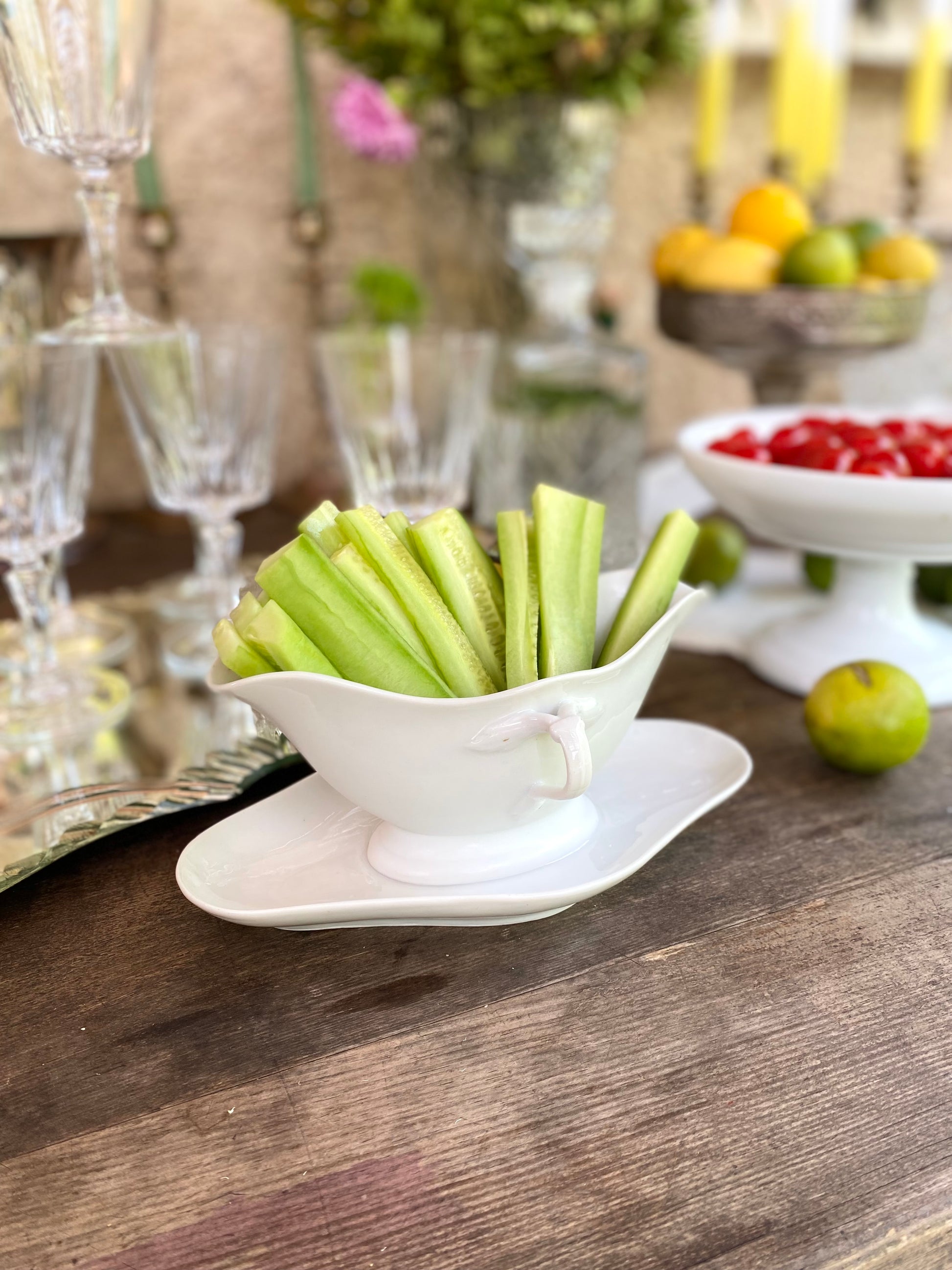 Ravissante saucière en faïence ancienne que j’adore détourner en coupe pour présenter les crudités et créer des apéros et des buffets aussi visuels qu’élégants.