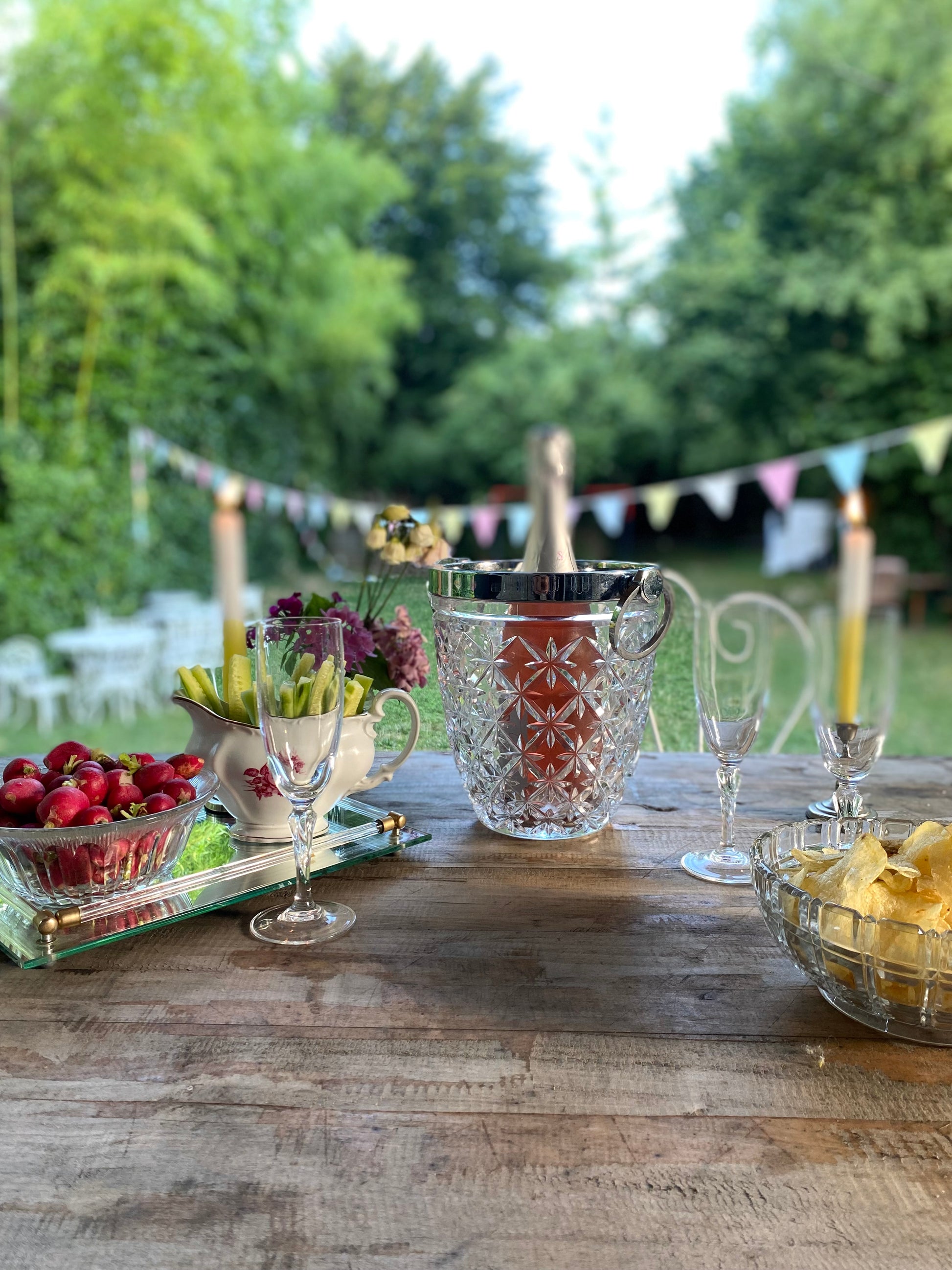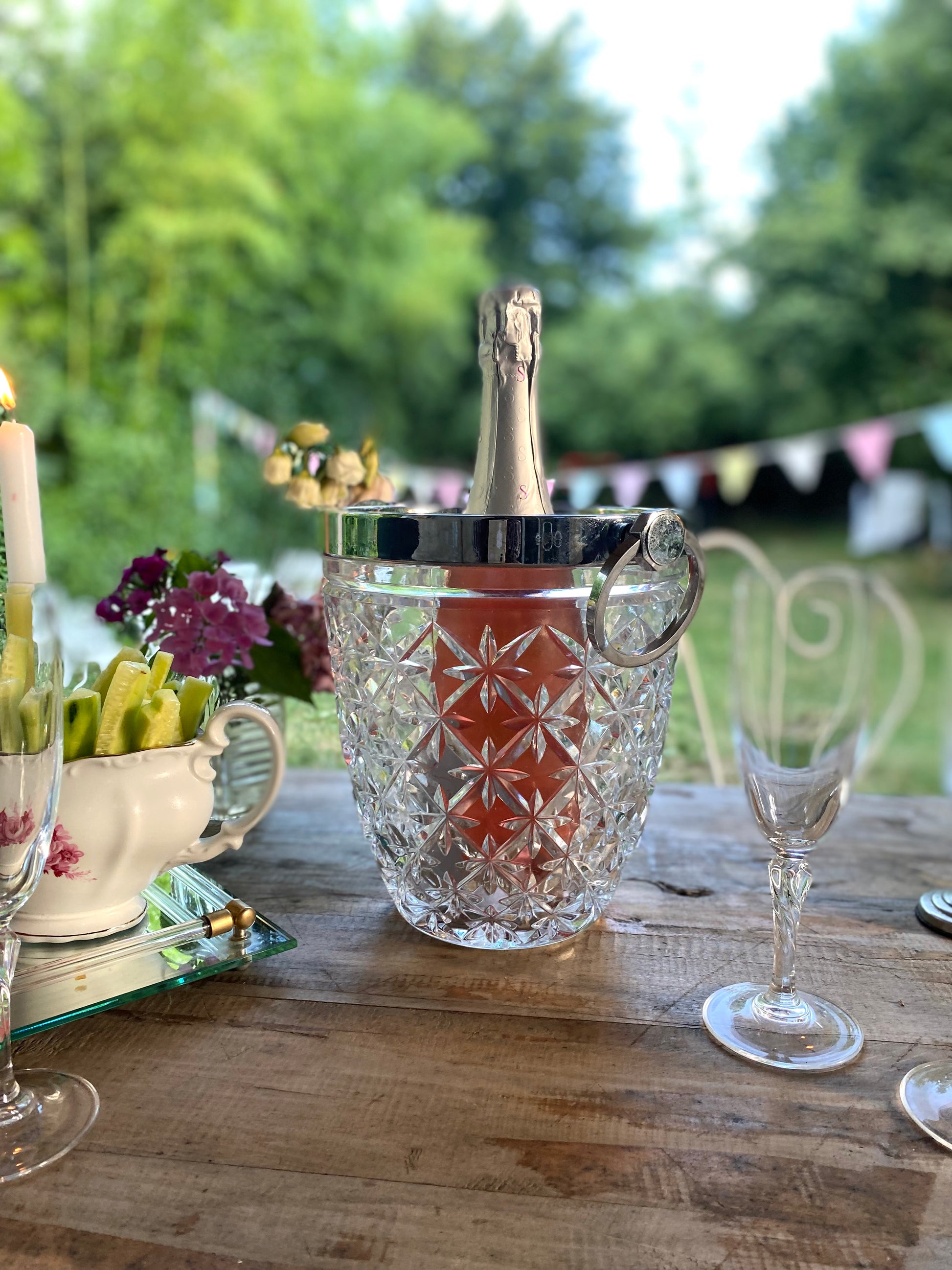 Seau à champagne ancien en verre moulé et poignets en métal argenté