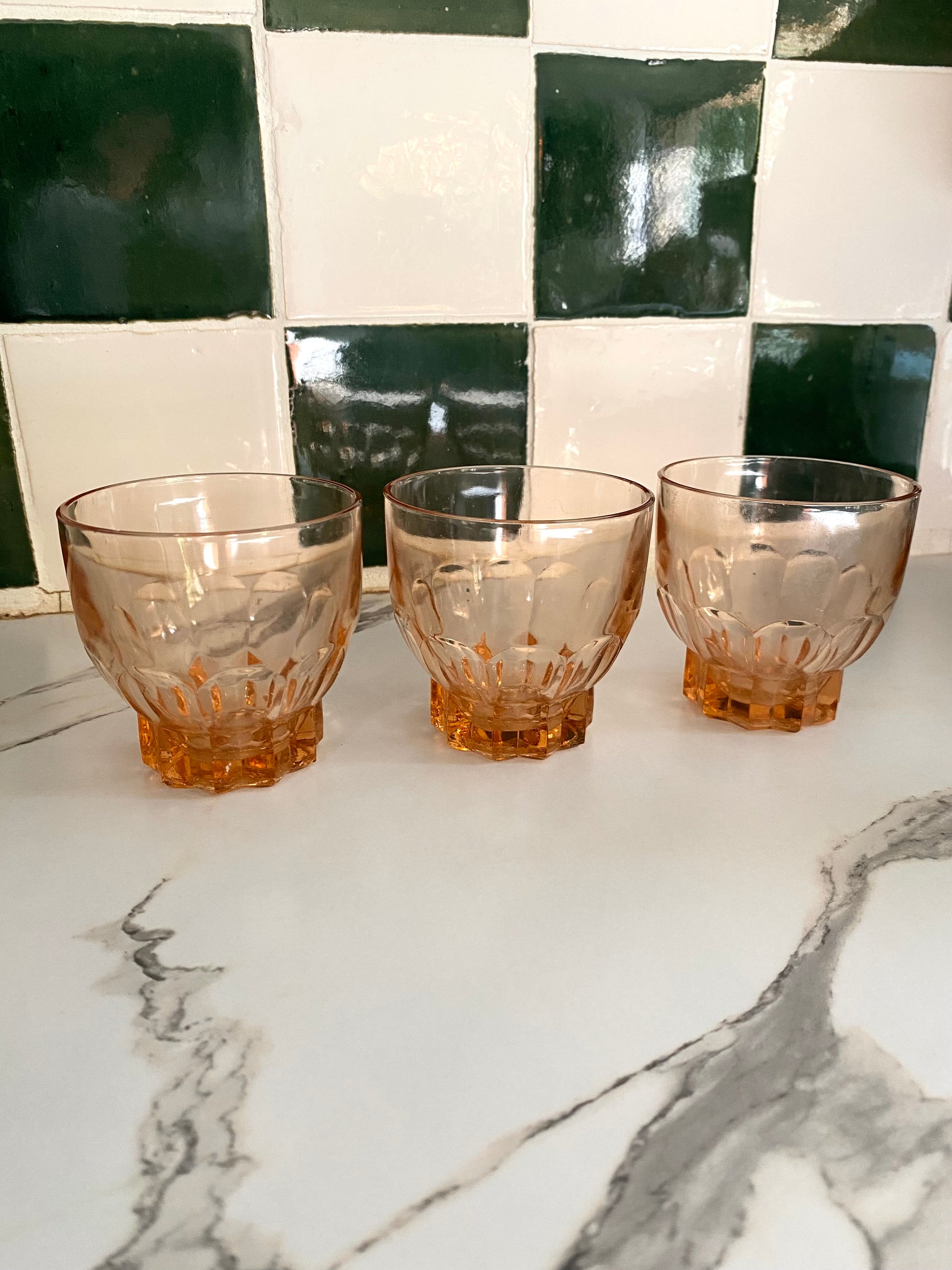 Adorable service de 9 petits verres ou gobelets en verre ancien dans un joli camaïeu de rose, vert et ambré