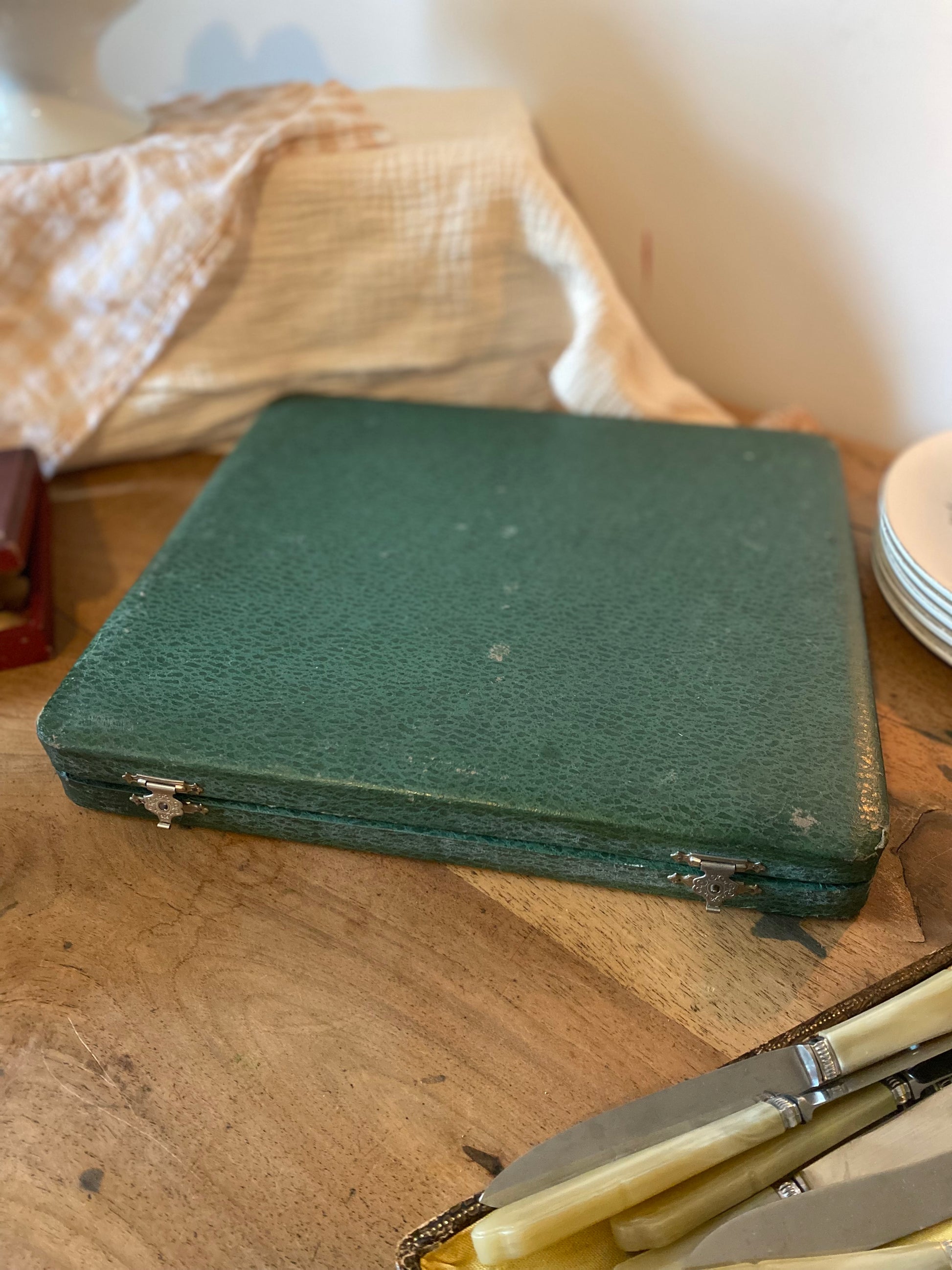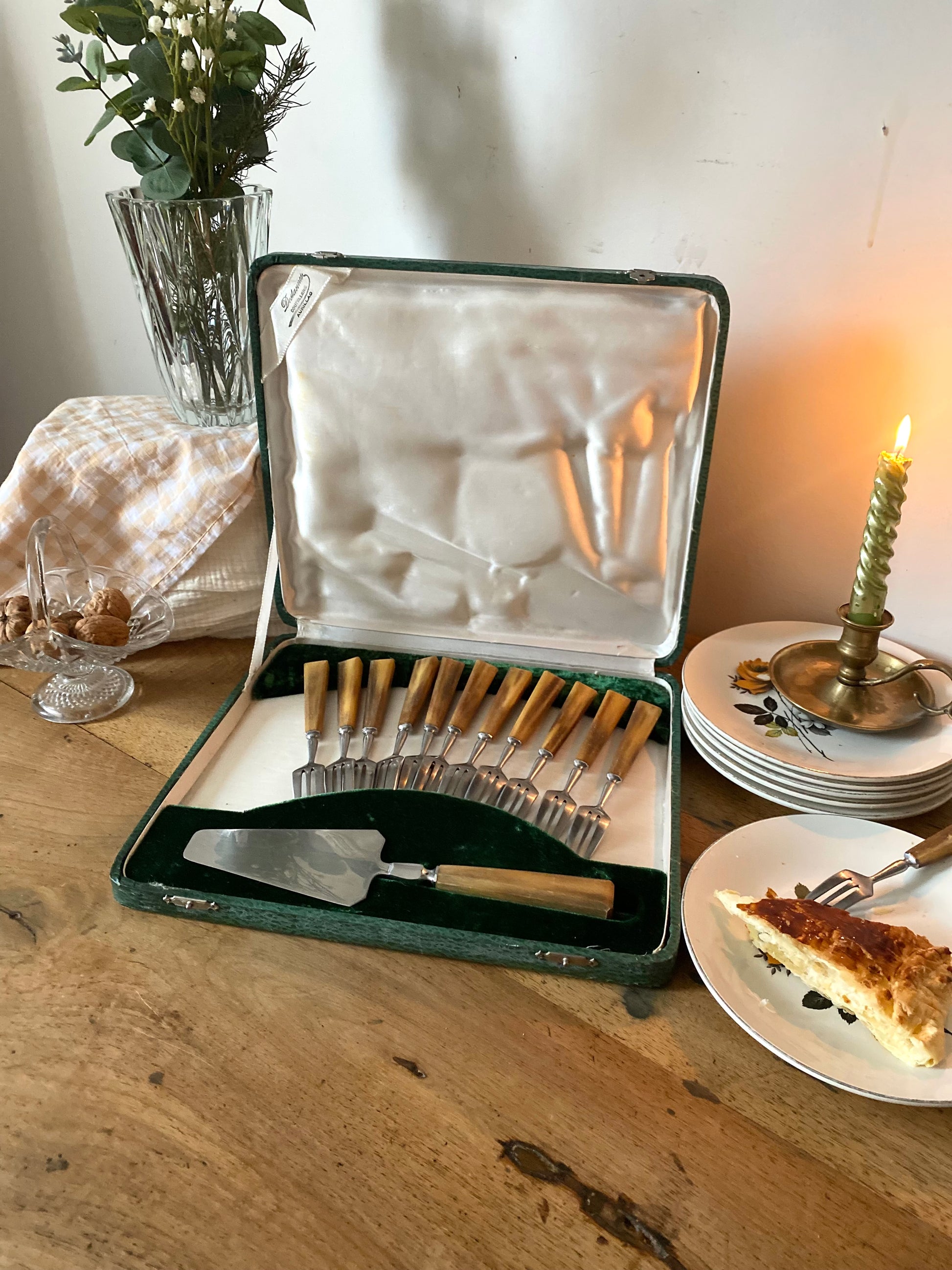 L'étiquette à l'intérieur mentionne probablement une coutellerie d'Aurillac (dans le Cantal). Cette région, avec Thiers, était le cœur de la coutellerie artisanale française. Ce type de coffret était souvent offert comme cadeau de mariage ou pour de grandes occasions durant les "Trente Glorieuses".