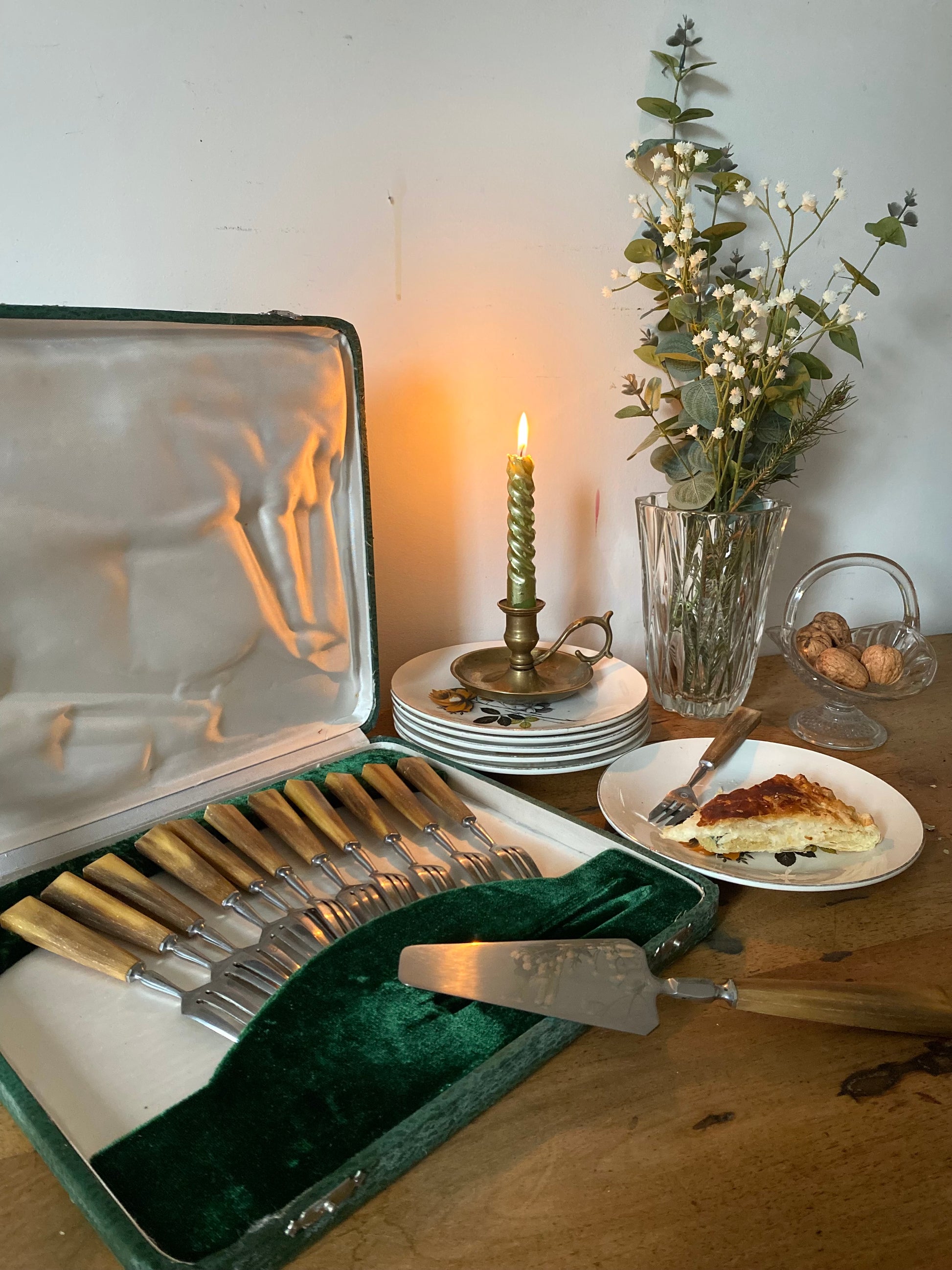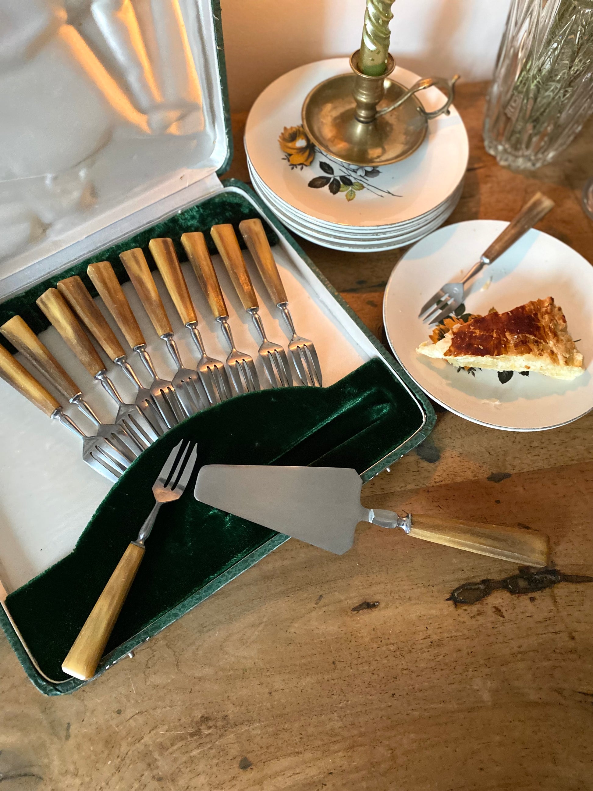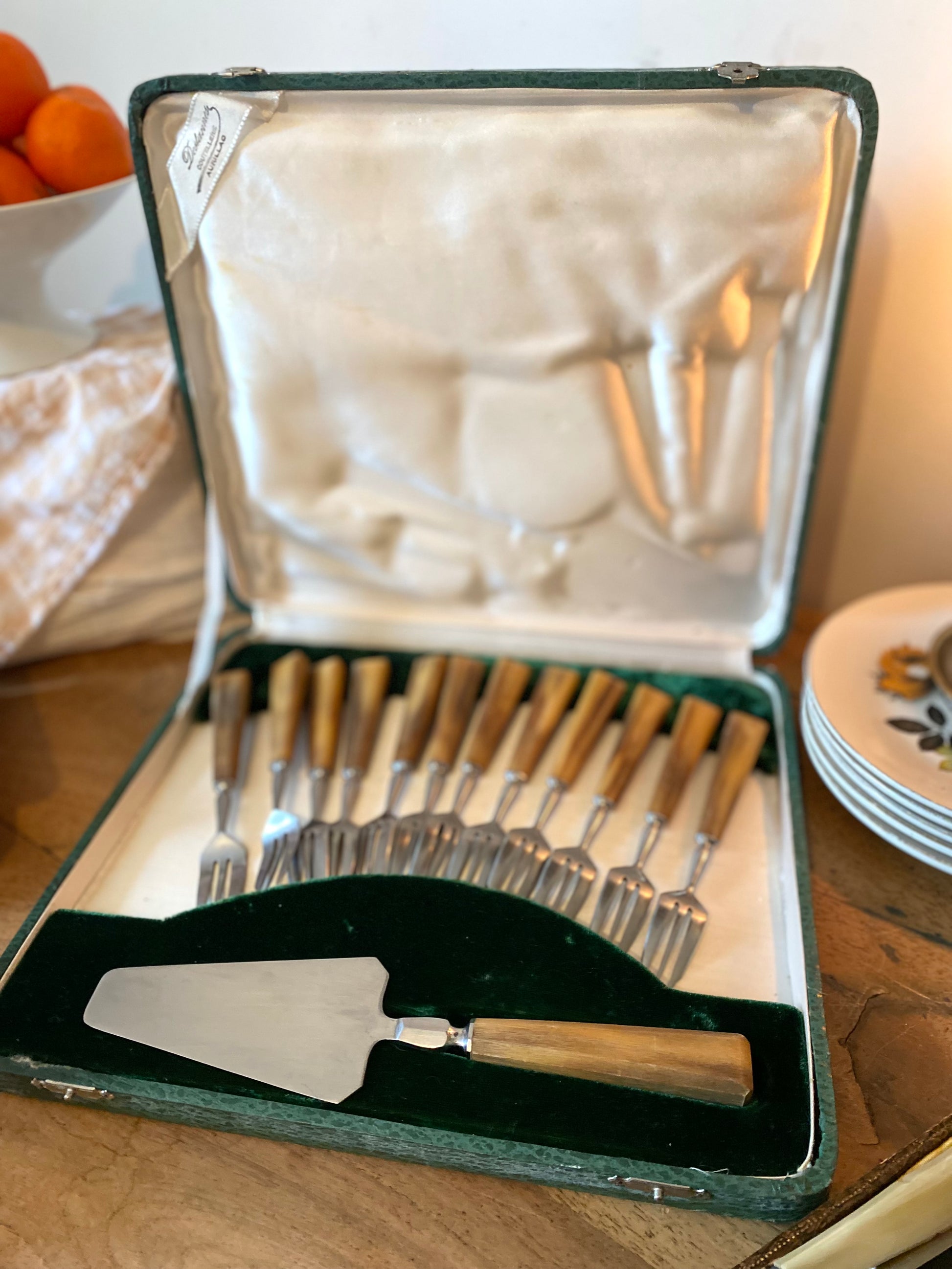 Il est composé de 12 fourchettes à dessert et une pelle à tarte dans leur boîte d’origine.