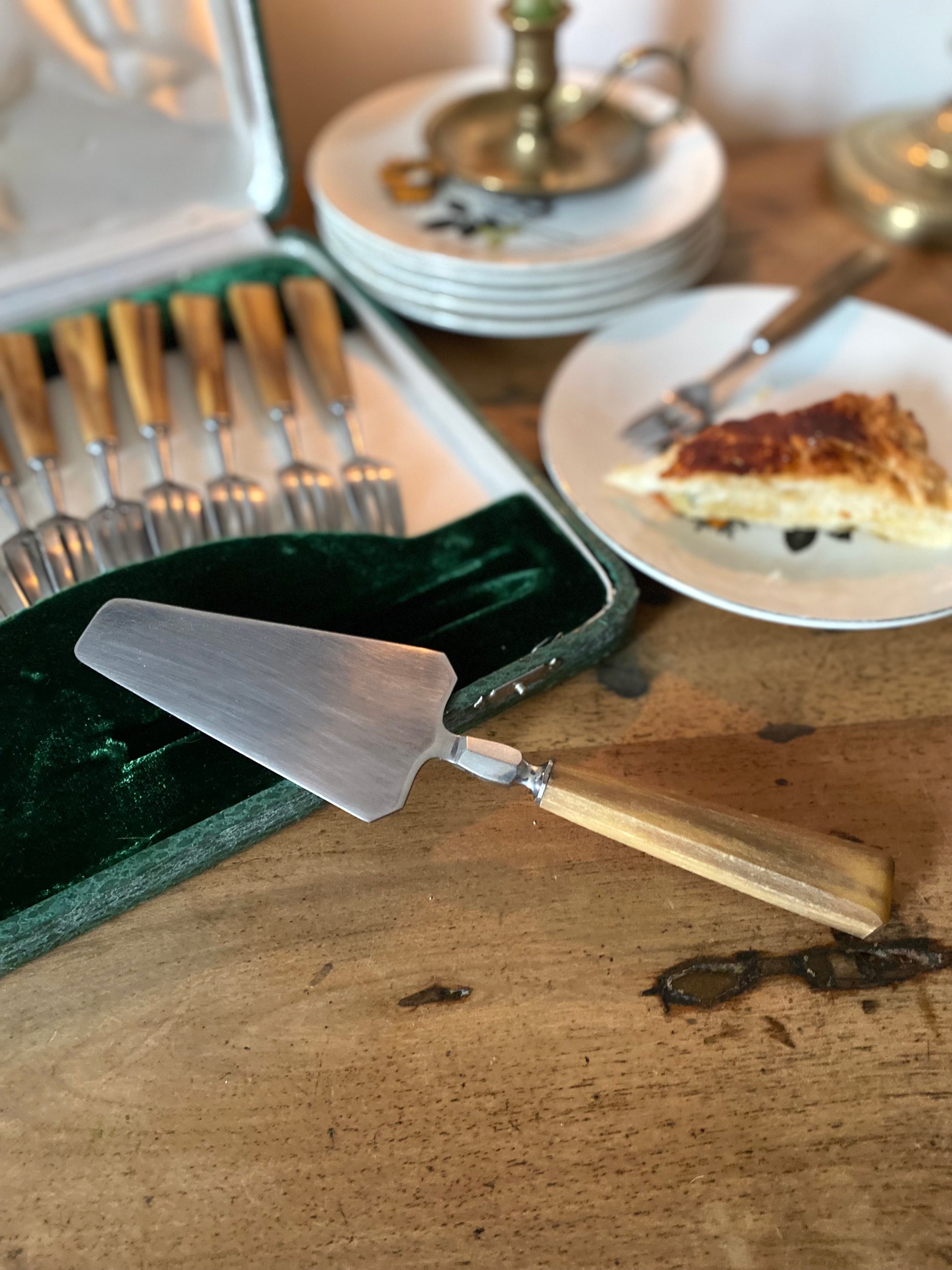 Élégant ensemble de couverts à dessert datant du milieu du XXe siècle en Acier Inoxydable (INOX) et corne qui sera parfait pour servir vos entremets avec élégance.