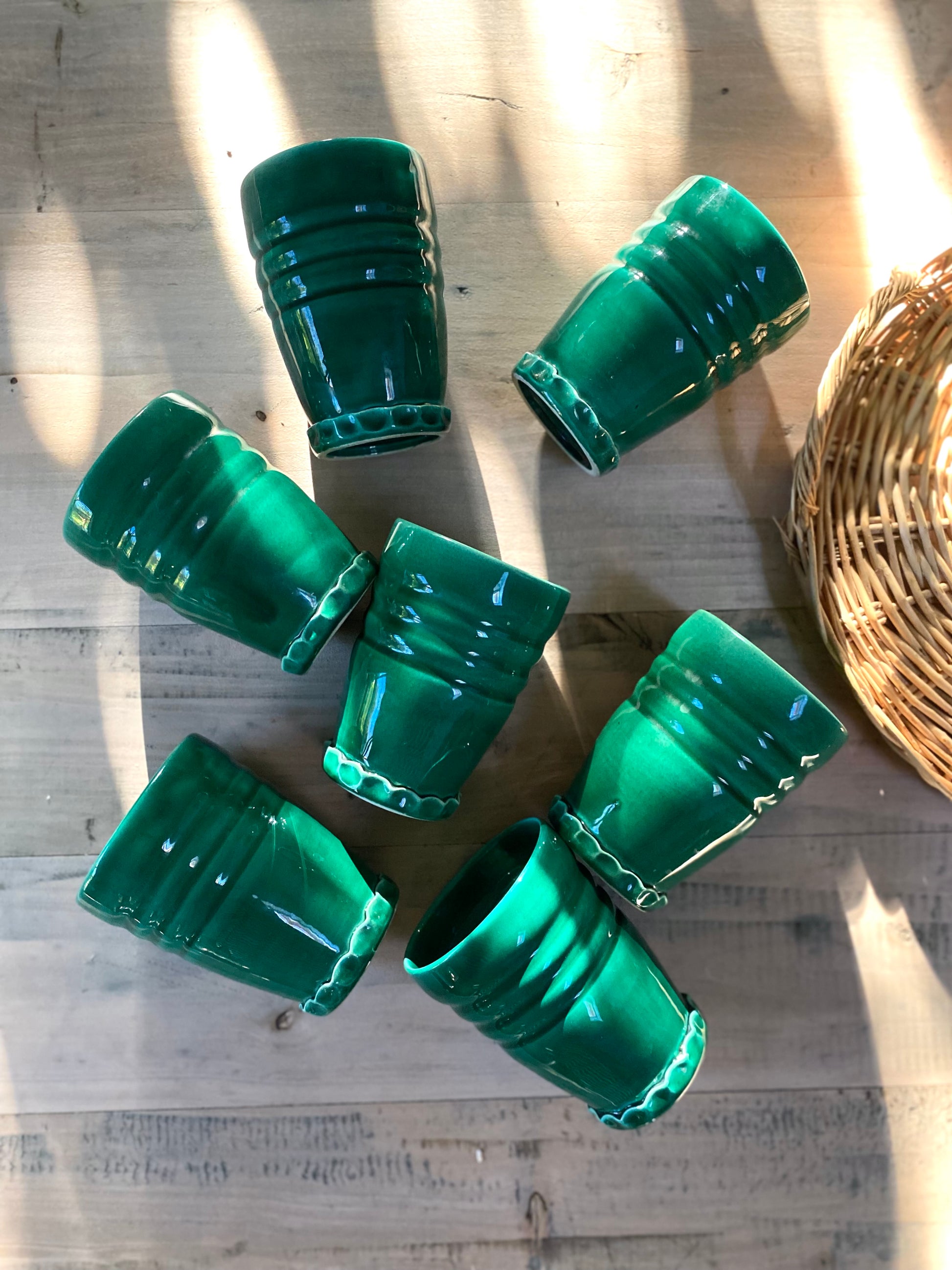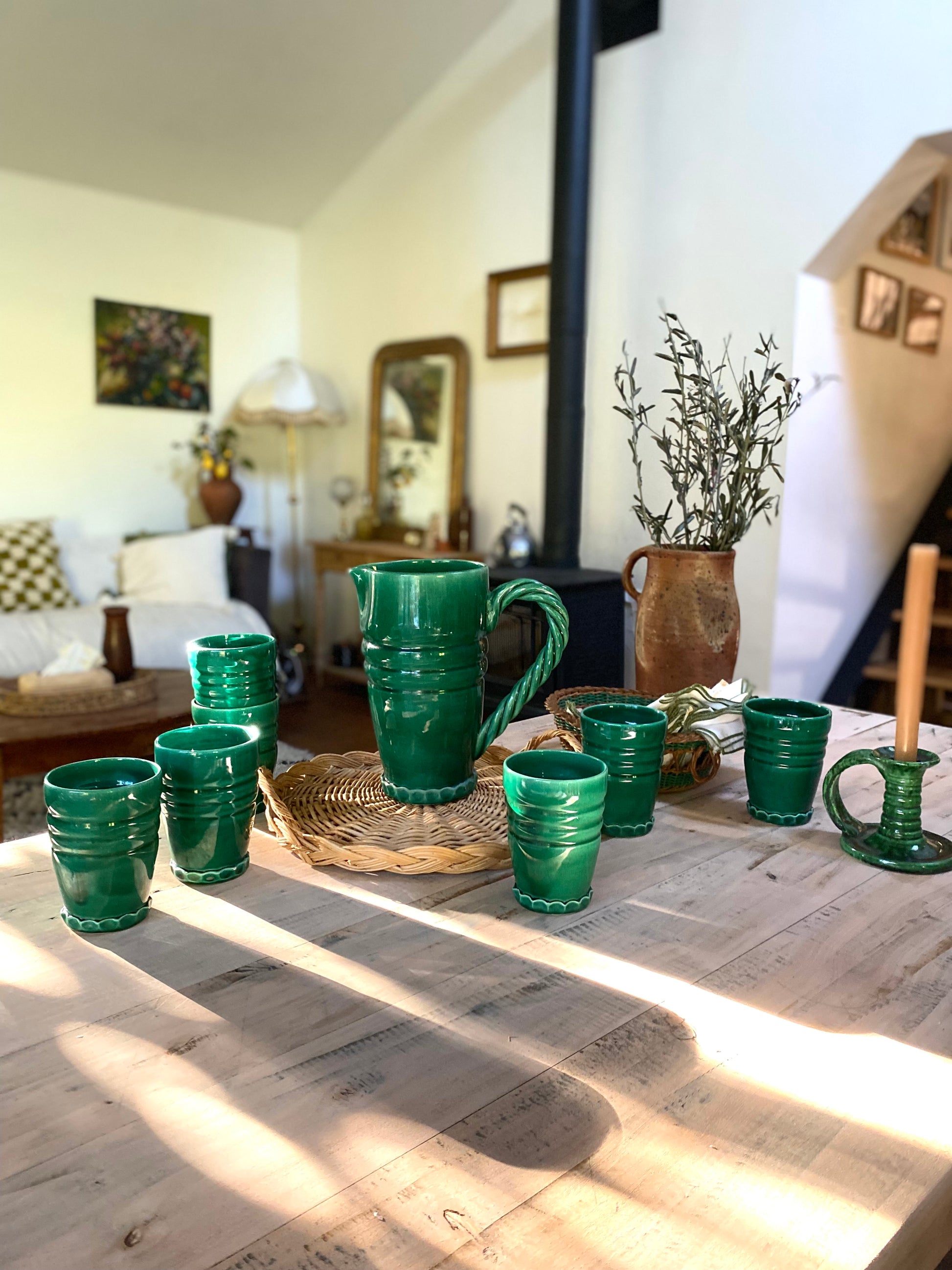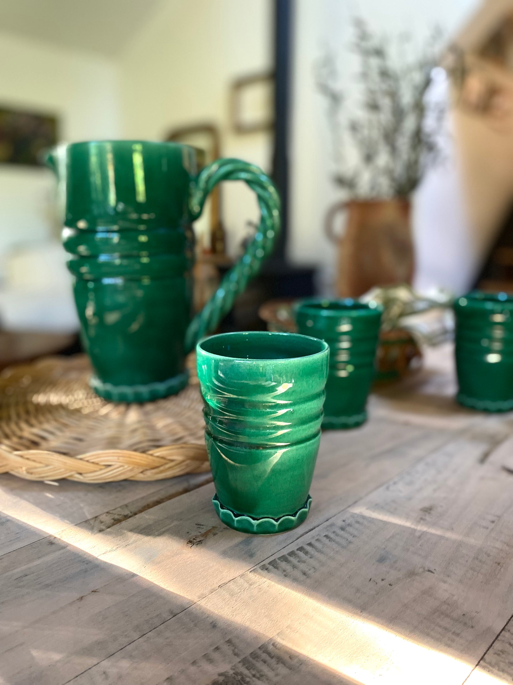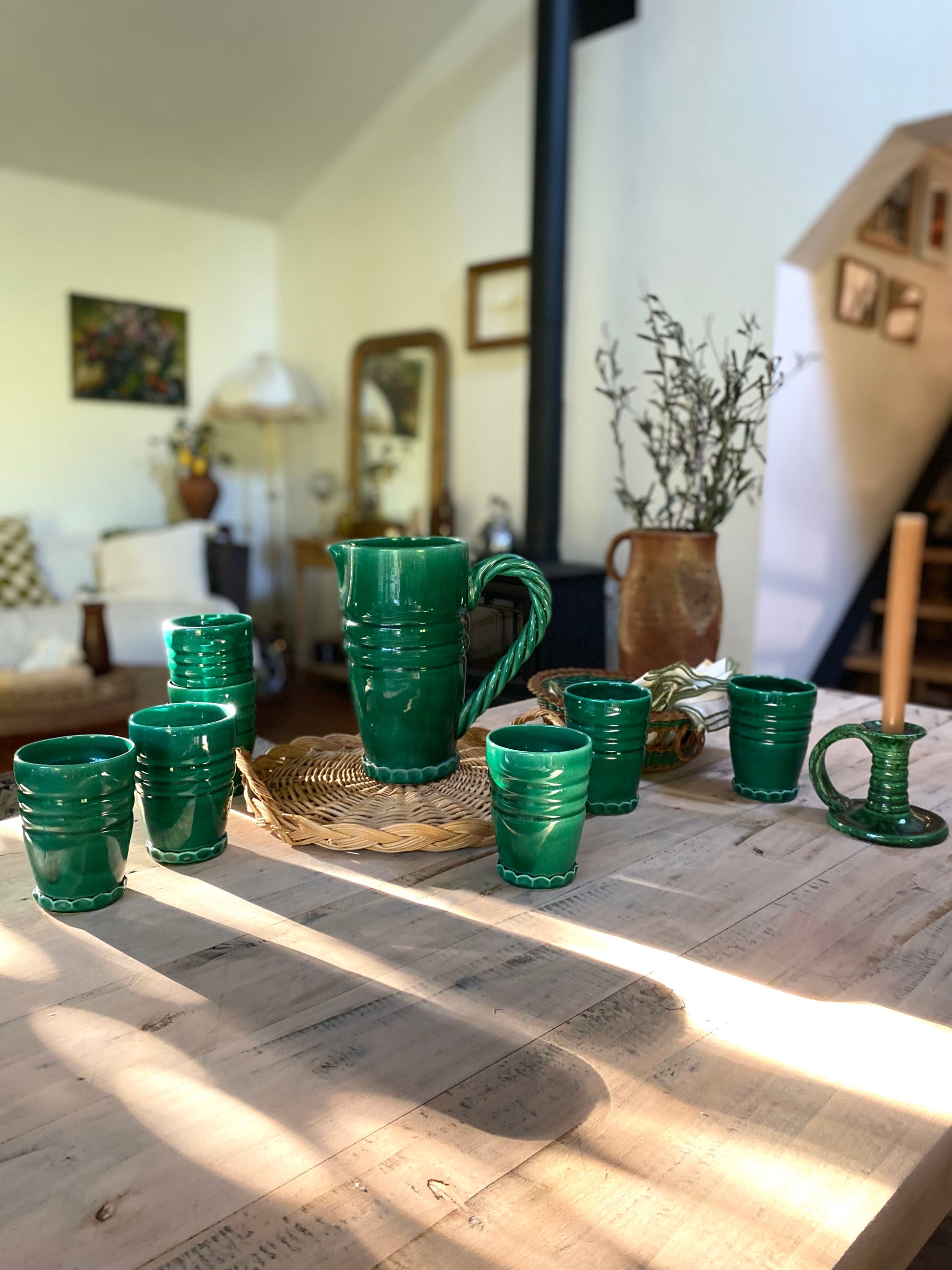 Magnifique service à orangeade en céramique de Vallauris dans un très beau vert profond composé d’un grand pichet et de 7 verres