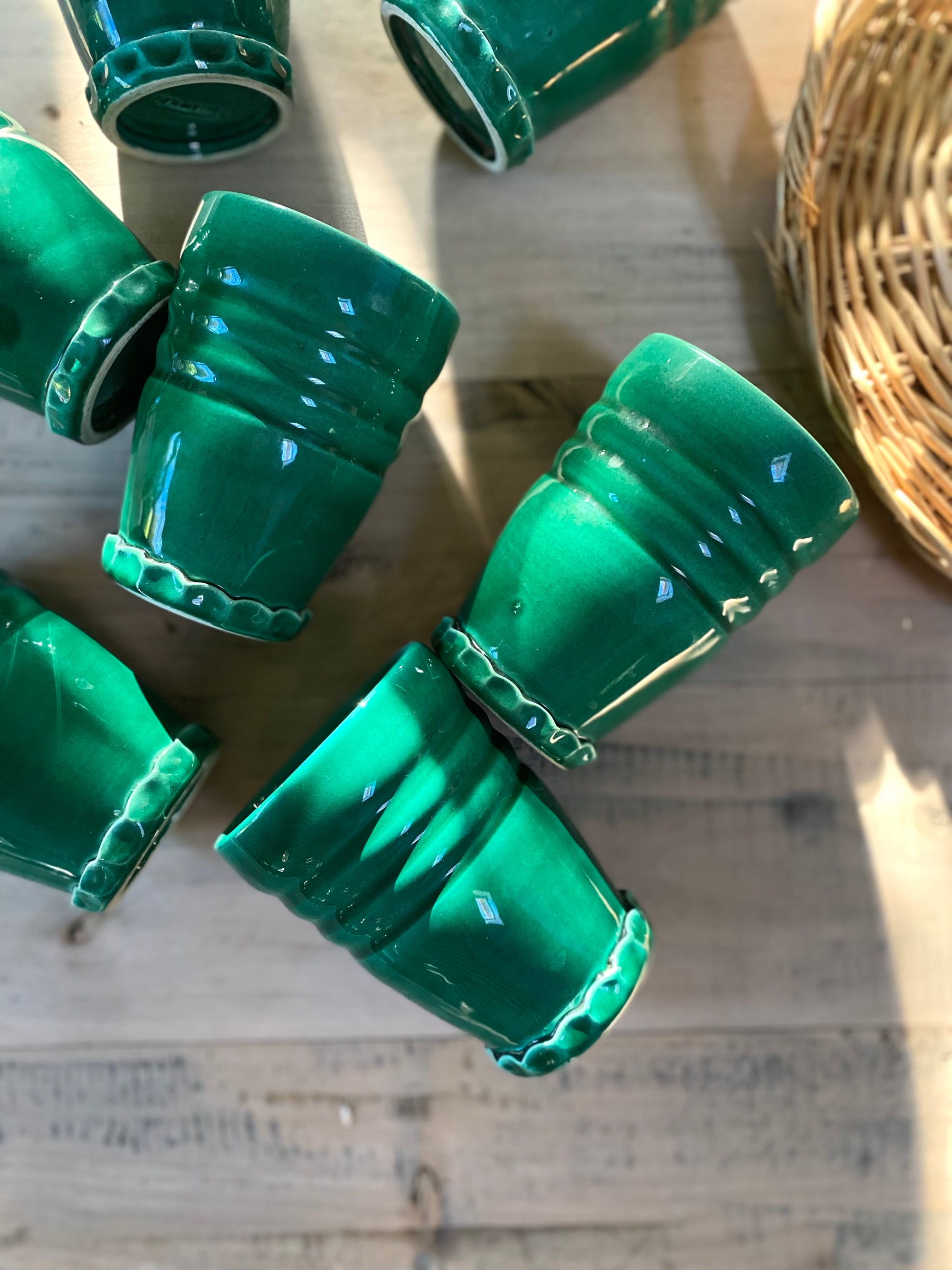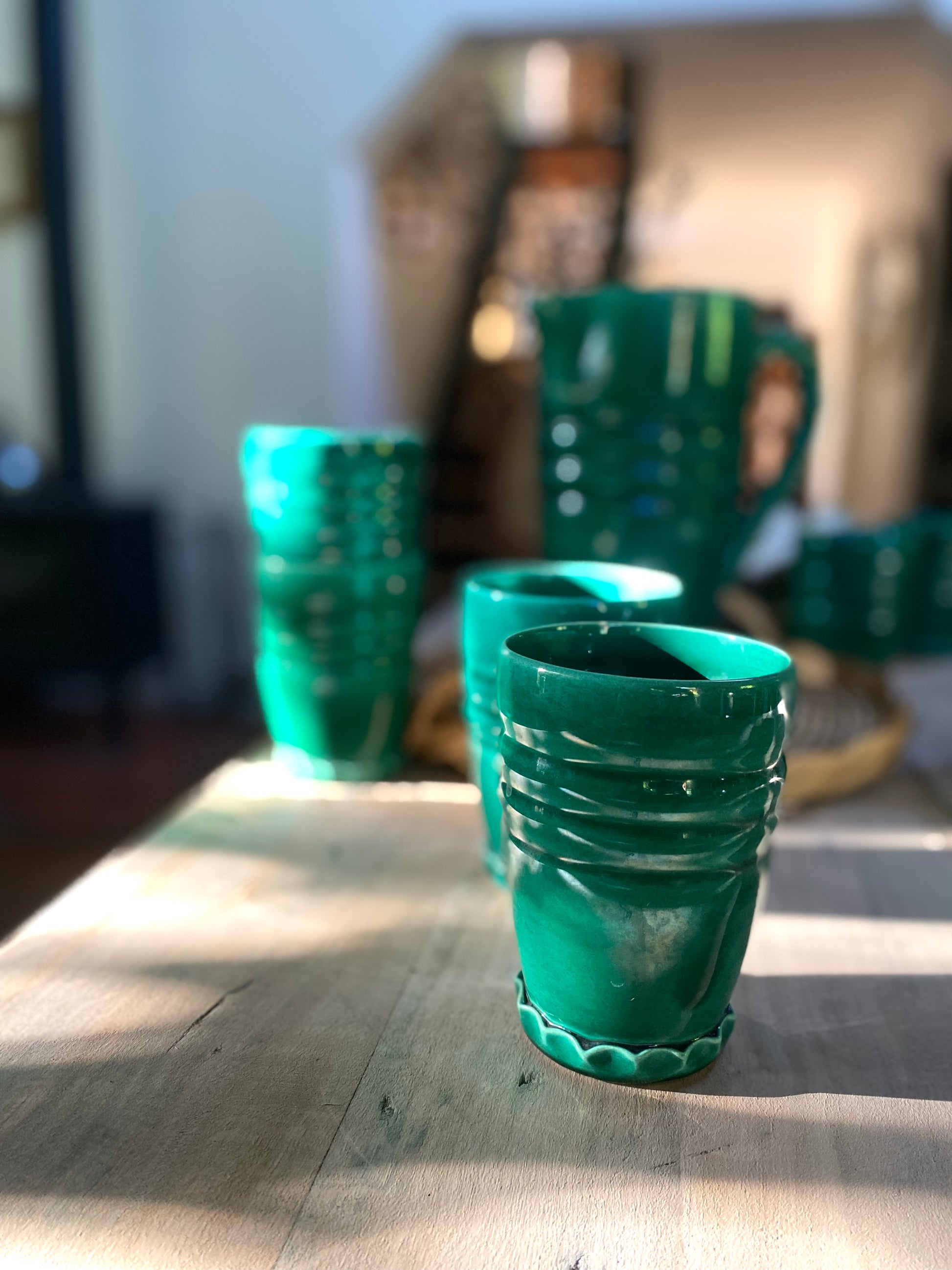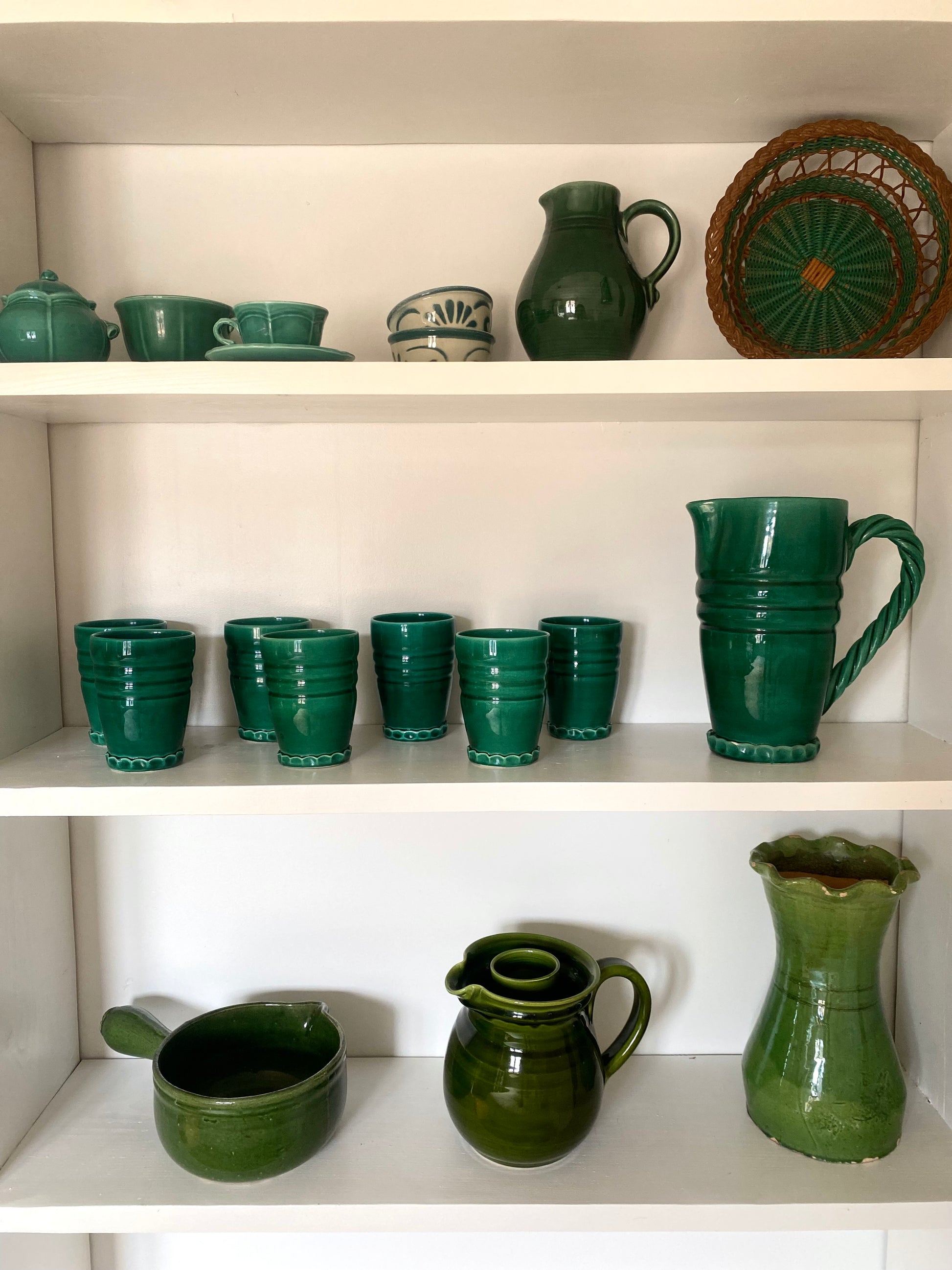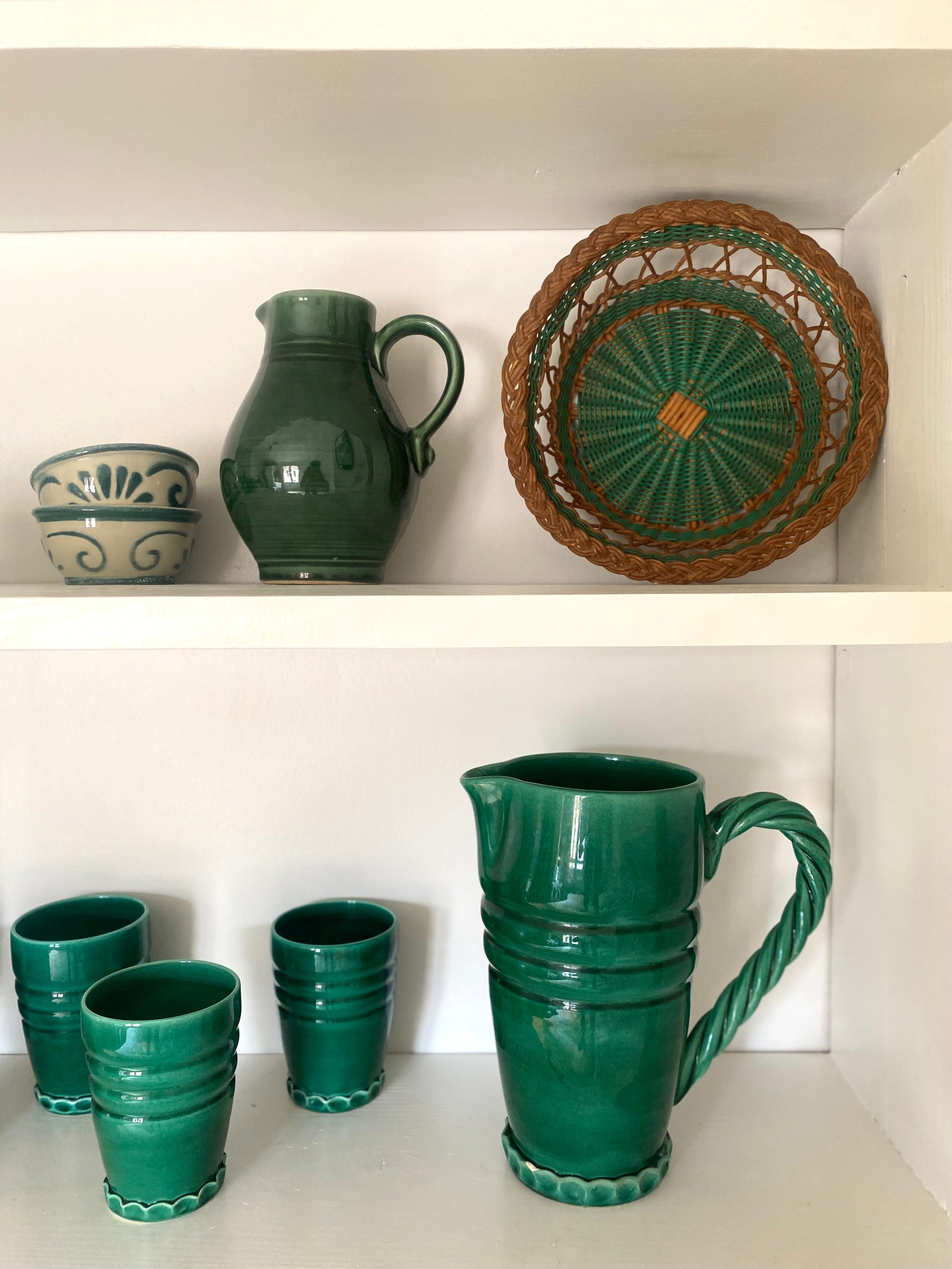 Magnifique service à orangeade en céramique de Vallauris dans un très beau vert profond composé d’un grand pichet et de 7 verres